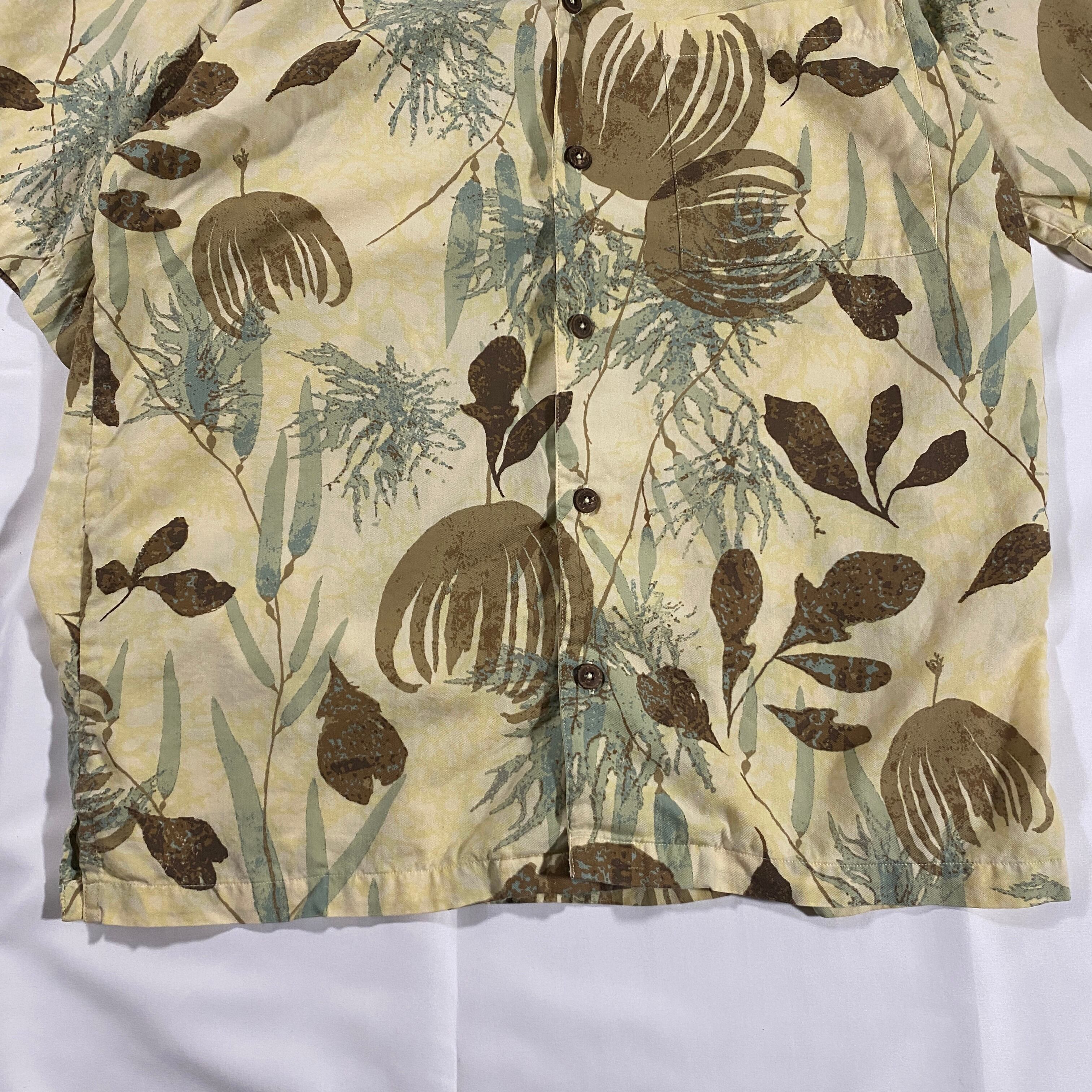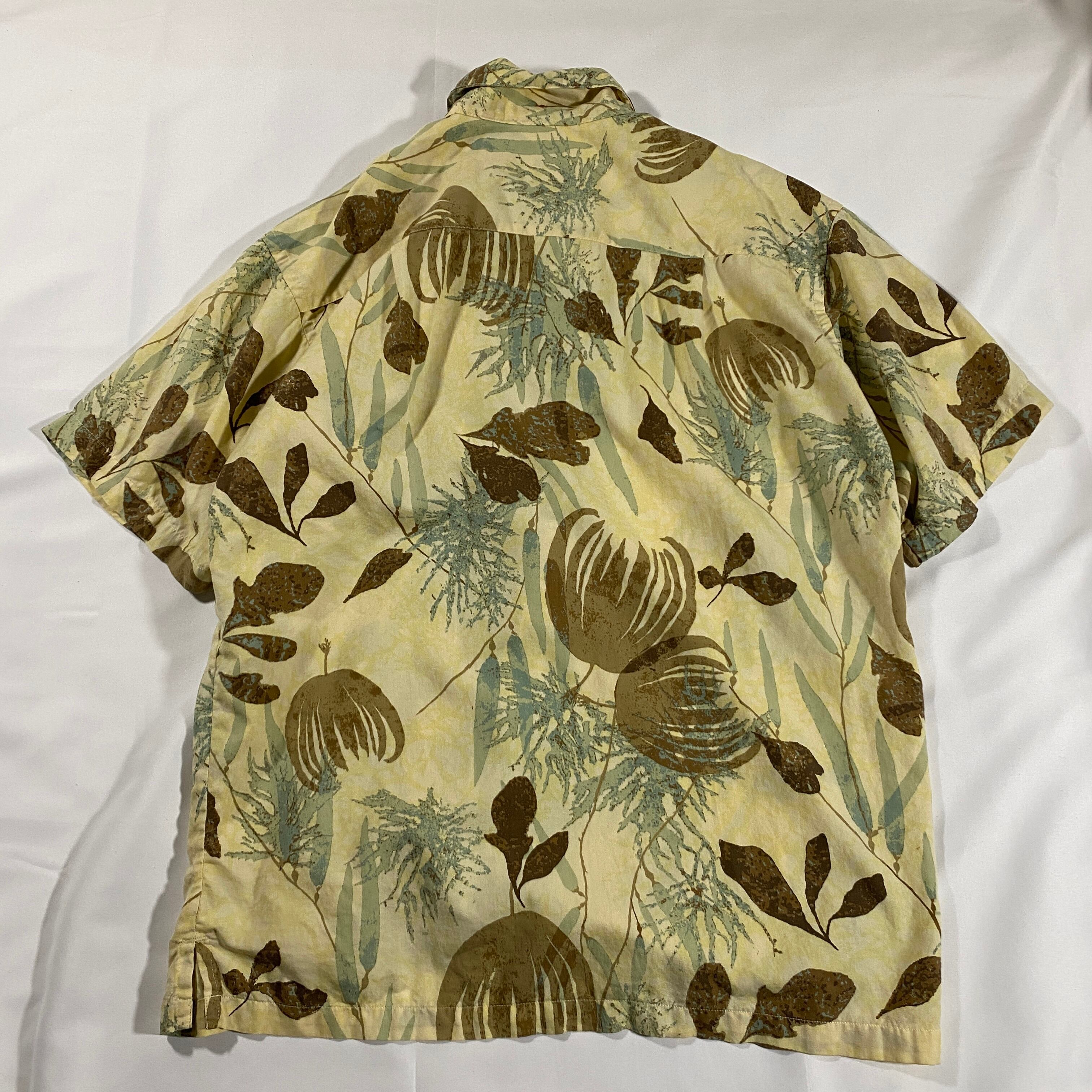 鮮やかなイエロー地にホワイト&グレーの花柄とクラシックなボタニックモチーフが散りばめられたデザイン。夏らしさ全開の一枚で、タウンユースからリゾートスタイルまで幅広く活躍します。ボタンアップ仕様でゆったりとしたシルエット。全体的に味のあるフェード感があり、古着ならではの魅力を引き立てます。
