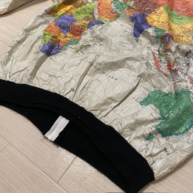 1989年にカート・コバーンが着用していたことで知られる、"Wearin' the World" のタイベック製ワールドマップジャケット。紙のような独特な質感をもつ軽量素材に世界地図がプリントされた、まさに80sヴィンテージらしいアイコニックな一着。両サイドポケット付きで、脇下に小さなリペア跡あり。ユニセックスで着用可能です。