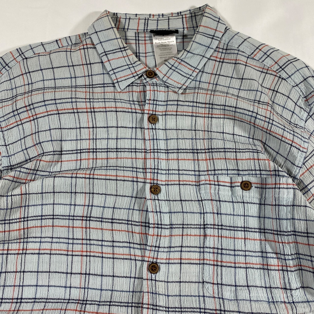 特徴:シアサッカー素材 チェック柄 ウッドボタン仕様 Patagoniaロゴタグ付き