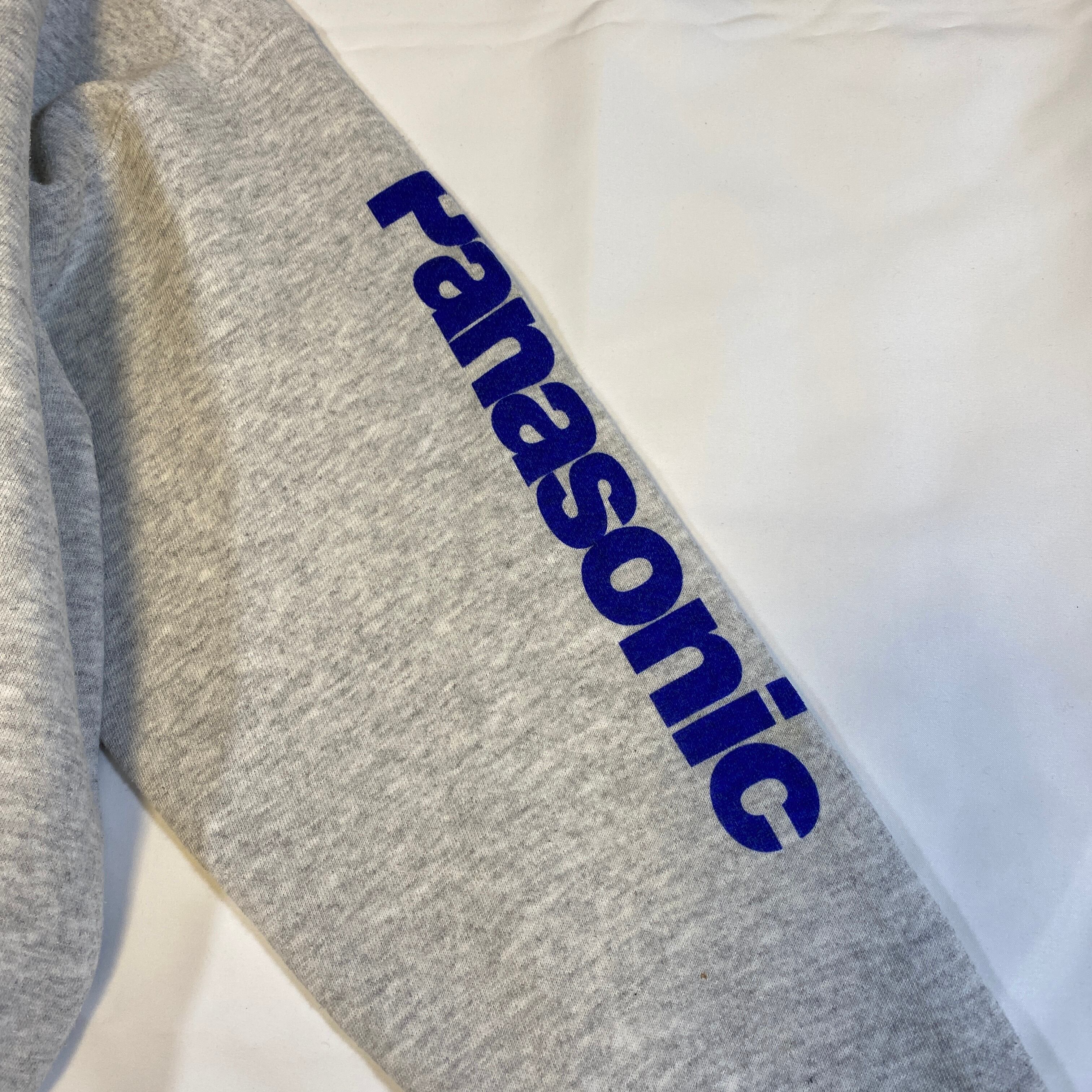 Vintage 1996 USA Olympics Panasonicのスウェットシャツ。Hanes製のヘビーウェイトタグ付きで、ミディアムグレーのカラーに鮮やかなブループリントがアクセント。左胸には「Panasonic Proud Sponsor 1996 U.S. Olympic Team」のロゴ、右袖にも「Panasonic」のプリントが施されています。90年代のストリートスタイルを感じさせるデザインで、オーバーサイズのシルエットが魅力です。