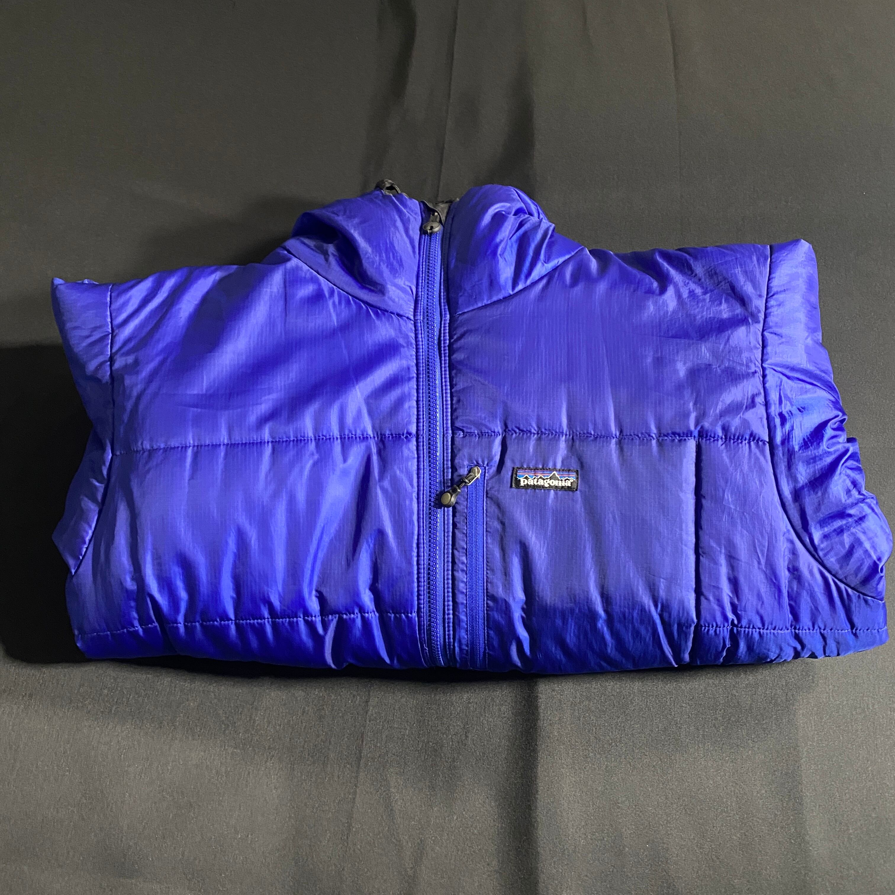 04年のPatagonia製中綿ジャケット、タイ製の希少モデル。STY84097の型番を持ち、バツグンの発色が魅力。鮮やかな青紫とブラックの裏地がクールなコントラストを演出。ダウンではなく中綿仕様のため、ロングシーズン活躍できる一枚。フード一体型で街でも山でもサマになる、頼れる万能アウターです。