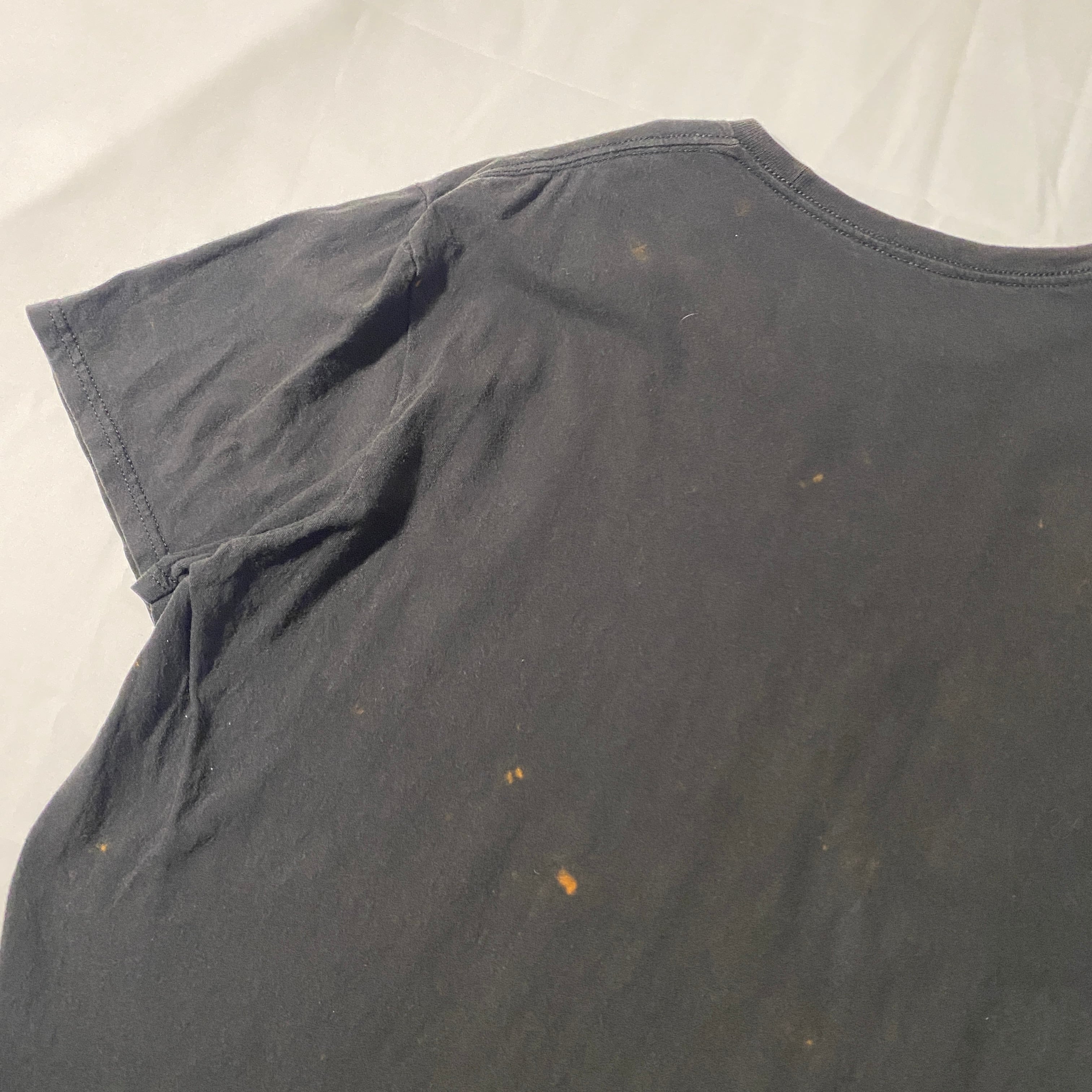 全体にヴィンテージらしい褪色が見られ、前後や袖に小さなブリーチ痕・色抜けがあります。これらはアーティストTシャツ特有の風合いを強調し、個体差のある一点物としての魅力を際立たせています。着用・洗濯には問題ありません。