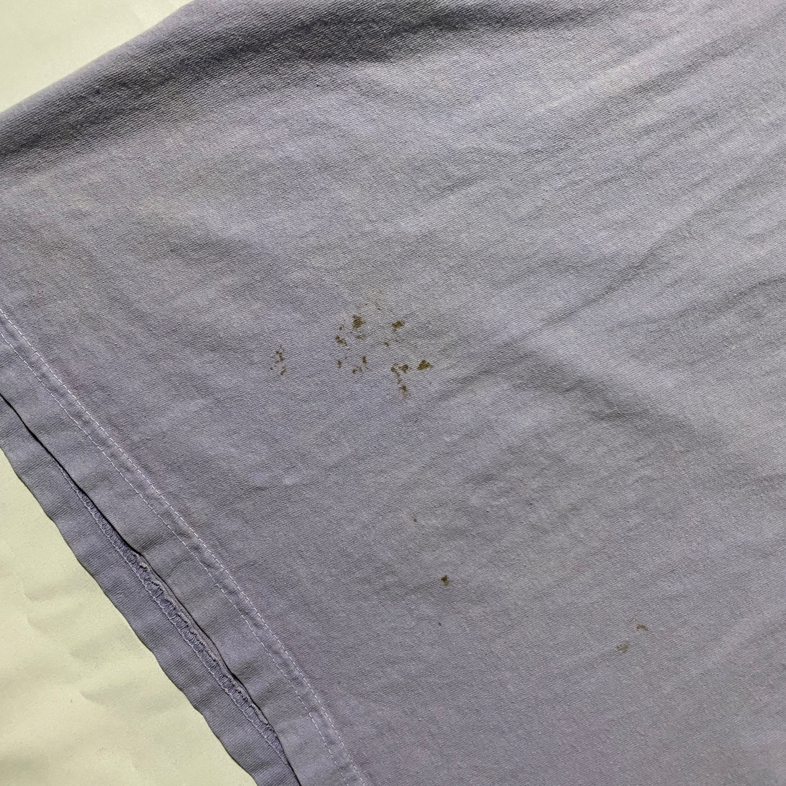 全体的に柔らかくフェードがかかった優しい風合い。フロントや袖に小さな点状の薄汚れあり。ヴィンテージの魅力として自然に溶け込む程度です。生地のヨレや破れはなく、しっかりとしたオーガニックコットンの質感を保っています。