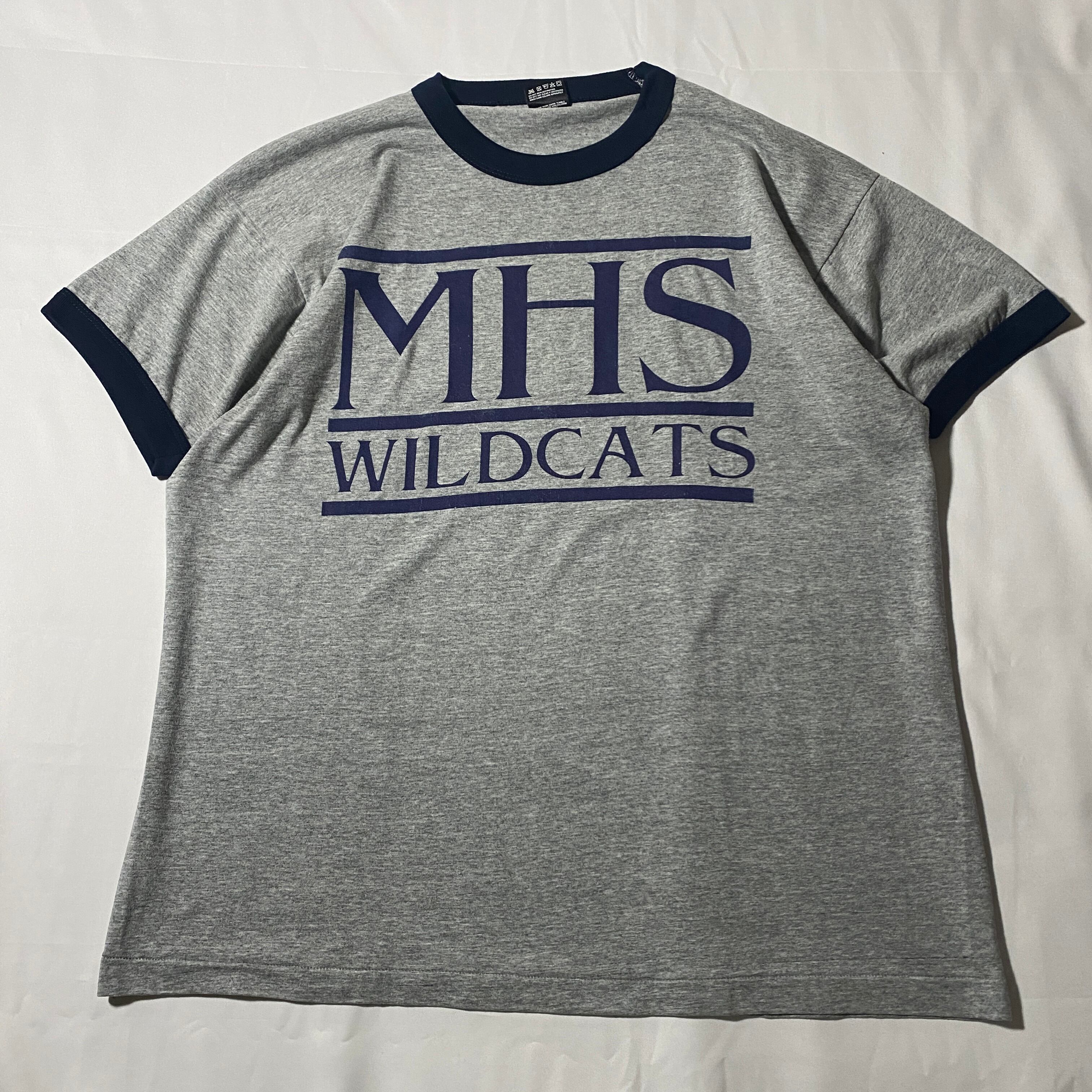 アメリカのとある高校「MHS(おそらく“Madison”系)」のスクールTシャツ。ワイルドキャッツ=山猫の愛称が力強く、アメフトやチアなどの部活応援でも使われていそうな雰囲気満点。ベーシックなリンガーTに大胆なブロックレターが映える、スクール系ヴィンテージ好きにおすすめの一枚。