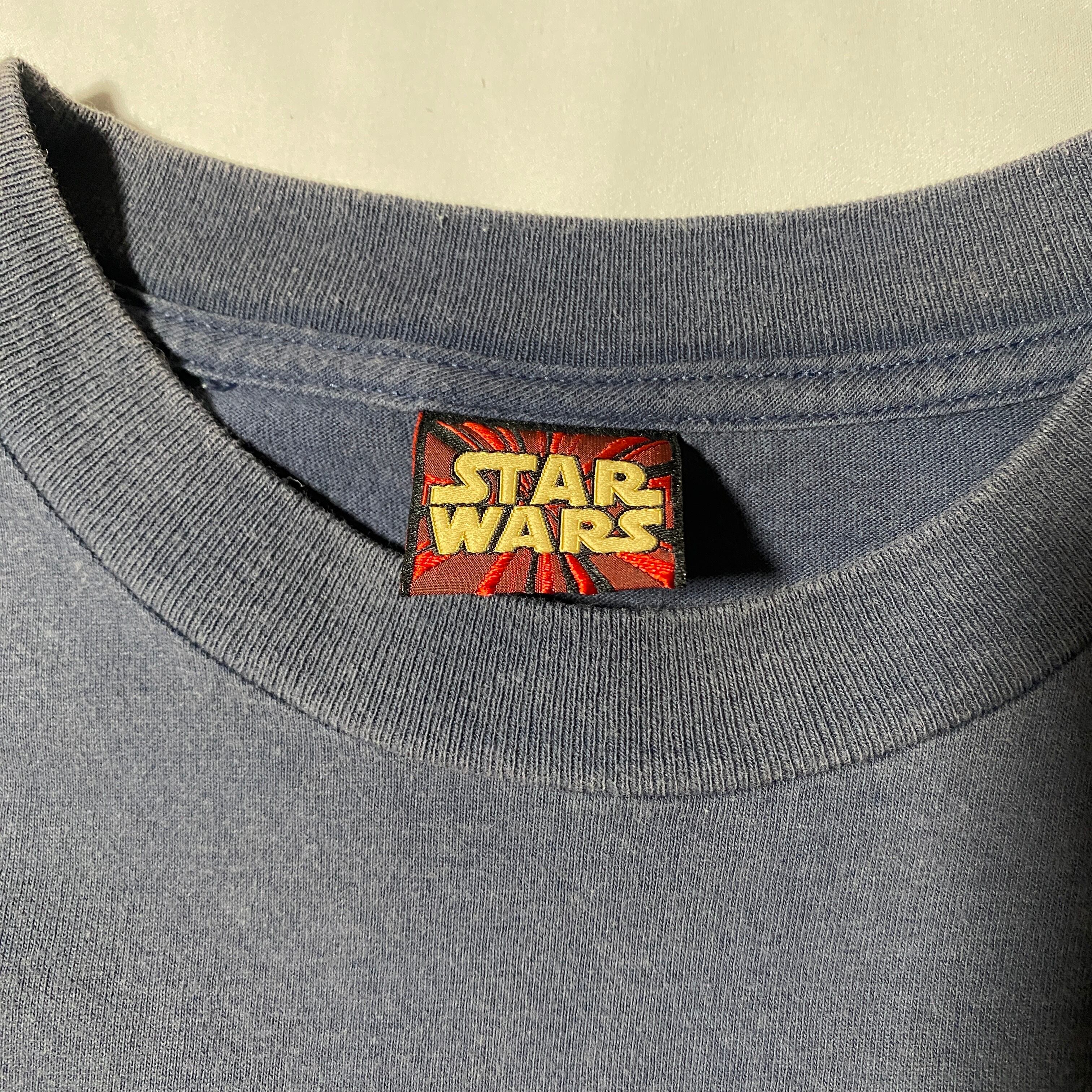 1999年公開の「スター・ウォーズ エピソード1/ファントム・メナス」より、若きアナキン・スカイウォーカーが中央に大きくプリントされたファン垂涎の一枚。オビ=ワン、クワイ=ガン、パドメ、ヨーダなど主要キャラクターが並び、映画ポスターのような迫力あるデザイン。銀河の運命を背負った少年の旅立ちを、胸元で語る名作Tシャツです。