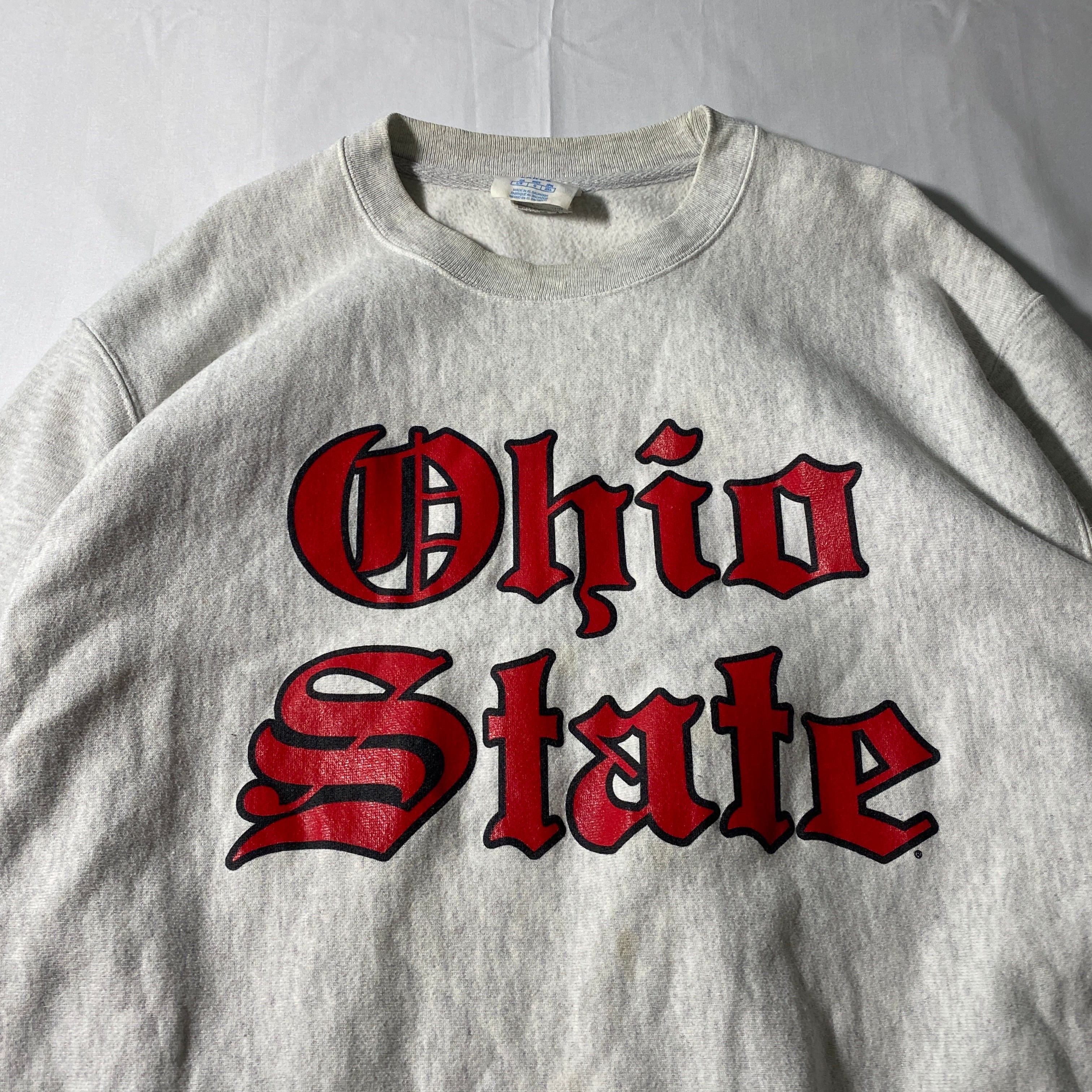 チャンピオンの名作、リバースウィーブボディに「Ohio State」ロゴを大胆にプリントした一着。カレッジスウェットの王道スタイルながら、ゴシック調のレタリングと深みのあるレッドプリントが唯一無二の存在感を放つ。アメカジはもちろん、ワイドパンツやスラックス合わせでストリートにも映える万能アイテムです。