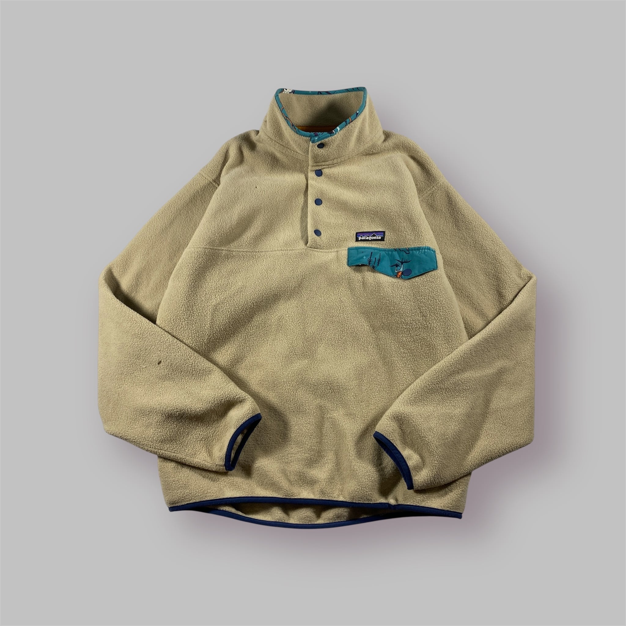 パタゴニアの名作、シンチラフリースのハーフスナップモデル。クリームボディにブルーのポケット&スナップが映える配色で、アウトドアでもタウンでも抜群の存在感。軽量かつ保温性に優れ、肌寒い季節のお供に最適です。90s〜Y2Kスタイルにもマッチする一着で、古着好きからアウトドア派まで幅広くおすすめ。