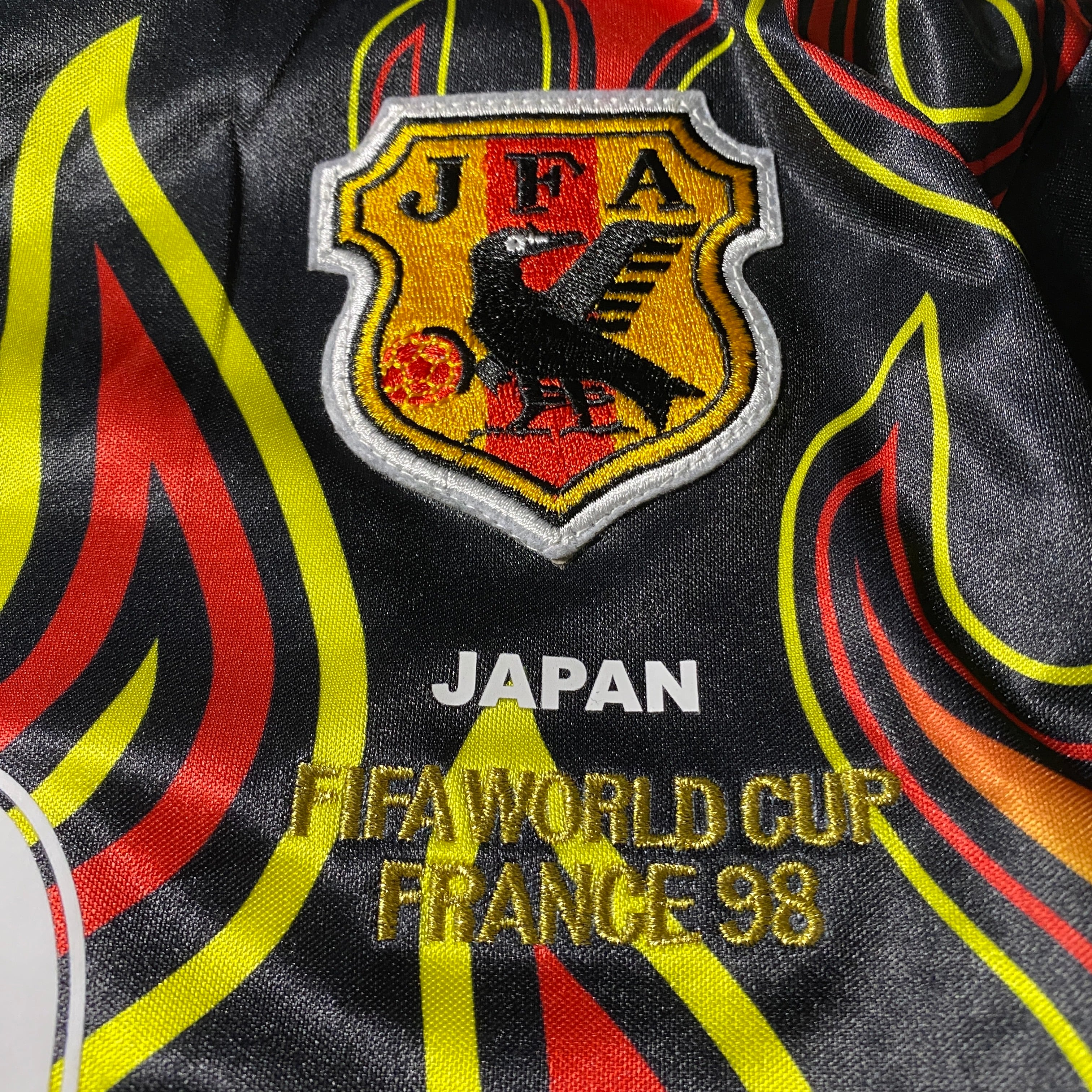 1998年フランスW杯で日本代表GK川口能活が着用した炎柄デザインの長袖ゴールキーパージャージ。アシックス製ならではの90sサッカーウェア特有のビビッドな発色と、大胆なフレイムグラフィックが魅力の一枚。日本代表初のW杯出場を記念する希少なユニフォームで、コレクション用途にもおすすめです。サッカーファンはもちろん、90sリバイバルのストリートスタイルにも映えるアイテム。