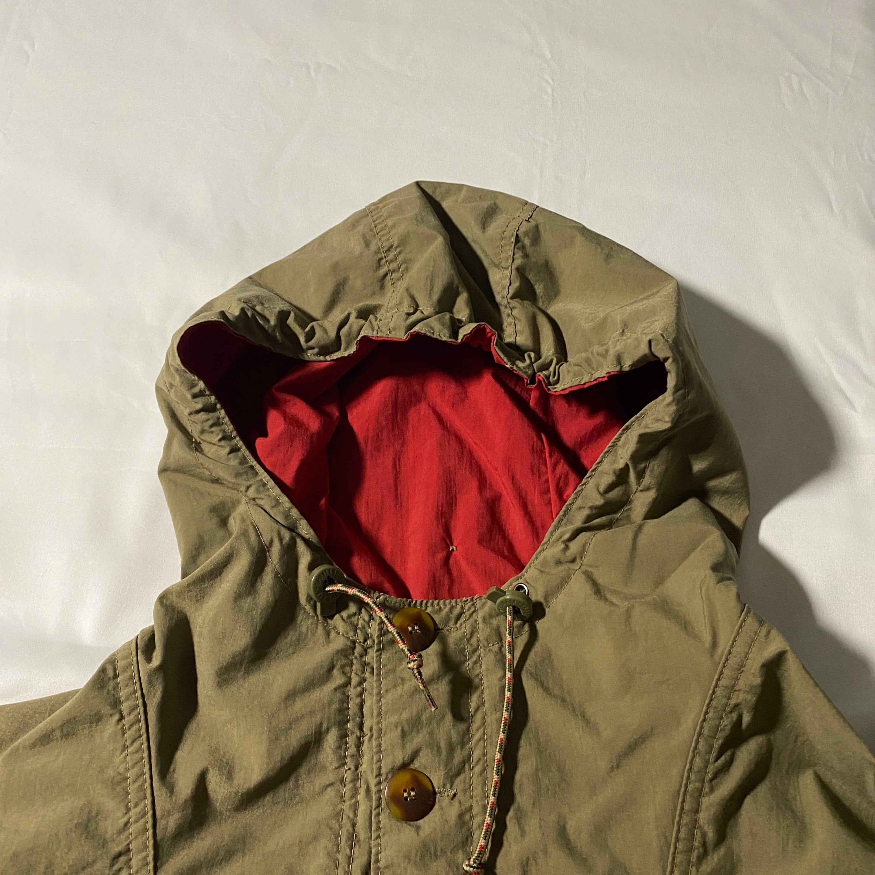 1990年代〜2000年代初期に製造されたColumbiaのアノラックパーカー。深みのあるオリーブグリーンにフード裏のレッドがアクセントとなり、当時らしいアウトドアMIXの雰囲気を演出します。プルオーバータイプの軽量設計で、タウンユースはもちろん、キャンプやフェスのレイヤードスタイルにも相性抜群。ヴィンテージ好きにおすすめの一着です。