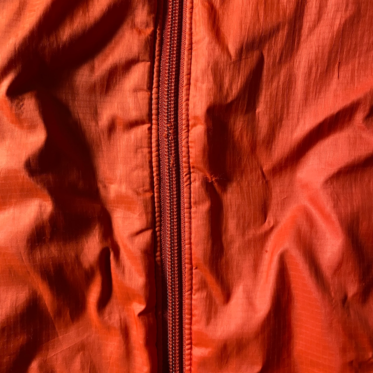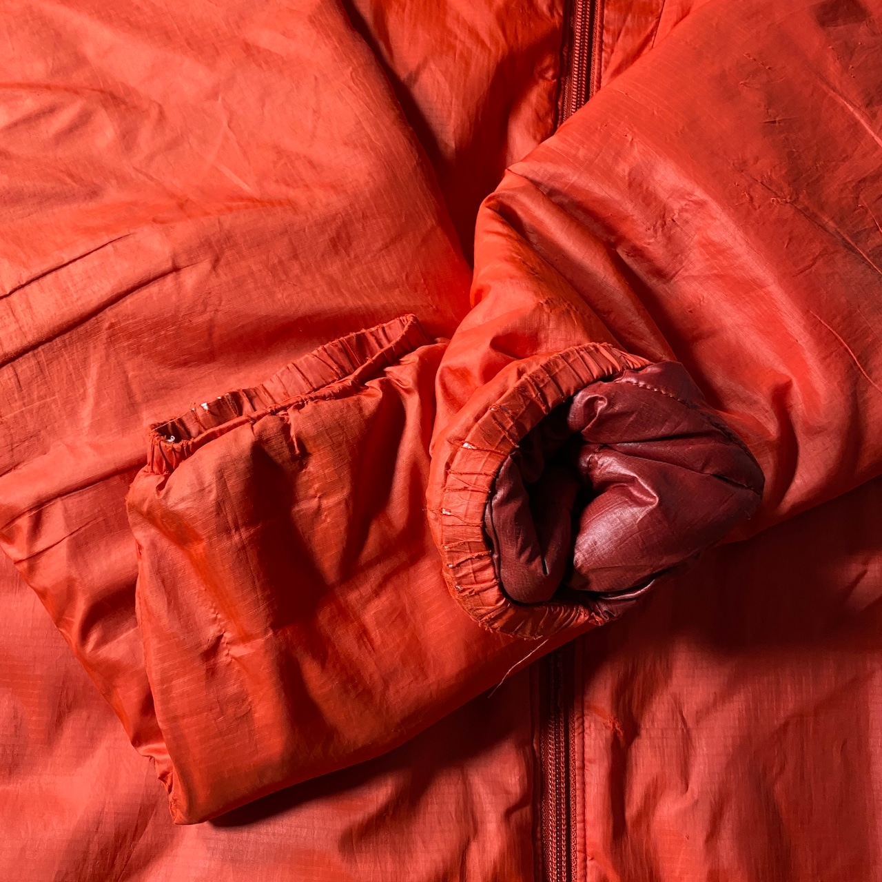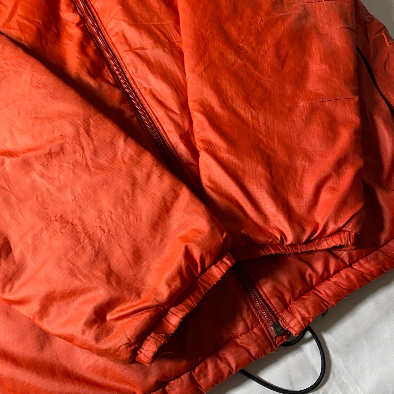 一部リペア、パーツ交換済み。全体に自然な使用感あり。袖や胴部に小さなリペア跡、軽い擦れが見られますが、ヴィンテージ特有の雰囲気をプラス。ナイロンシェルの光沢と発色がまだしっかり残り、アウトドアにもタウンユースにも映える一着です。