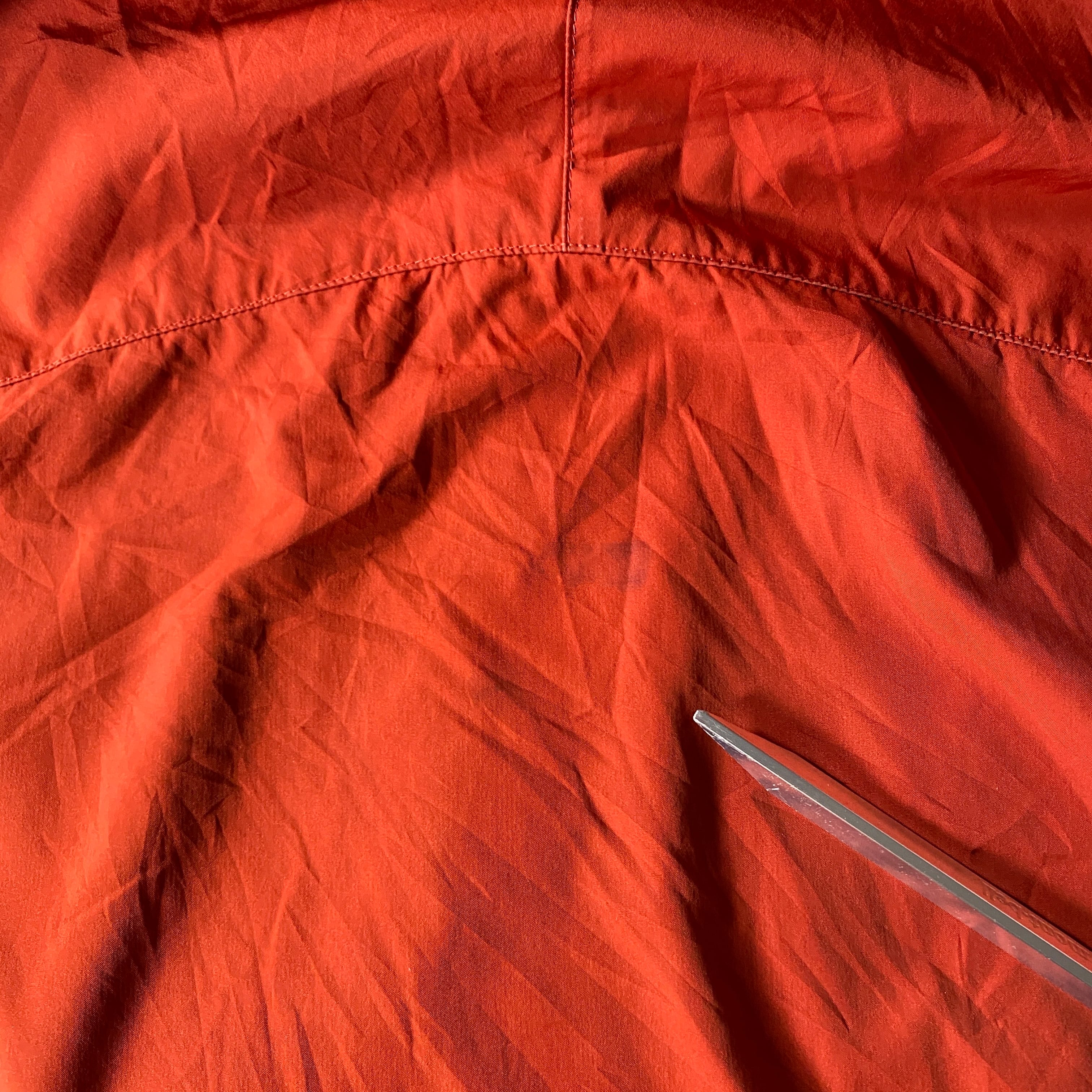 ところどころに取りきれない、色落ちした汚れがあります。袖口や裾周辺に破れ、擦れと使用感は見られますが、ジップ、ベルクロ、ドローコードなどの機能部分も問題なく使用可能です。細かいコンディションについては