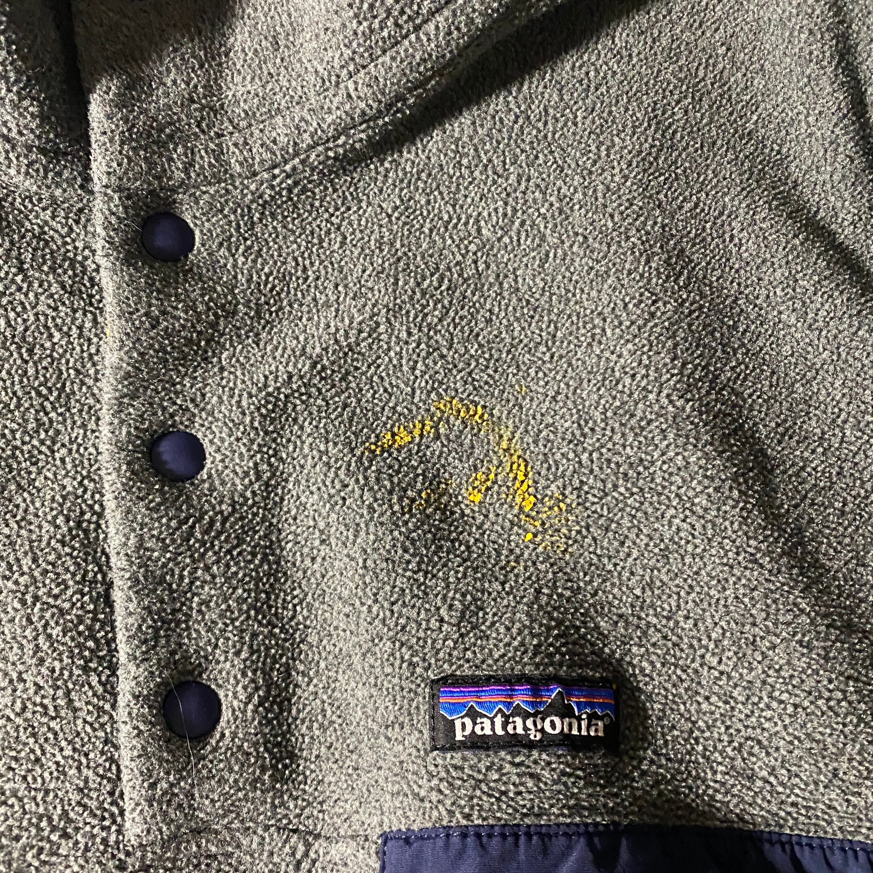 2016年製、パタゴニア定番のシンチラ・スナップT。保温性と軽さのバランスに優れたフリース素材に、スナップボタンと胸ポケットという完成されたデザインはアウトドアからタウンユースまで幅広く対応します。本個体はグレーボディにネイビーの切り替えが効いた落ち着いた配色で、そこにペンキ跡が加わることで無機質になりすぎない唯一無二の存在感を演出。クライミングやDIYの現場を思わせる痕跡は、量産品にはないストーリー性として楽しめる一着です。