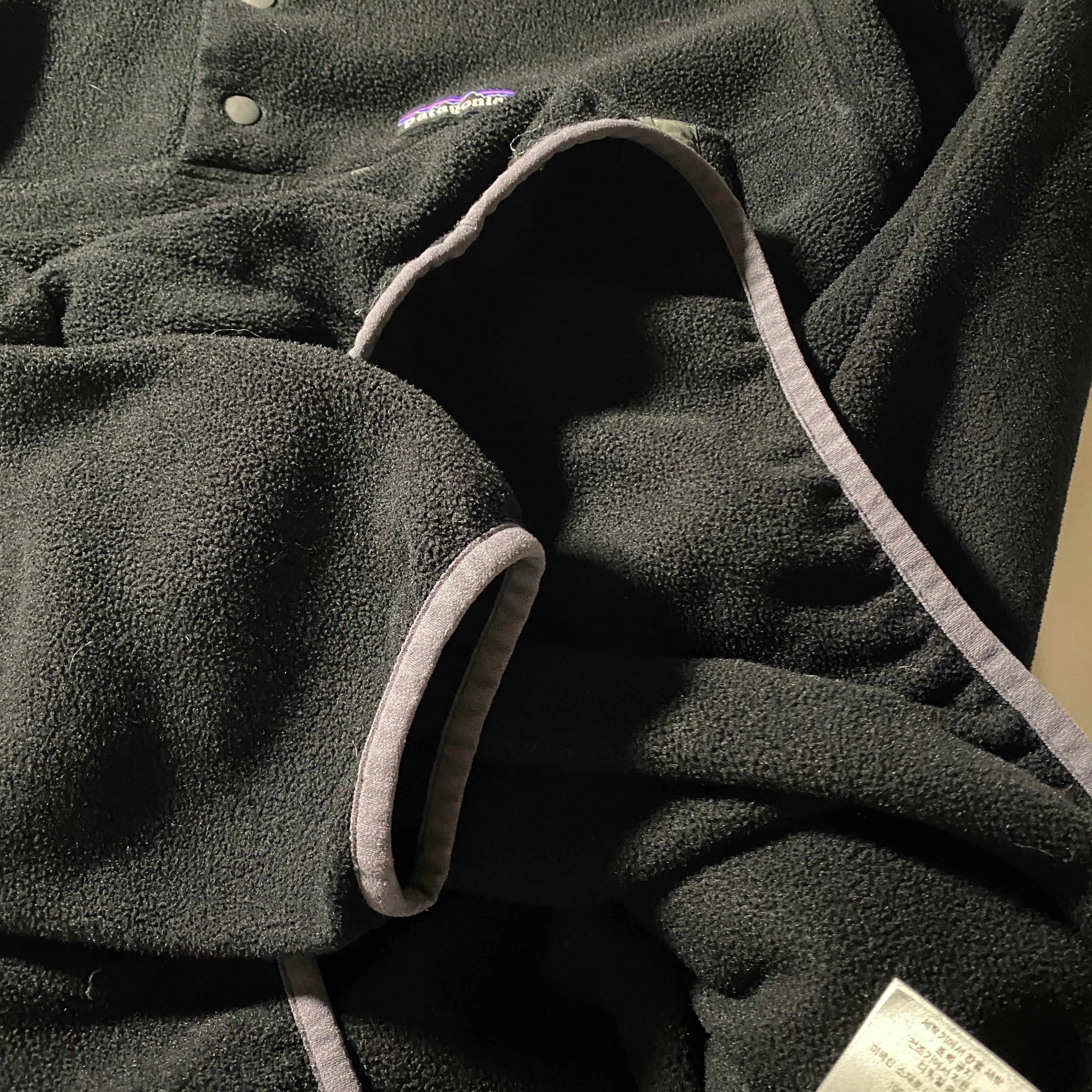 全体的に使用感は控えめで、フリースの潰れは少なく良好なコンディションです。左袖に企業名と思われる刺繍が施されており、通常個体にはない一点物のディテールとして存在感があります。袖口や裾のパイピングに軽微なスレが見られますが、着用には支障のない範囲です。スナップボタンの欠損や破損はありません。