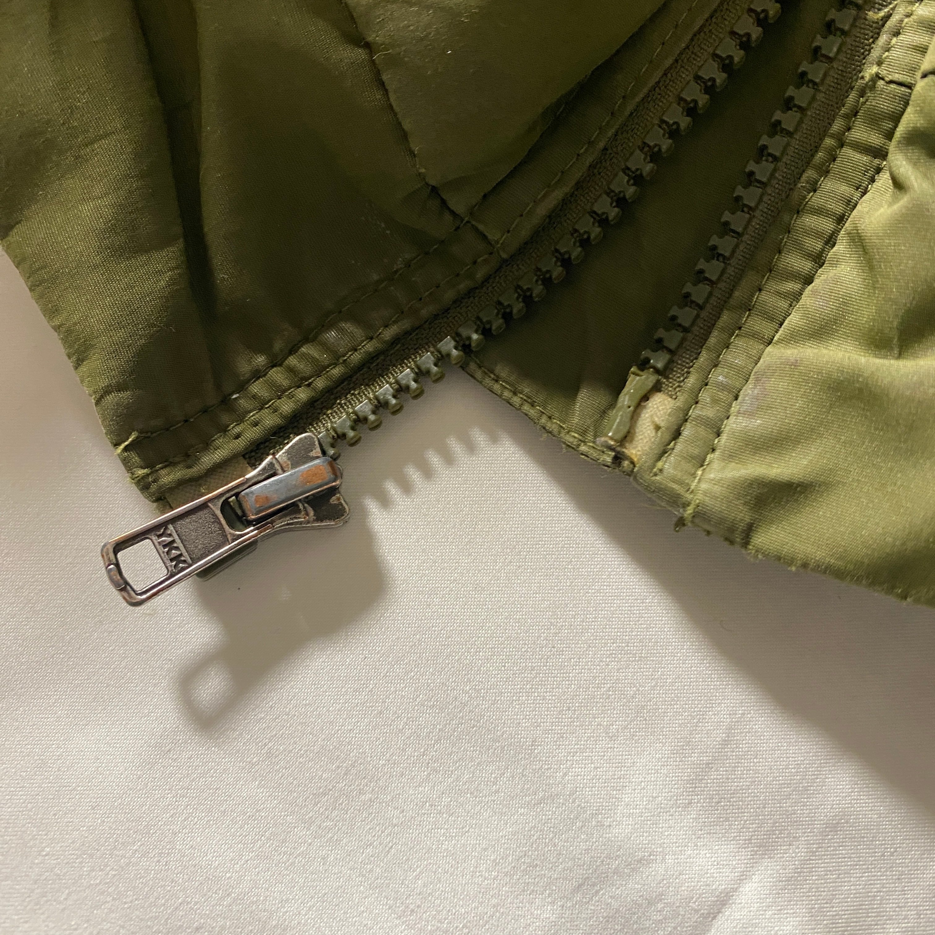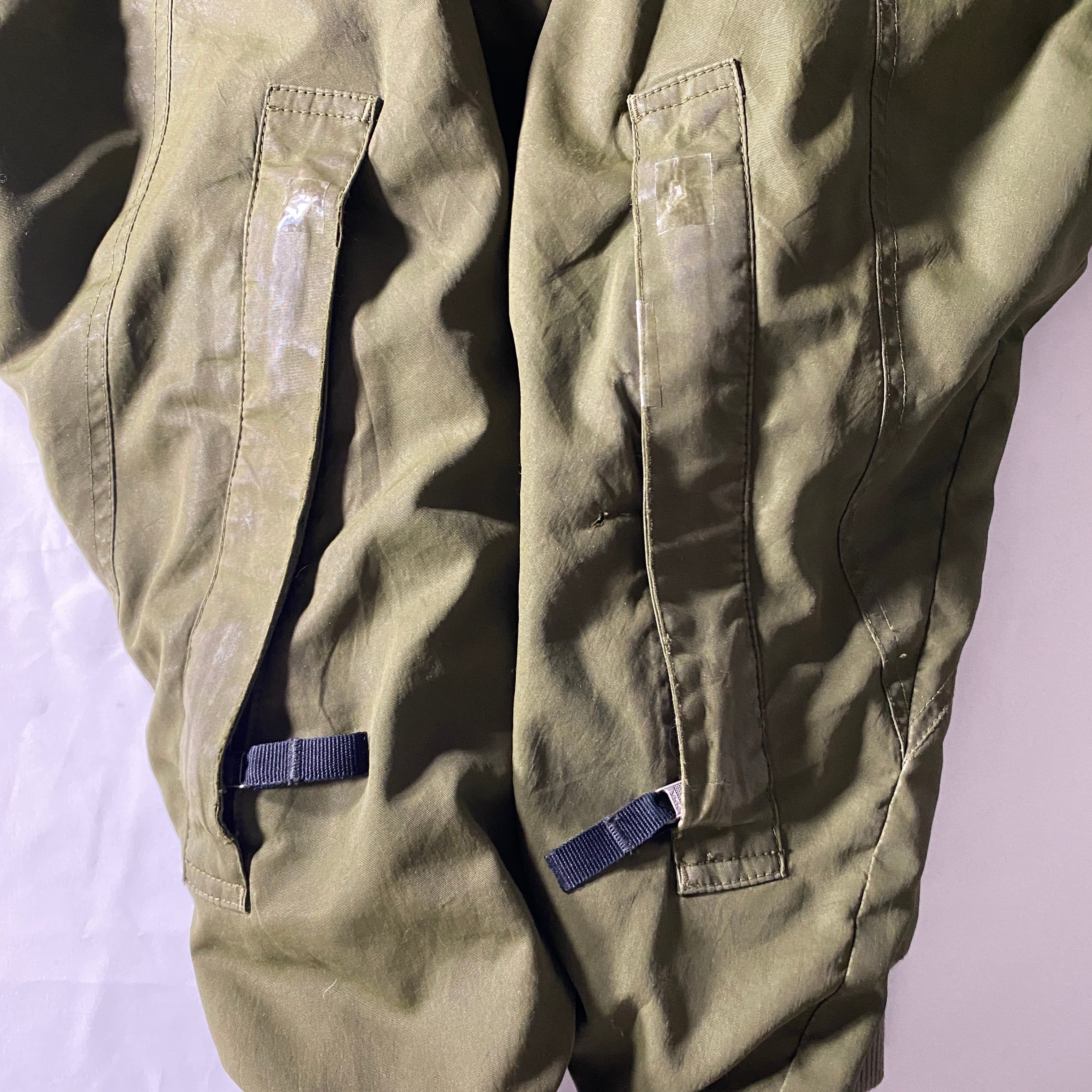 全体的に擦れや小キズが見られ着用に伴う使用感がありますが、雰囲気として馴染んでいます。左胸に火による小さなピンホールがありますが目立ちにくい位置です。袖内側は補強のためリペアされており、実用面では安心して着用可能です。古着慣れしていない方はお控えください。
