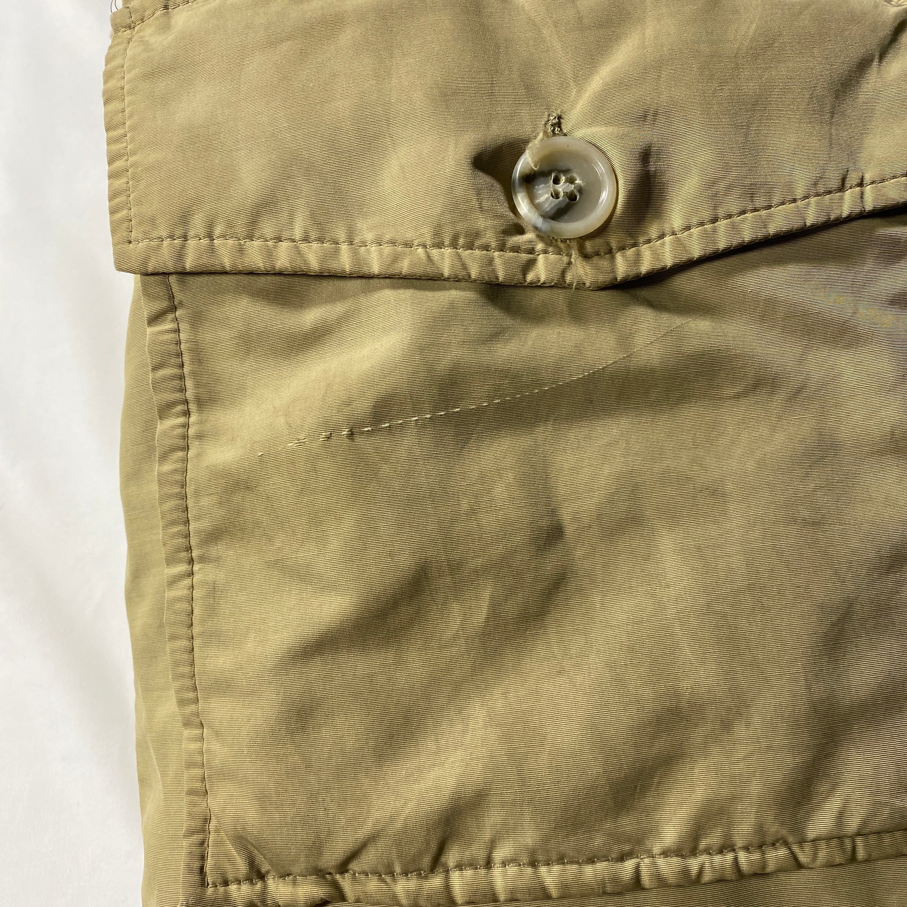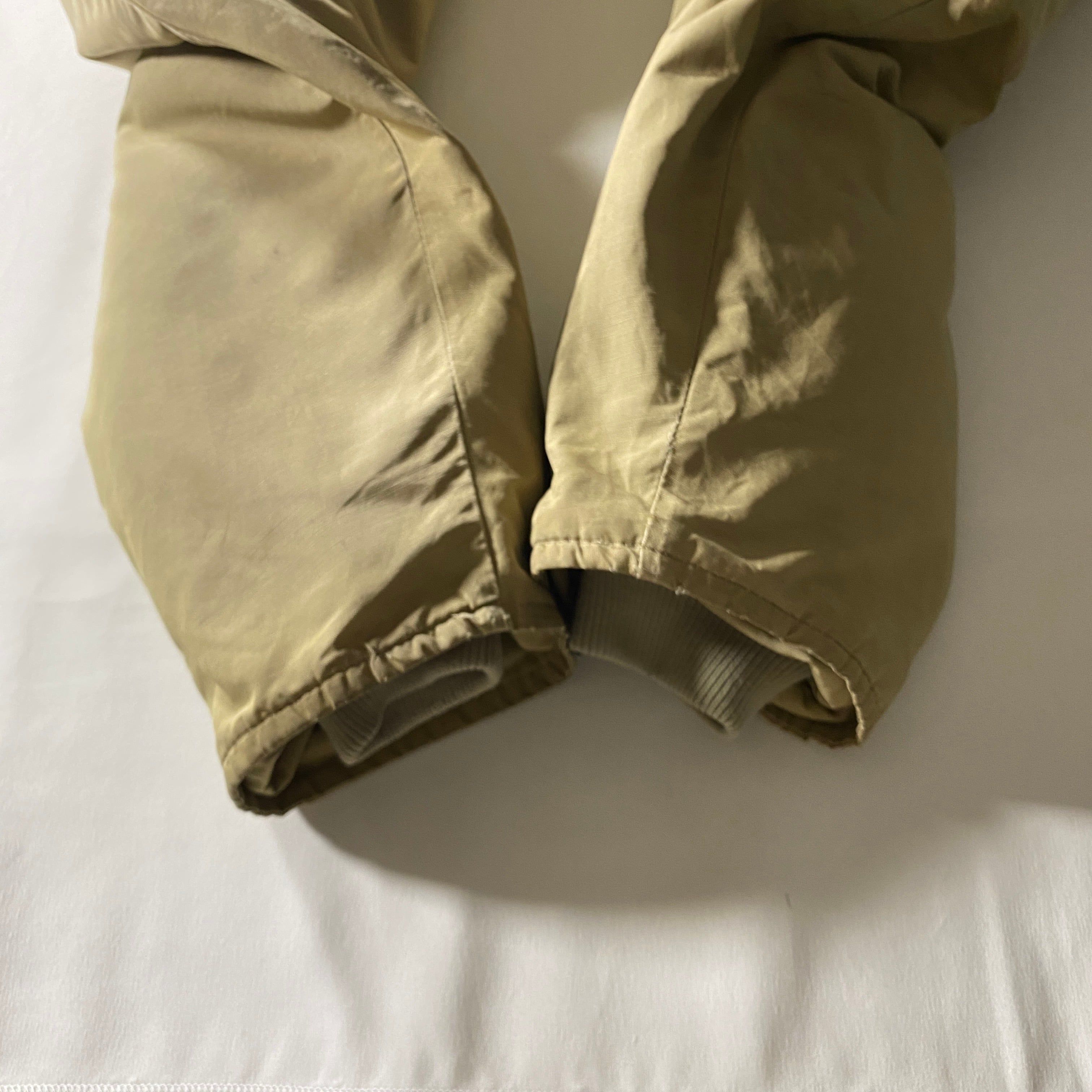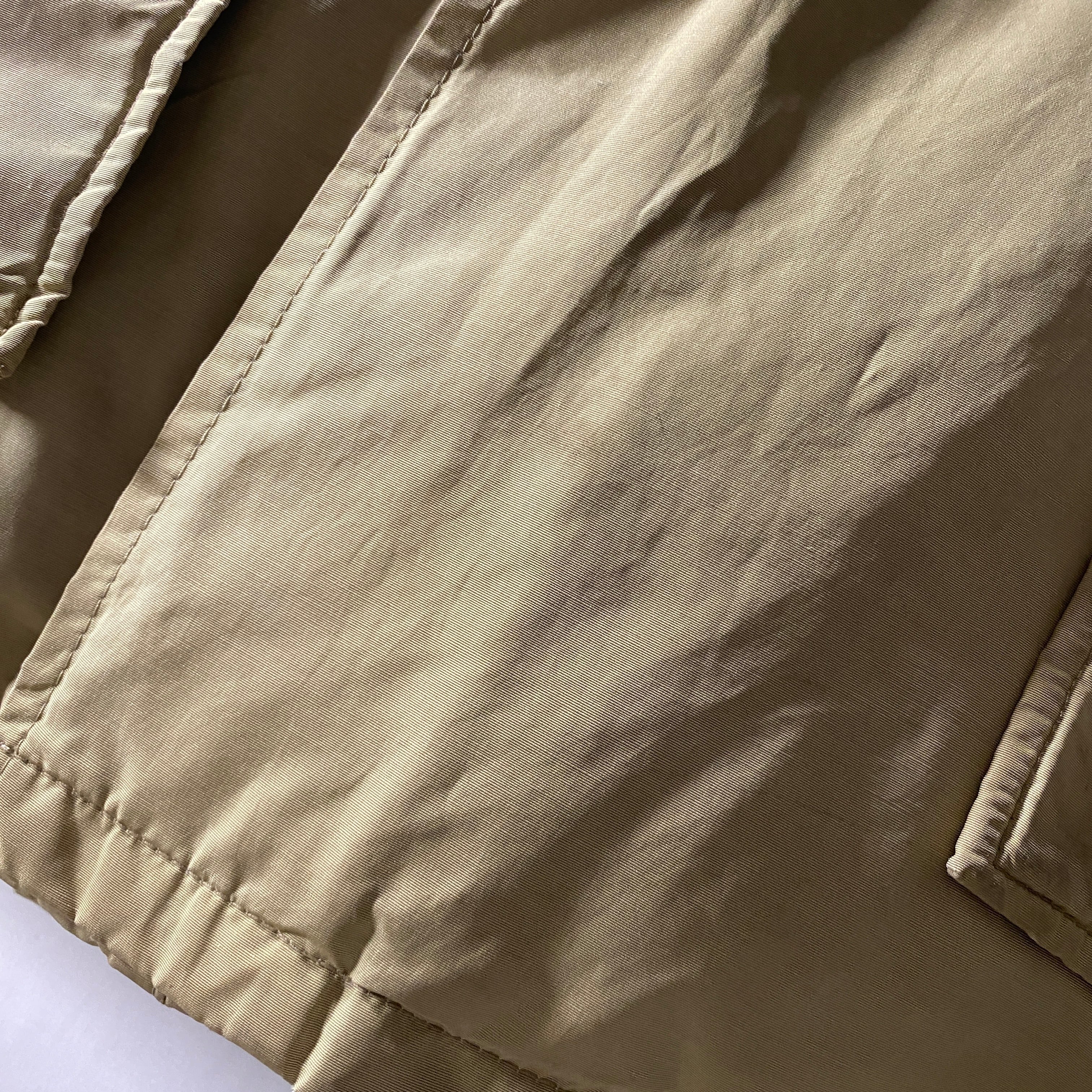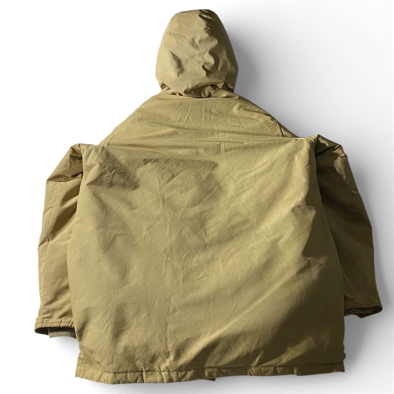 全体に着用に伴う細かなキズや使用感と薄汚れが見られますが、生地のハリは保たれており雰囲気良好です。フード周りのファーは取り外されており、ミニマルで合わせやすい印象。大きなダメージはなく、ヴィンテージらしい風合いとしてお楽しみいただけるコンディションです。