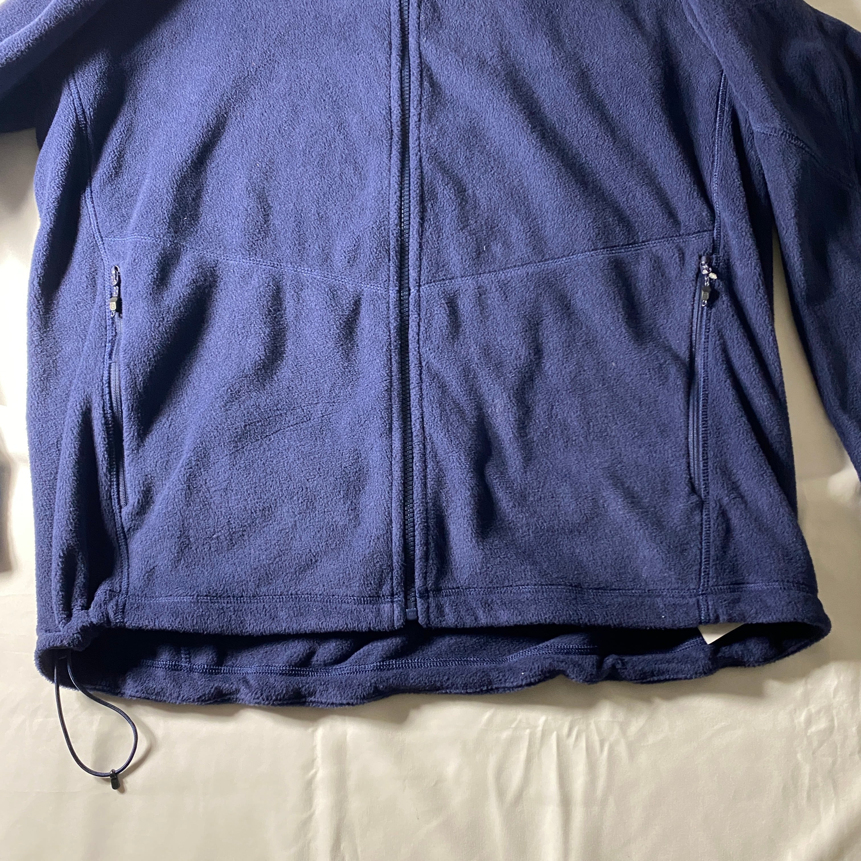 全体的に使用感は控えめで、フリースの潰れは少なくふんわり感を保っています。袖口・裾周りに軽度の毛羽立ちあり。裾ドローコードとストッパーは正常に機能しています。ジップの動作はスムーズで、目立つ破れや致命的なダメージは確認できません。