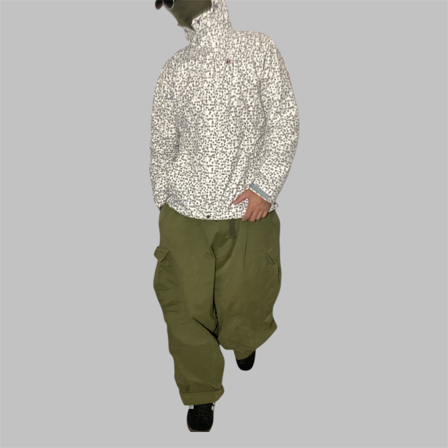 2000年代のBerghausらしいAQ2メンブレンを採用したウィメンズレインジャケット。高密度ナイロンシェルに防水透湿コーティングを施し、雨風を確実に遮断する実用性重視の一着です。細かなドットを散らした総柄デザインは当時のUKアウトドアらしい実験的な配色で、街中ではまず被らない存在感。フェスやキャンプ、悪天候下での移動にも安心して投入できます。メンズ視点ではL体型にはややコンパクトなため、M以下の方や細身シルエットで着たい方におすすめ。パタゴニアで言うトレントシェル系統の立ち位置ながら、よりUKらしい無骨さと柄の遊びが効いた一枚です。