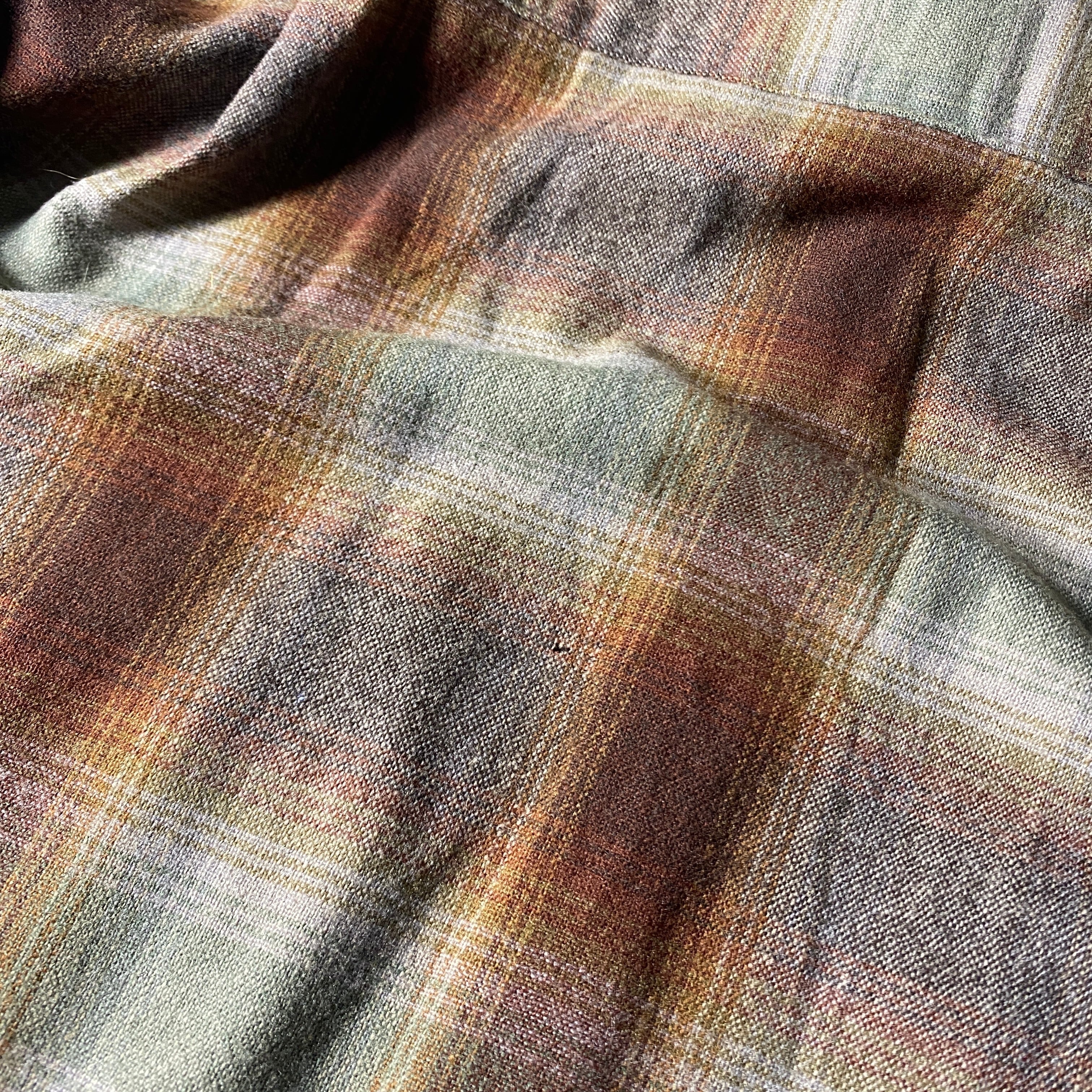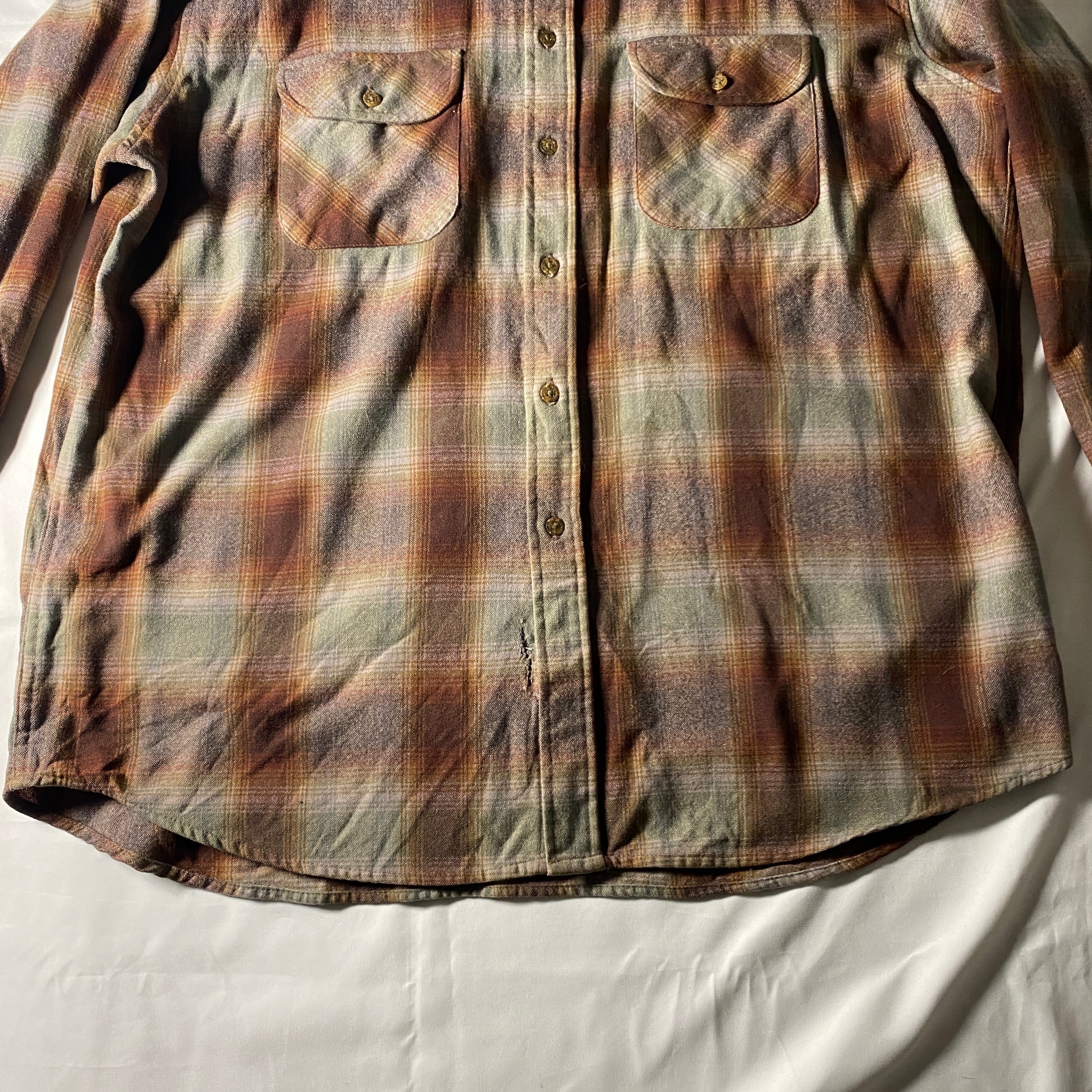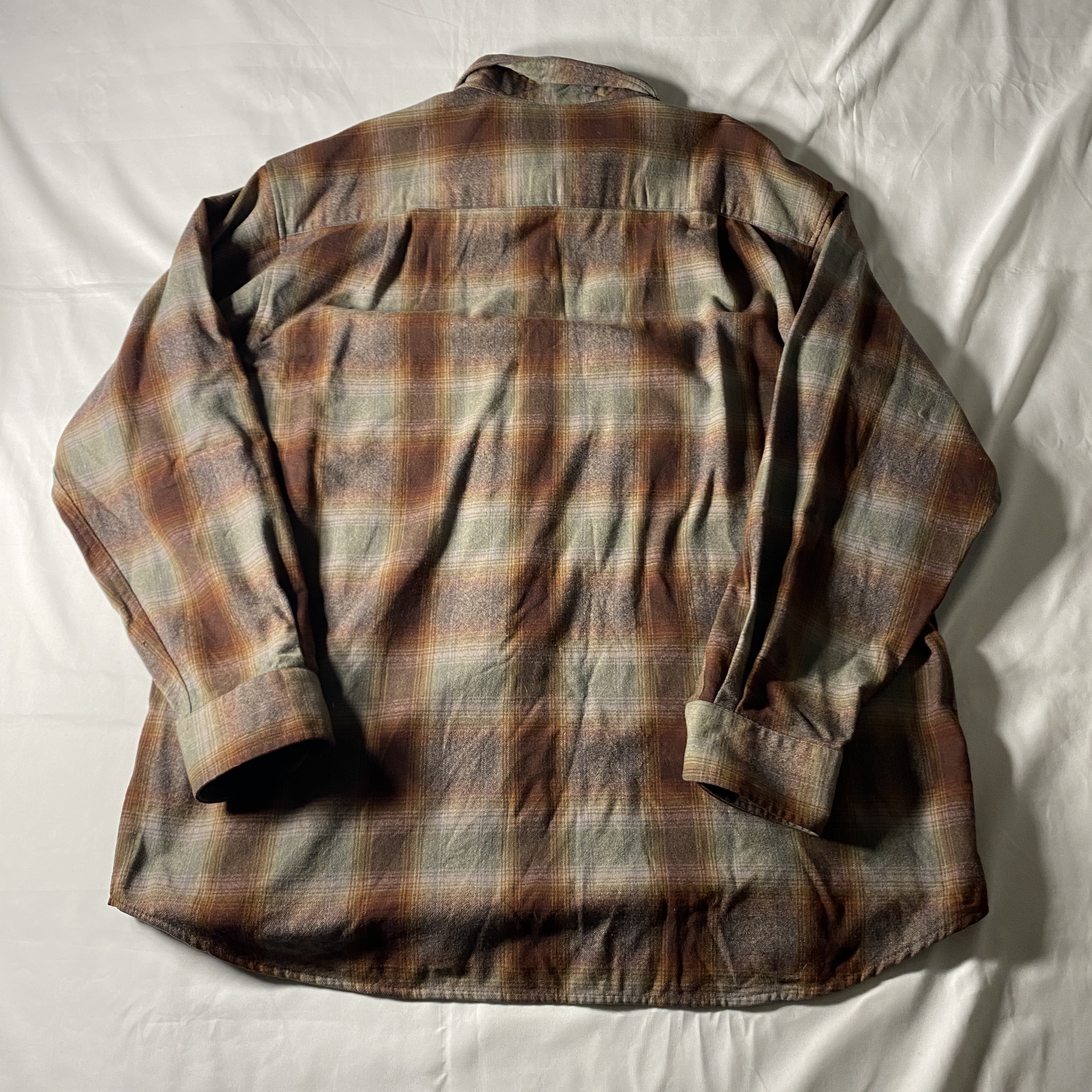2000年代のPendletonが展開していたEco Wise Woolシリーズのチェックシャツ。再生ウールを用い、環境負荷を抑えた製法で作られたラインで、Pendletonらしい上質なウールの質感はそのままに、日常使いしやすい設計が特徴です。厚すぎないウール生地はシャツとしても軽いアウター感覚でも使え、秋冬のレイヤリングに柔軟に対応。裾のリペアや細かなダメージはありますが、それも含めて“リアルに着込まれてきたウールシャツ”ならではの説得力があり、無骨なチェック柄と相まって雰囲気のある一枚に仕上がっています。ビッグサイズを活かしたラフな着こなしにもおすすめです。