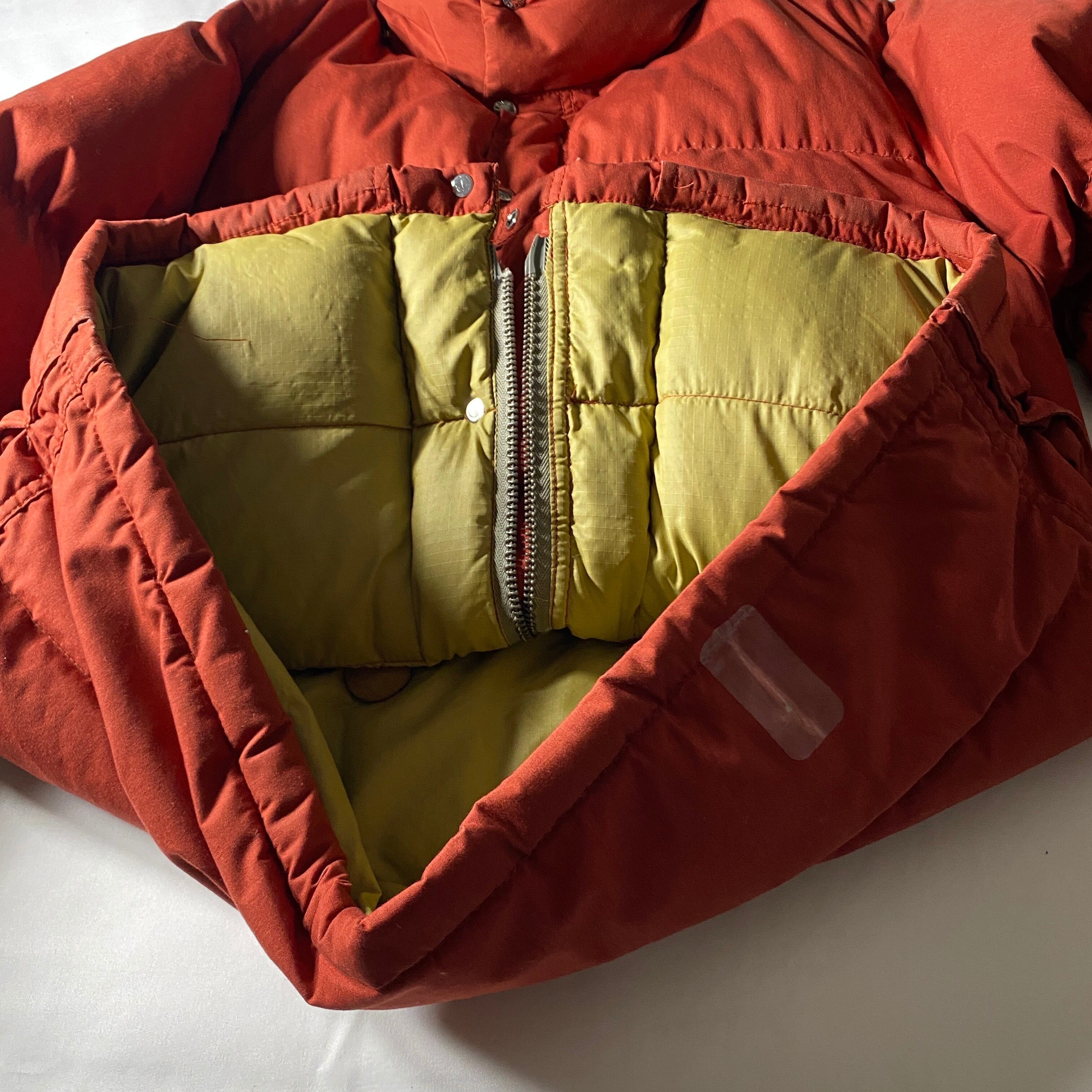 1970年代後半から80年代初頭にかけて生産された通称茶タグ期のTHE NORTH FACEダウンジャケットで、MADE IN USA表記が残るオリジナルヴィンテージ。クラシックなボックスシルエットに大きめのフラップポケット、当時らしい肉厚なダウン量が特徴で、現行品にはない無骨さと温もりを感じさせます。ジッパーは要メンテナンスですが、その分ベースとしての素材感と雰囲気は抜群で、修理して長く付き合う前提で選びたい一着。アウトドア黎明期の空気を纏いながら、街でも主役級の存在感を放つヴィンテージダウンです。