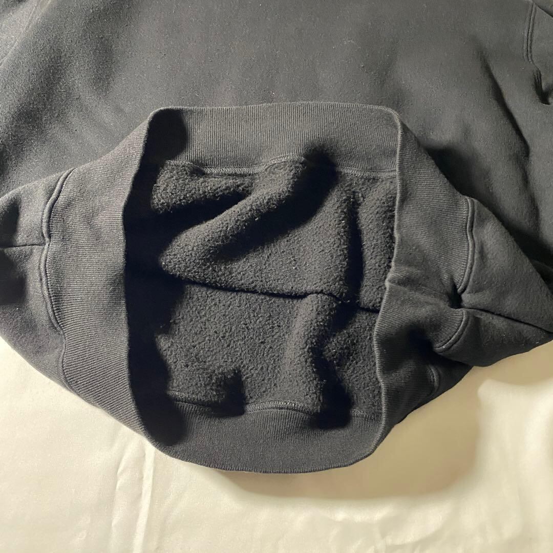 ロサンゼルスアパレルのサンプルモデルとして製作された、極厚仕様のヘビーウェイトスウェット。XS表記ながら実寸はL相当で、現代的なリラックスシルエットを形成します。Supremeが採用するカナダ製スウェットブランド House of Blanks に近い、密度の高いコットンボディと肉厚フリース裏地の組み合わせが特徴。肩から脇下にかけて余裕を持たせた広めのカマ底設計により、可動域も非常に良好です。ミニマルでシックなブラックカラーは素材の良さを際立たせ、無地スウェットで差をつけたい方にこそおすすめできる一着です。