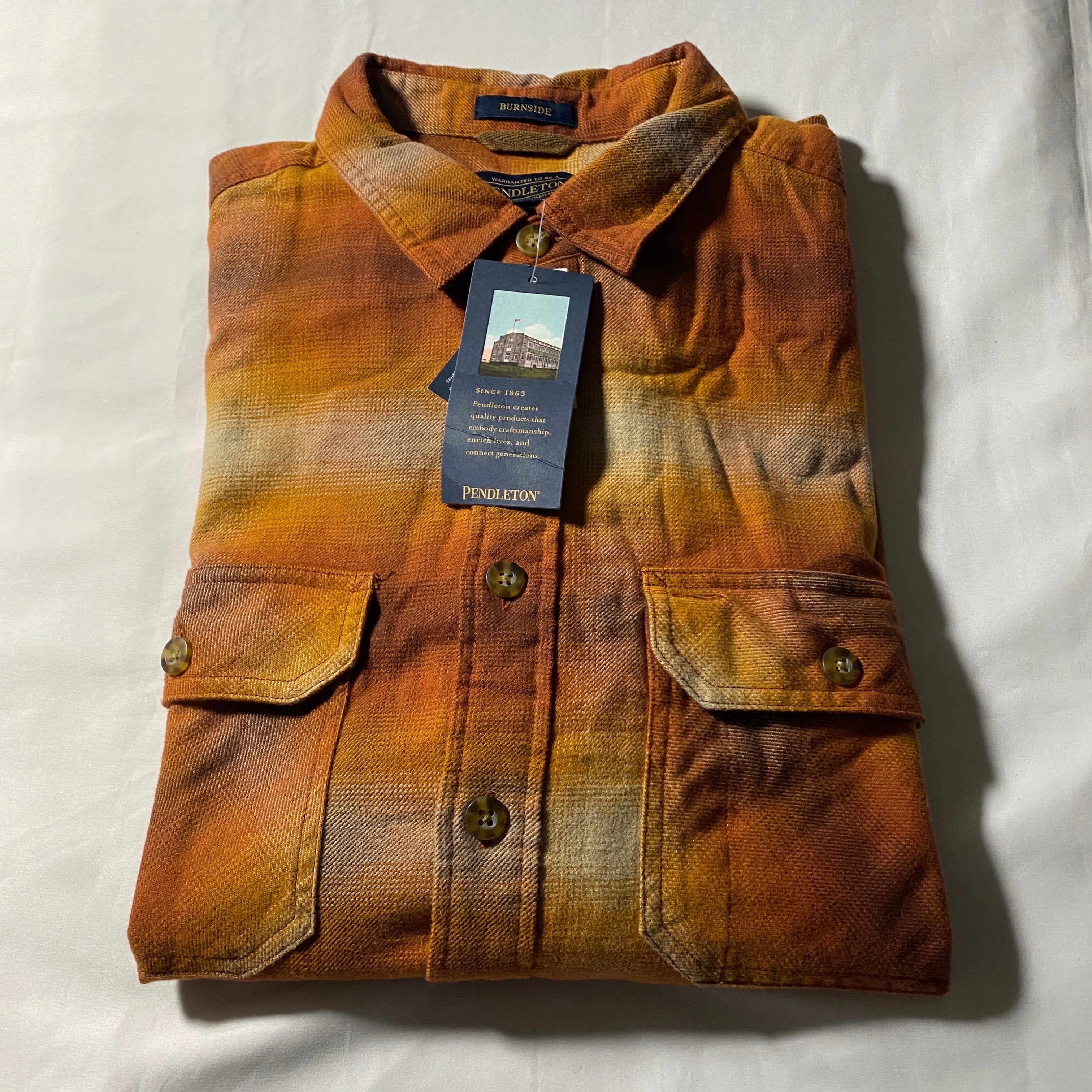 ペンドルトンの中でもタウンユースを意識したBurnsideラインのオンブレチェックシャツ。伝統的なウールシャツの文脈を踏まえつつ、こちらは軽やかなコットンベースで構成され、ヴィンテージの配色美だけを現代的に抽出した一枚です。ブラウン〜オレンジ〜イエローが溶け合うグラデーションは、50sウエスタンや70sカウンターカルチャーを連想させつつ、シルエットは今の空気感にフィット。大きめのXLサイズはシャツとしてもライトアウター的にも成立し、秋冬はインナー、春先は主役として活躍します。「ウールじゃないペンドルトン」を選ぶ余白と、色で語れる大人のチェックシャツです。