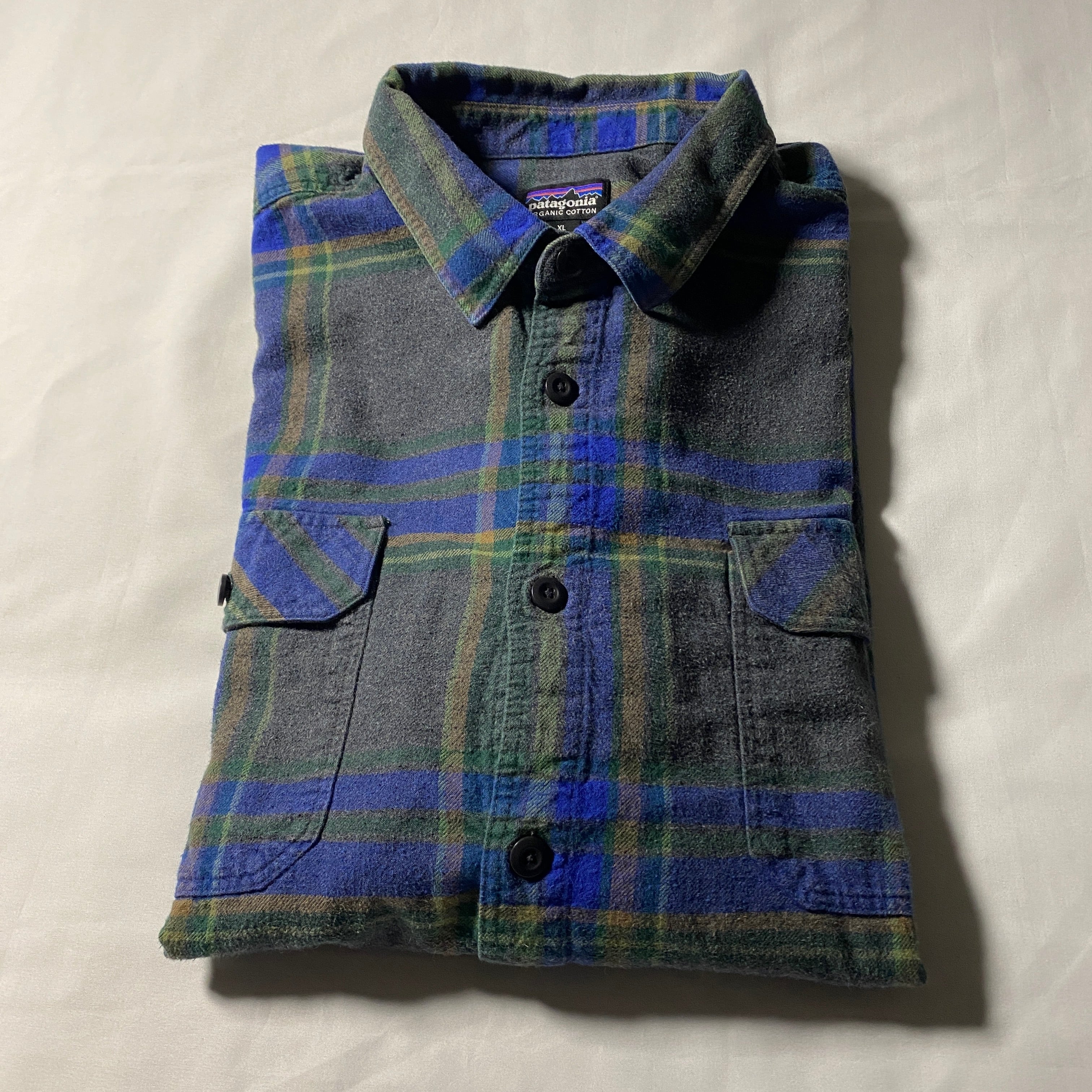 オーガニックコットンを用いたパタゴニアらしいサステナブル志向のフランネルシャツで、2010年代中盤のアウトドアと日常着の境界が最も曖昧だった時代の空気をそのまま纏った一着。グレーをベースにグリーンとブルーを重ねた配色は、90sのヘビーフランネルを思わせつつもシルエットと生地感はあくまで現代的で、街着としての完成度が非常に高い。厚すぎず薄すぎない生地はアウターのインナーにも単体にも対応し、ボタンを留めれば品よく、羽織れば無骨に振れる振り幅の広さが魅力。無理にヴィンテージを気取らず、それでも確実に“良いもの”を着ていると伝わる、静かに強いパタゴニアの真骨頂。