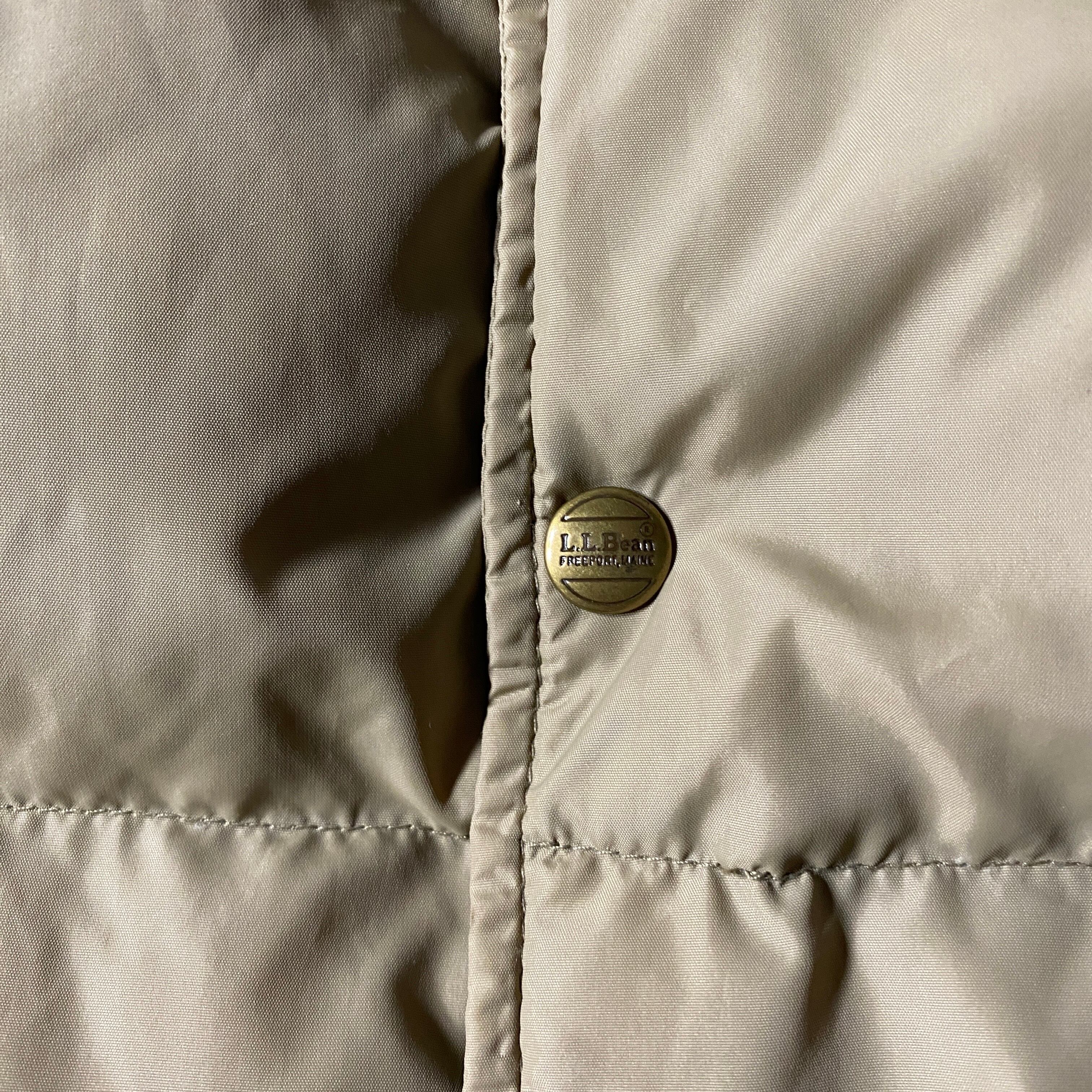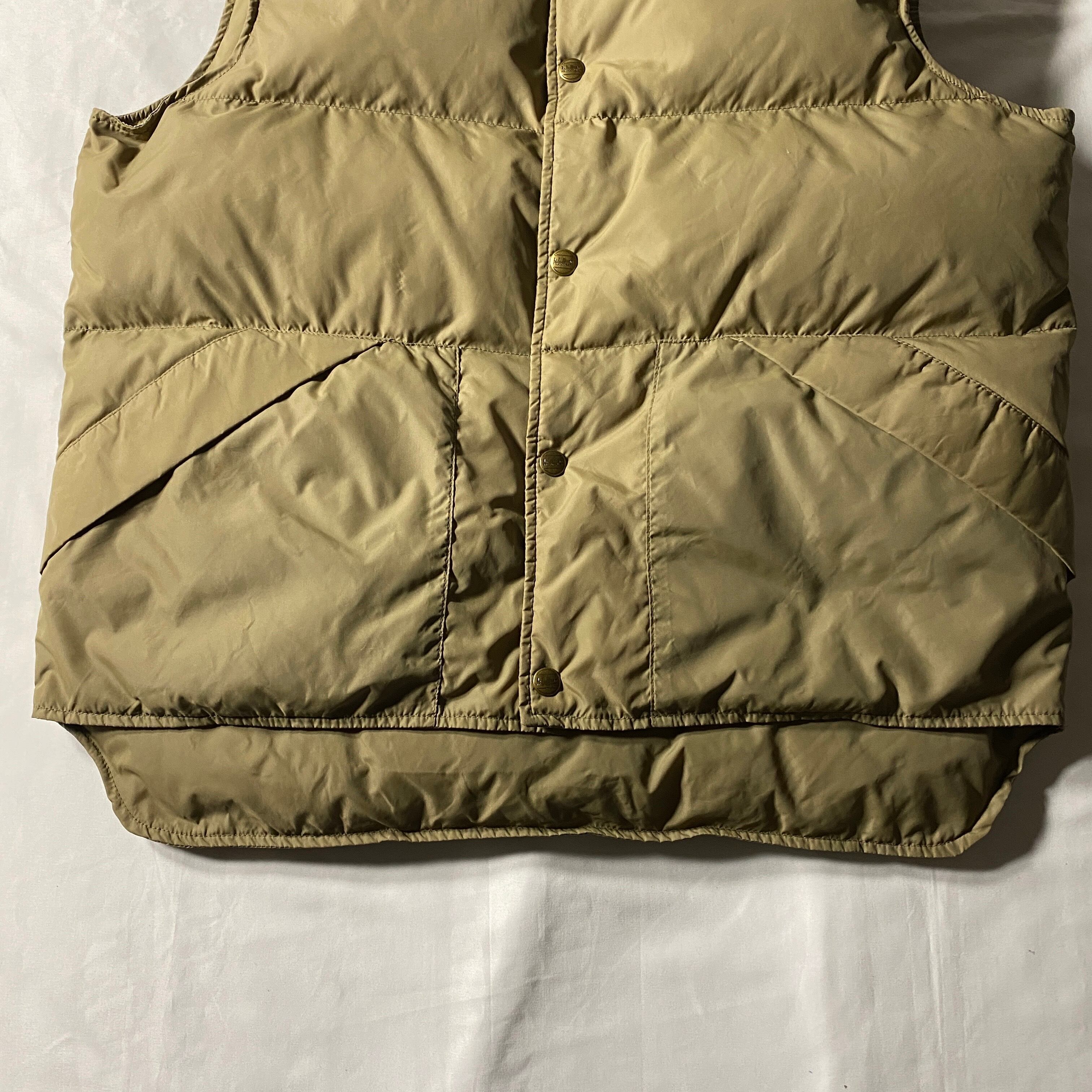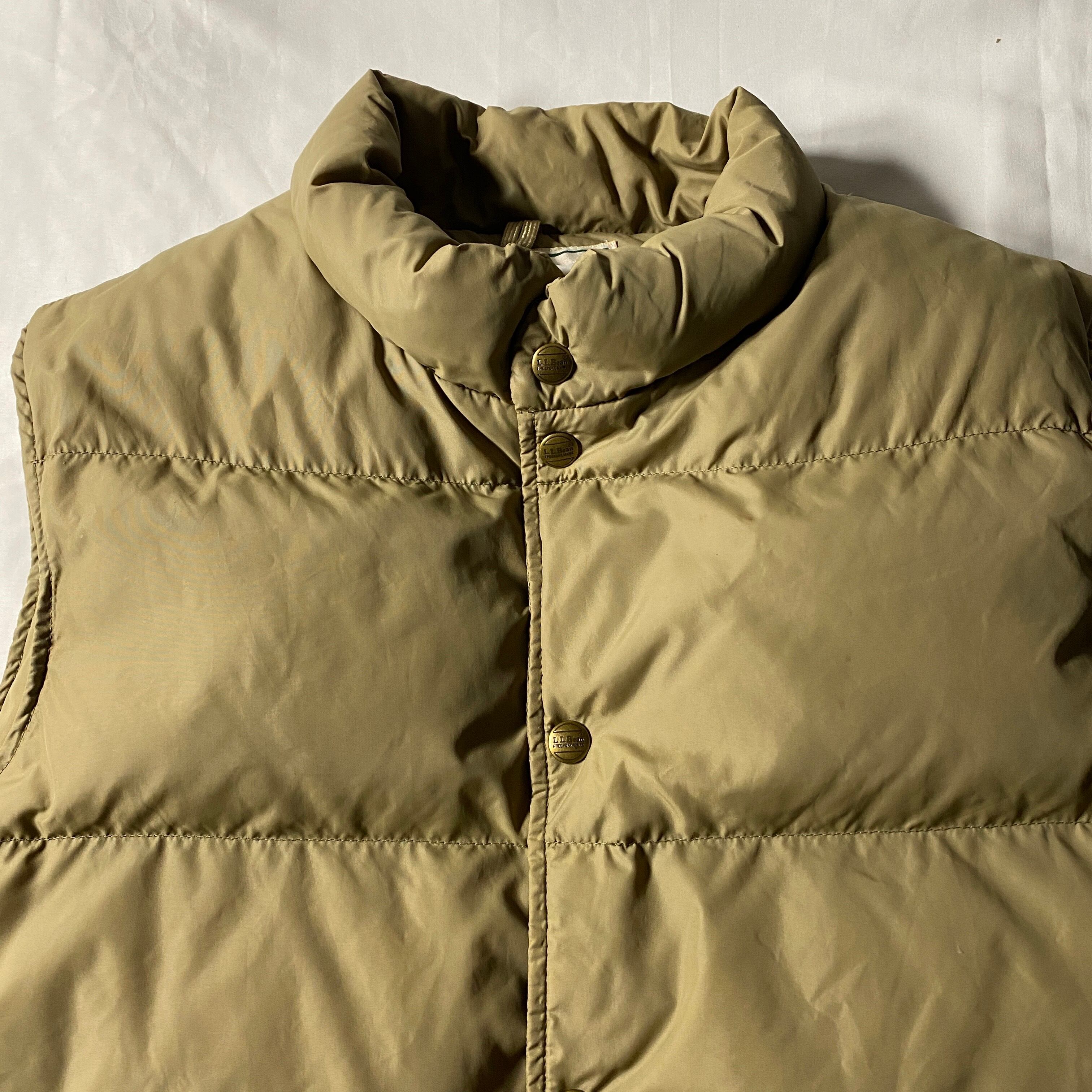 80年代のL.L.BeanらしいFREEPORT,MAINEタグが付くクラシックダウンベスト。ボタンフロントにフラップポケットという無骨なアメリカンアウトドアの王道ディテールが光る一着。ロフトは程よく抑えめで、モコモコしすぎないためスウェットやスイングトップの上にも、コートのインナーにも収まる万能型。近年再評価されているボタンタイプは、ジップとは違う“余裕”を感じさせる佇まい。ベージュの柔らかな色味が土臭さを中和し、街にもフィールドにも自然に馴染む。重ね着の引き算にも足し算にも使える、静かに頼れる名脇役です。