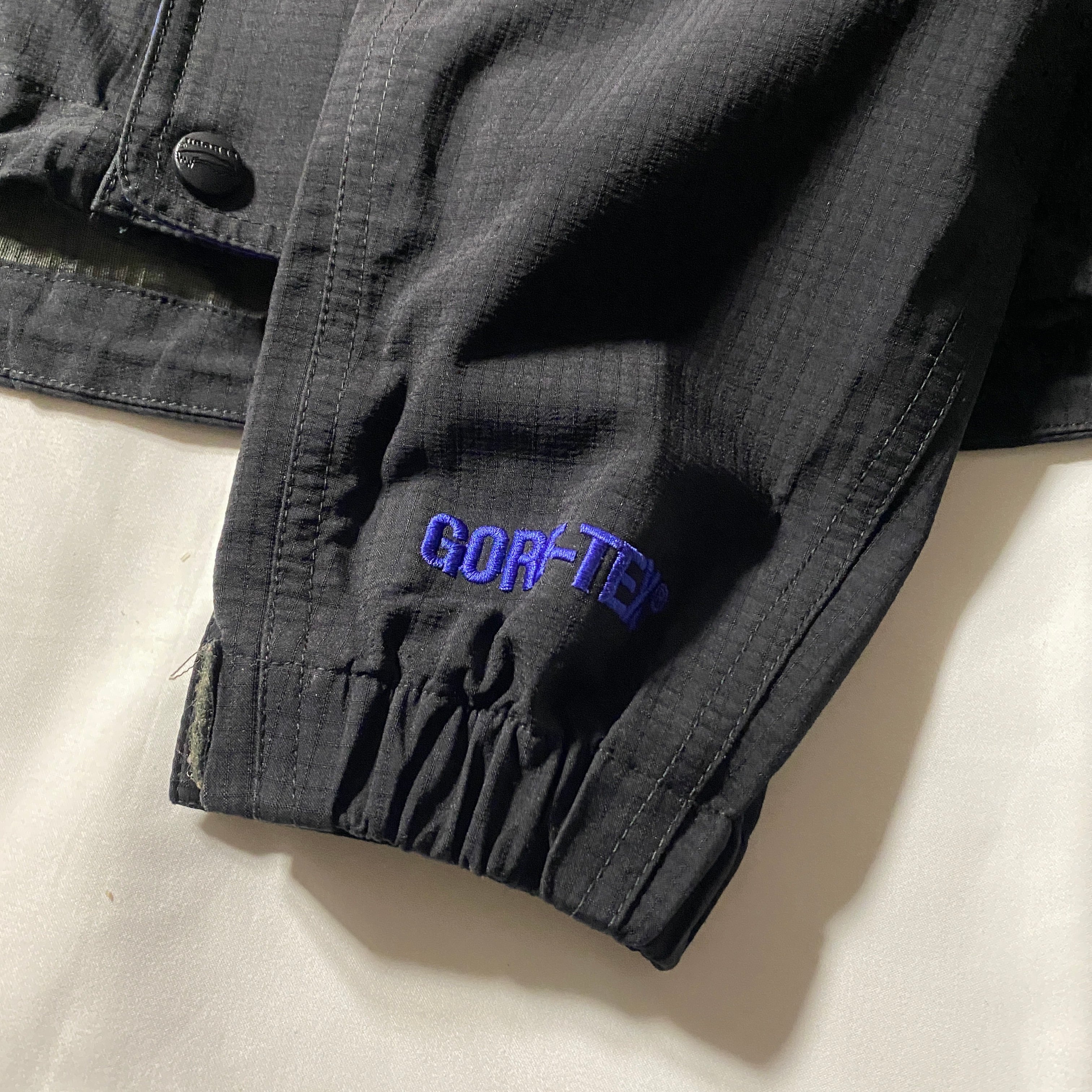 L.L.Beanの名作All Conditionsシリーズ。近年は日本企画でリバイバルを果たした名作。90年代らしい立体裁断と無骨なシルエット、そして袖口に入るGORE-TEX刺繍が当時の本気度を物語る一着です。ブラックボディにパープル×イエローのロゴ配色はアウトドア黄金期のカラーリング。街でも山でも通用する“全部対応”の思想は、テックがトレンド化した今こそ再評価したい存在。完璧な防水よりも、雰囲気と背景を纏う一枚としてどうぞ。
