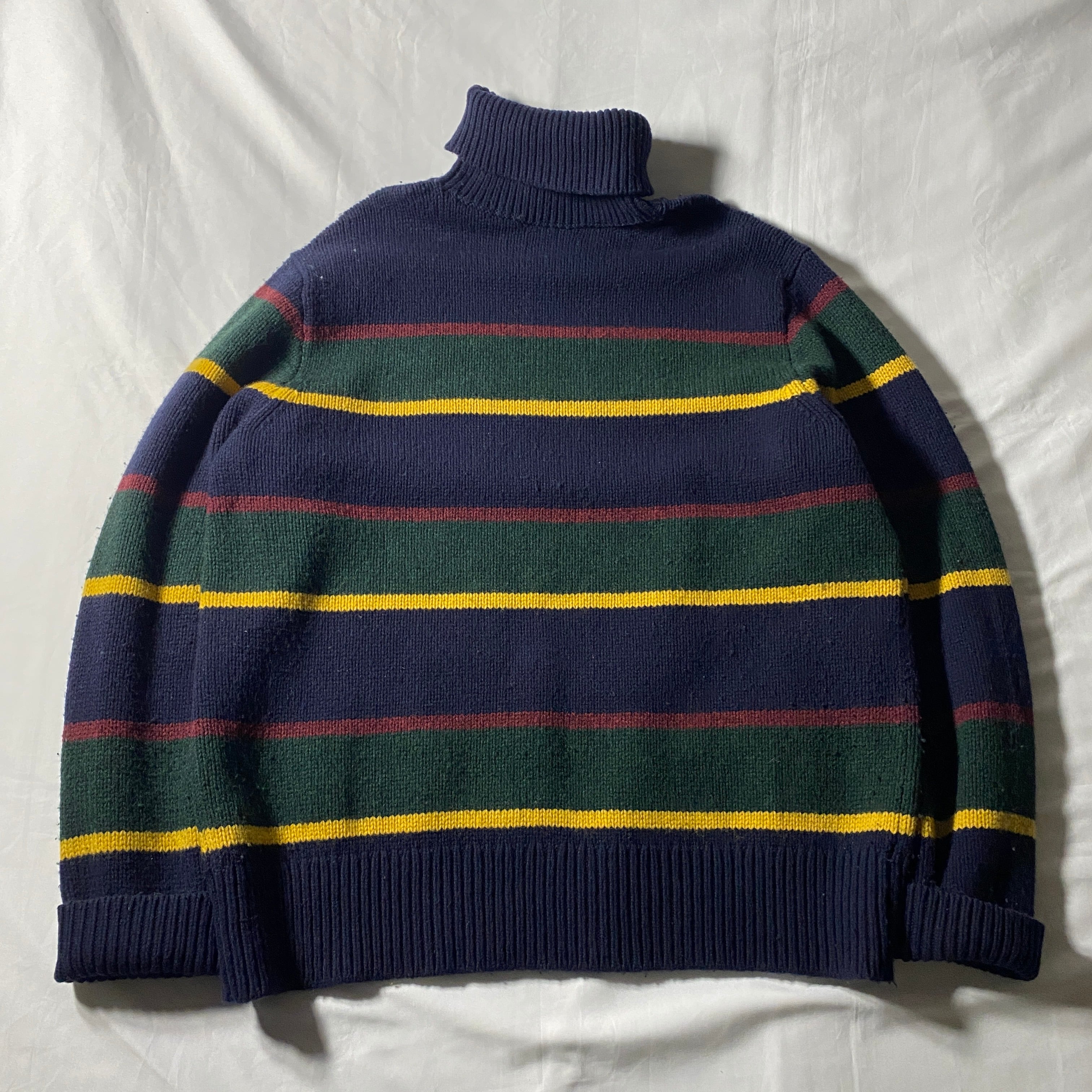 ウール80ナイロン20のしっかりとした肉厚ボディに、ネイビーをベースとしたマルチボーダー。グリーンとイエローの差し色が効いた配色は、どこかカレッジや90sプレッピースタイルを想起させるラルフらしい王道デザイン。ボリュームあるタートルネックとゆとりあるXXLサイズは、あえてラフに着崩すのが今の気分。デニムで王道に、スラックスで品良く、コーデ次第で表情を変える一枚。クラシックを知る大人のためのストライプニットです。