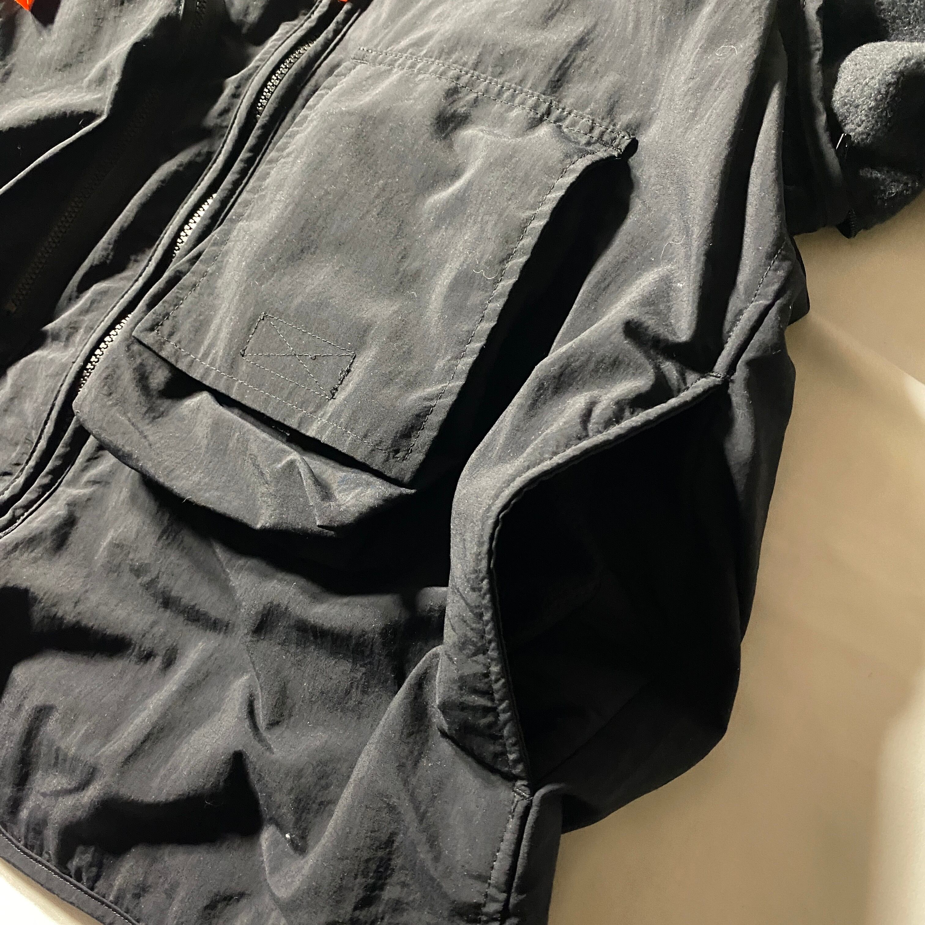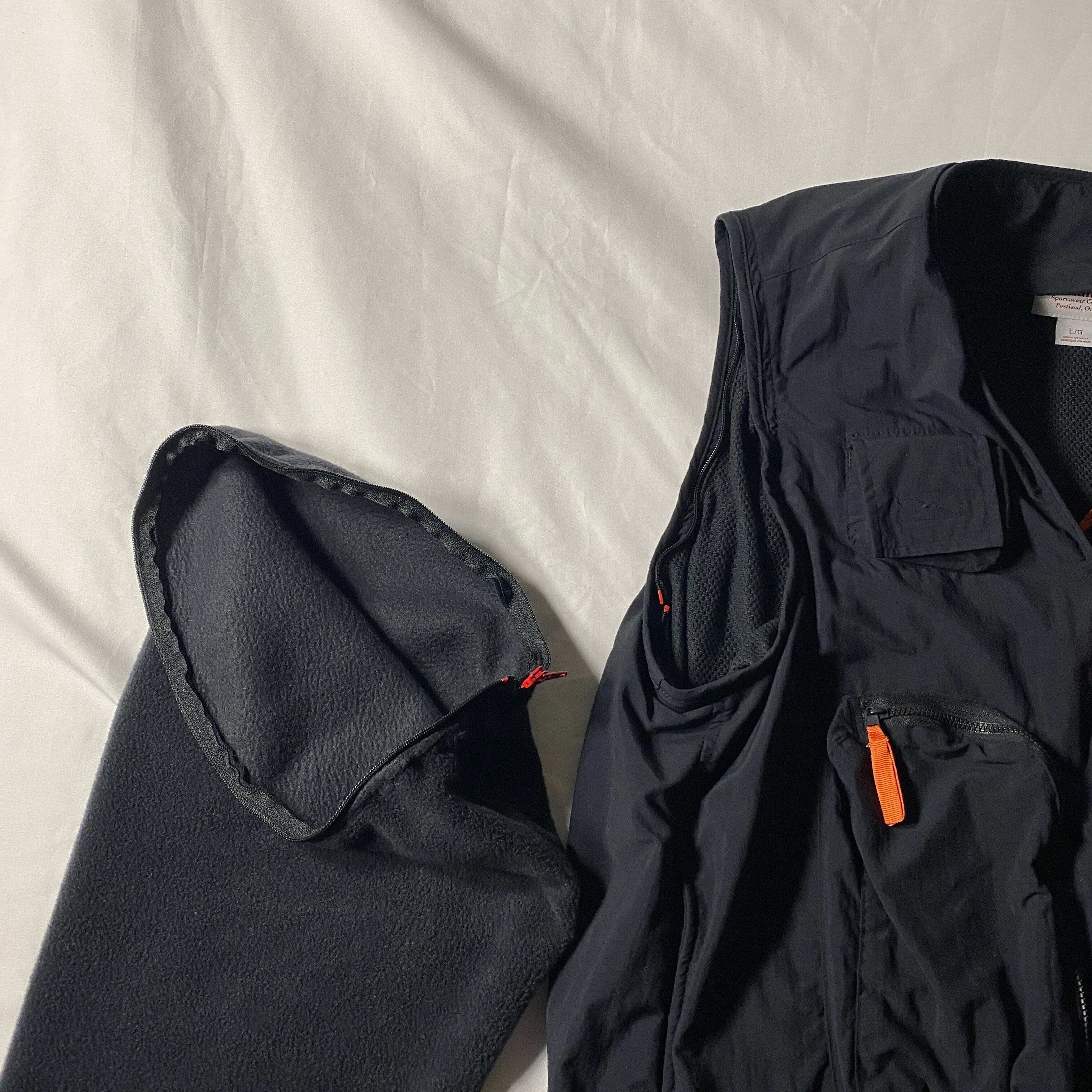 フロントに多数のポケットを備えた本格仕様のワーディングジャケット。袖はジップで着脱可能で、ベストとしても使える2way設計。フィッシング由来のギア感と、ブラックの都会的配色にオレンジの差し色が効いたテックバランスは、街でこそ映える一着。復刻ロゴタグが示す通り近年モデルながら、90sライクなアウトドアムードをしっかり継承。釣りに行かなくても、ポケットの多さに理由をつけたくなる服です。