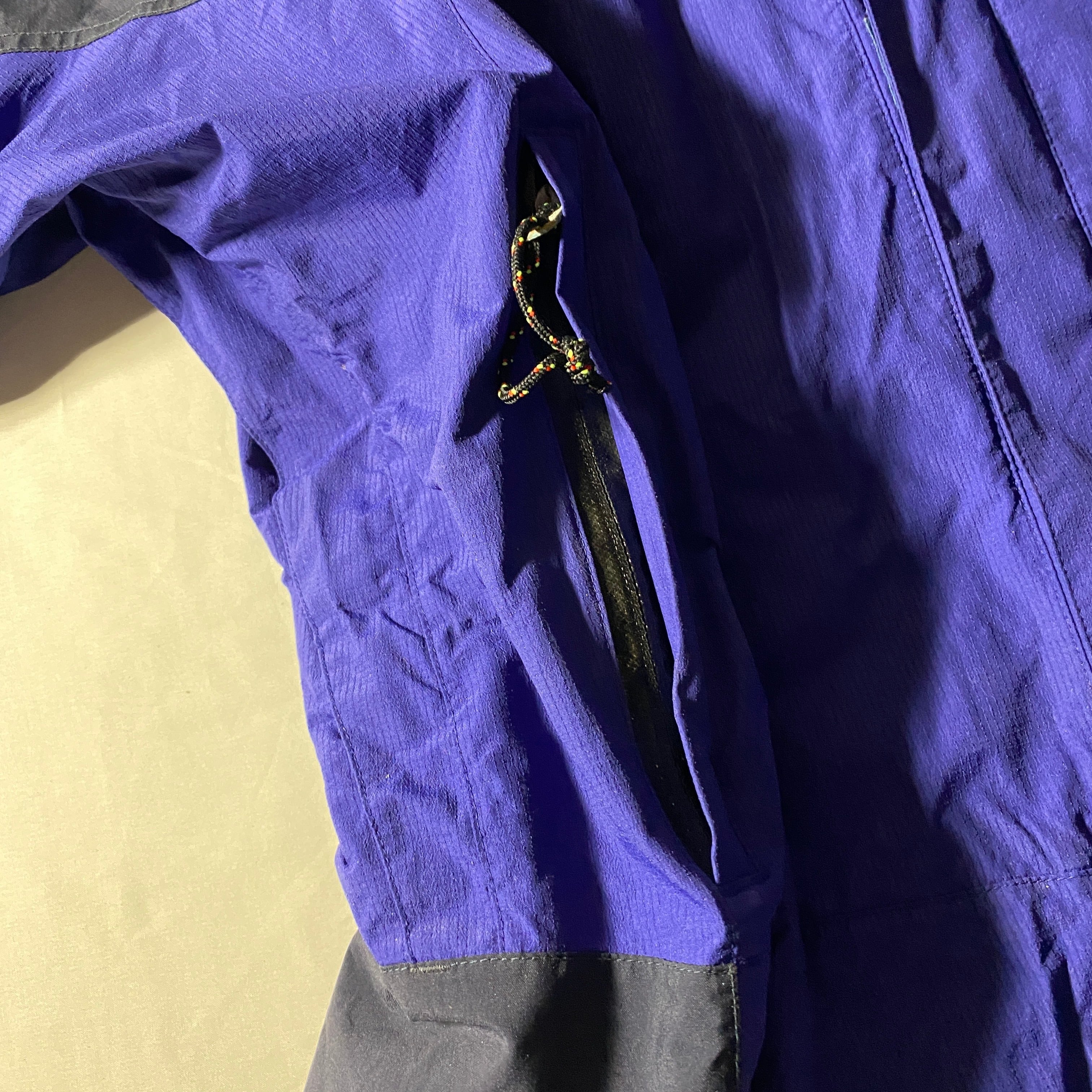 シームテープは経年により劣化していたため除去済みですが、膜は粉化しないタイプで着用に支障のない状態。ベンチレーション片方青サビによる固着により開閉困難。