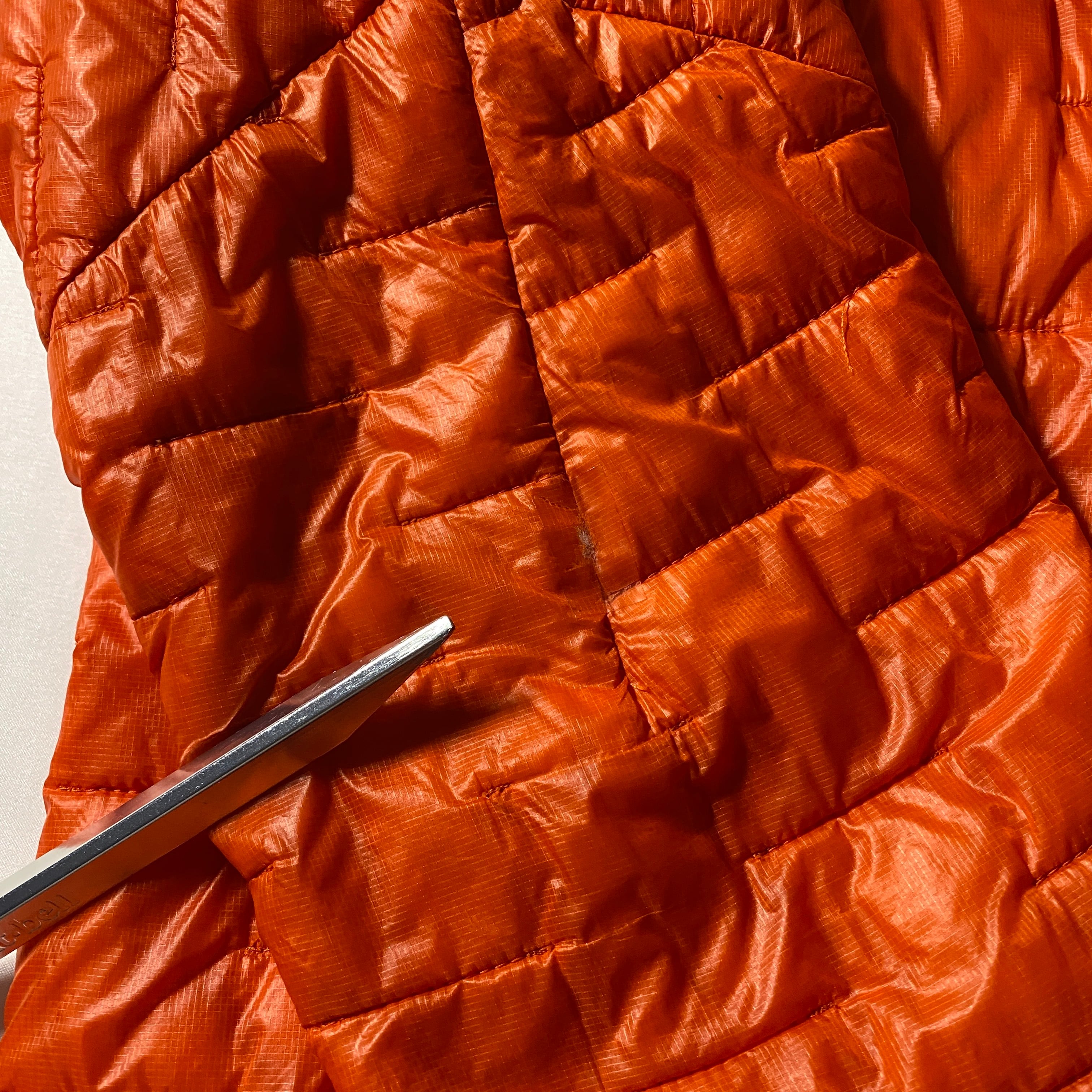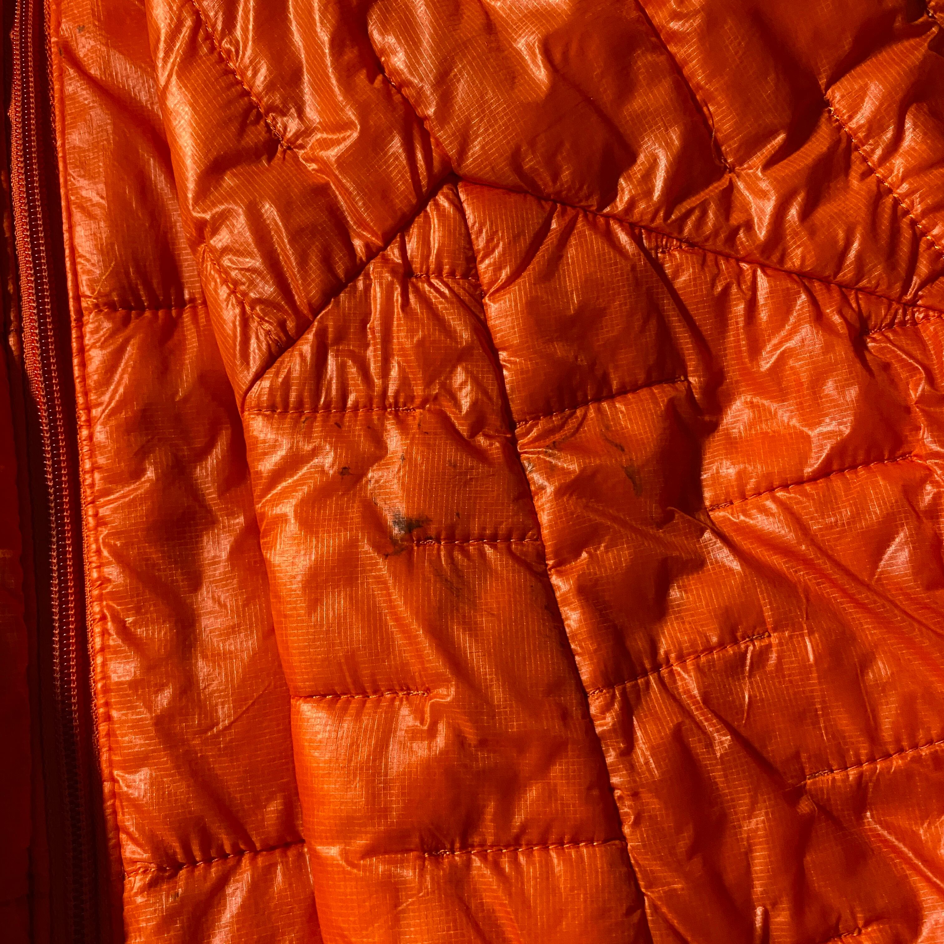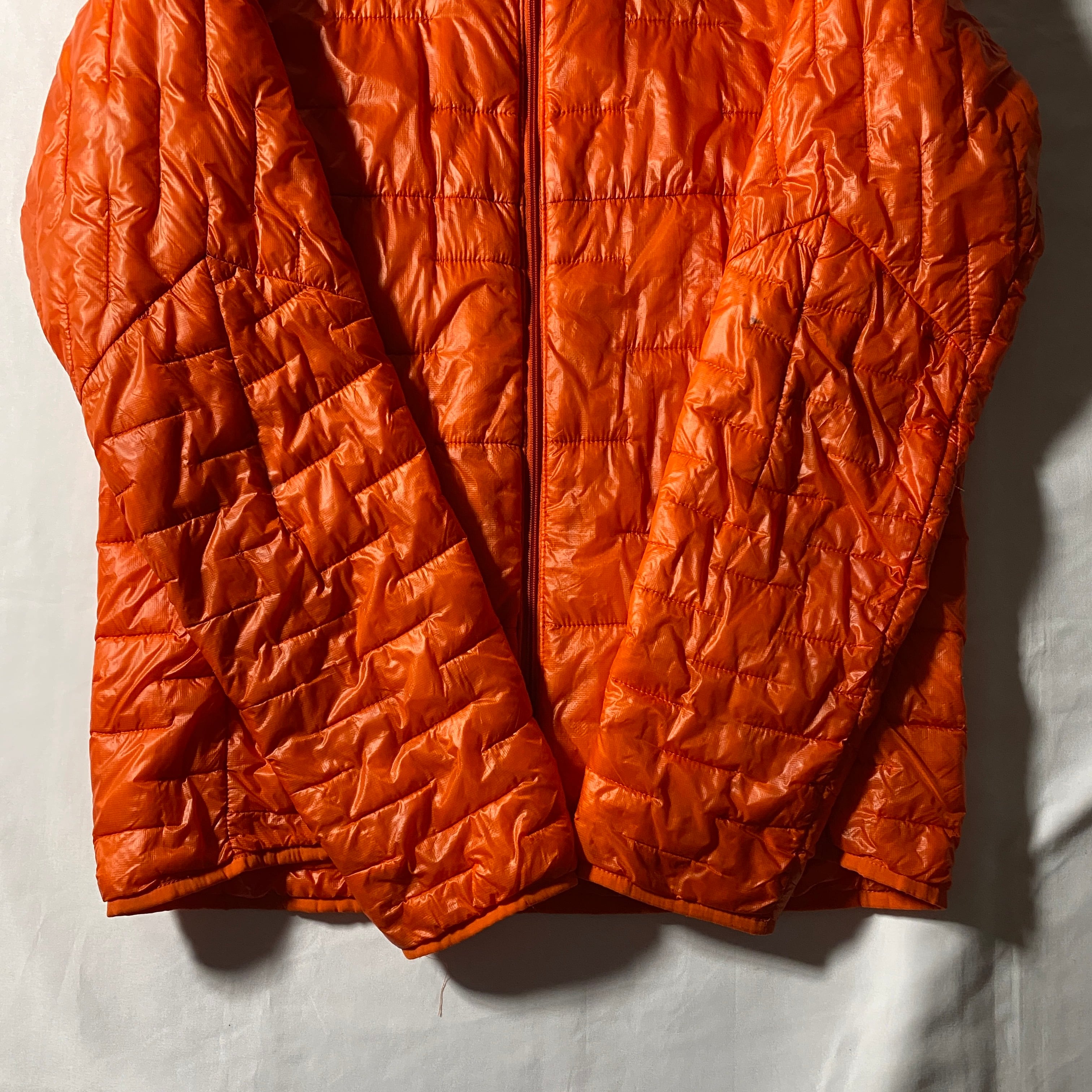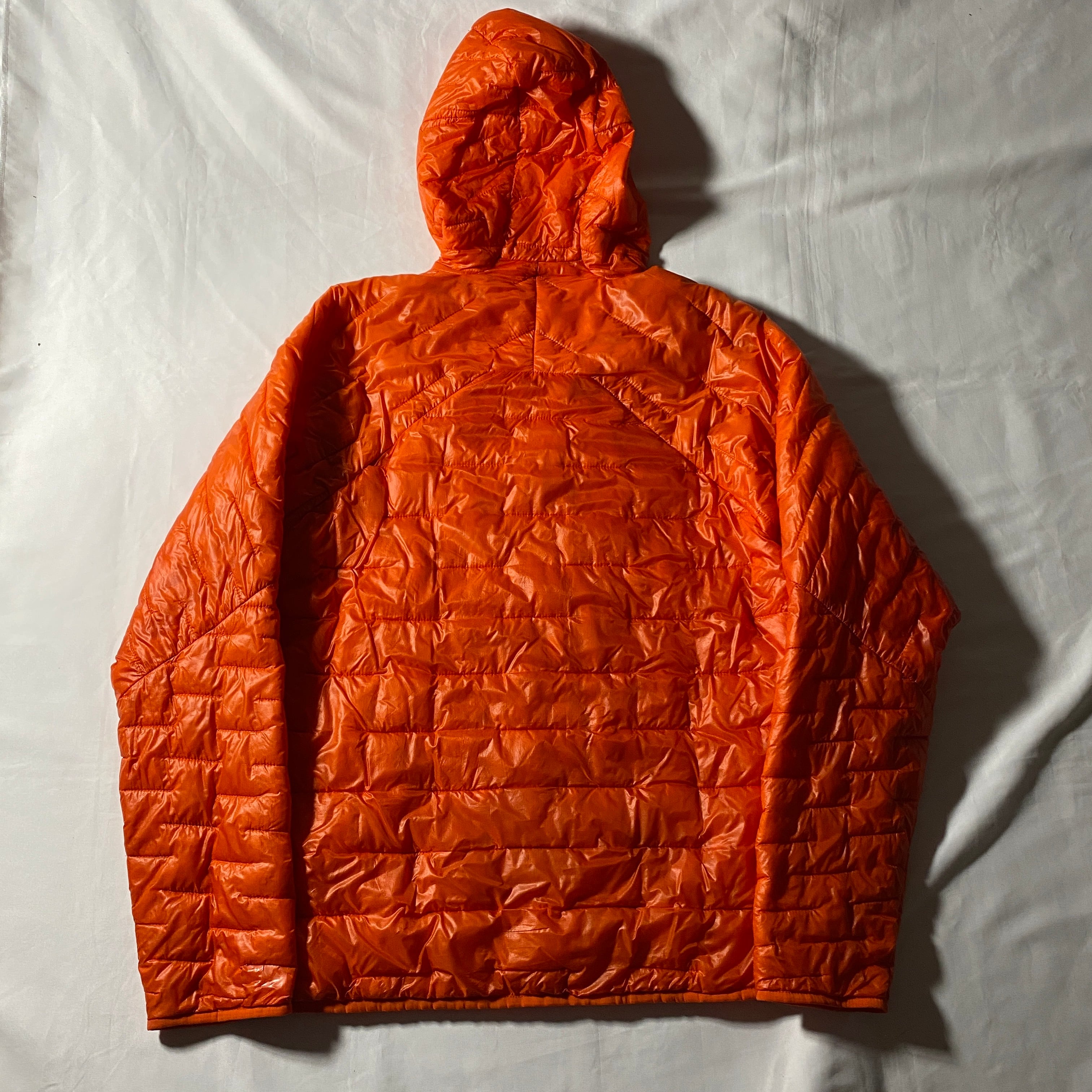 2018年製STY84205SP18。プリマロフトGoldインサレーションを封入し、濡れても保温力を維持する名作ナノパフ。リップストップシェルの格子が光を受けて立体感を生み、鮮やかなオレンジはアウトドアの視認性とストリートでの主張を両立。コンパクトに収納できるパッカブル仕様で、バッグに忍ばせておけば突然の冷え込みにもスマートに対応。タウンユースから山までシームレスに使える一着。
