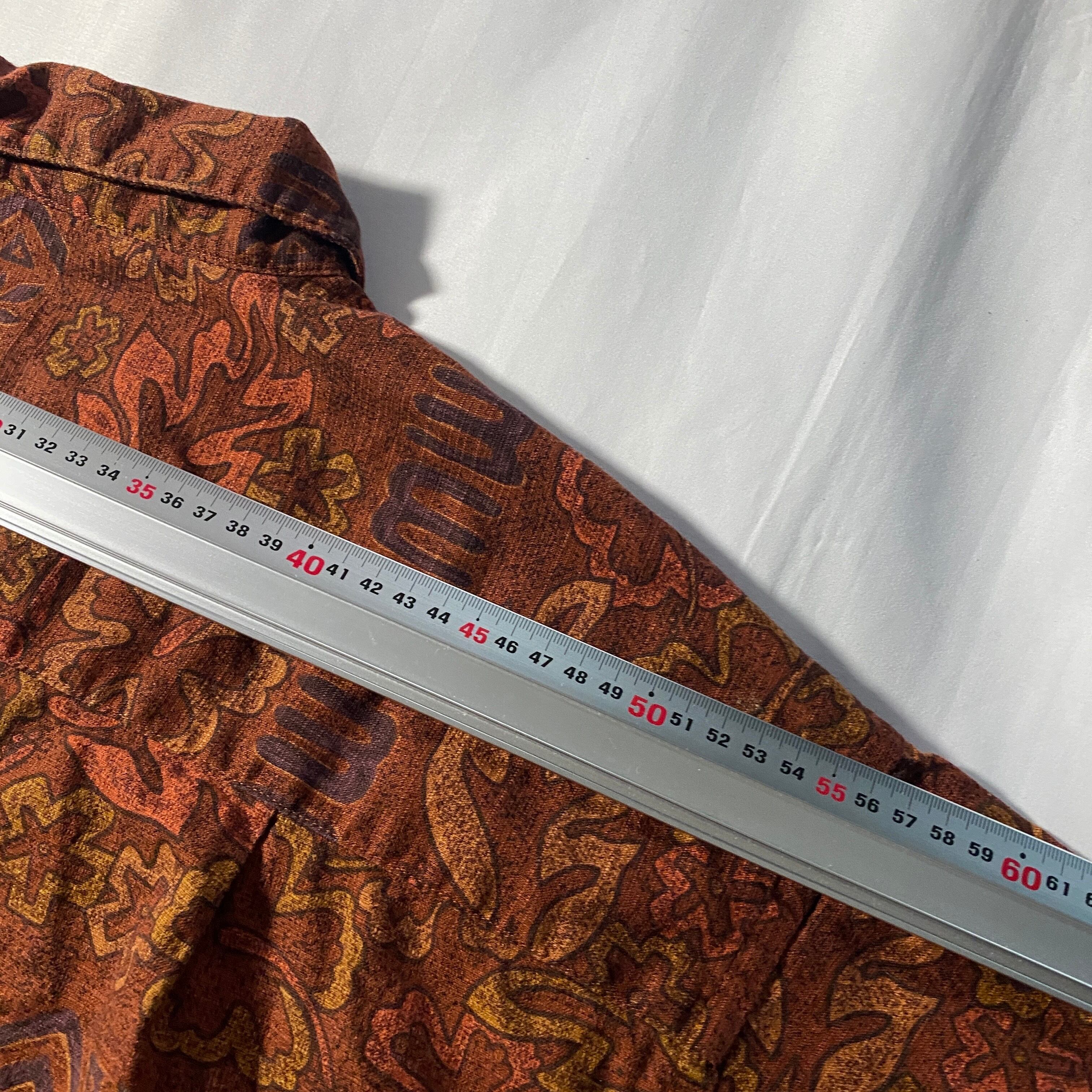 2001年タイ製のオーガニックコットン仕様パタロハ。フラワーモチーフとトライバル調の幾何学パターンをボーダー状に重ねたデザインで、ハワイアンの伝統柄とアースカラーを掛け合わせた落ち着きある一枚。いわゆる“海ど真ん中”な総柄とは一線を画す、夕暮れのラウンジが似合う配色です。XLのゆったりしたシルエットで、ショーツにもデニムにも相性抜群。南国というより“大人の余裕”を纏うパタロハです。