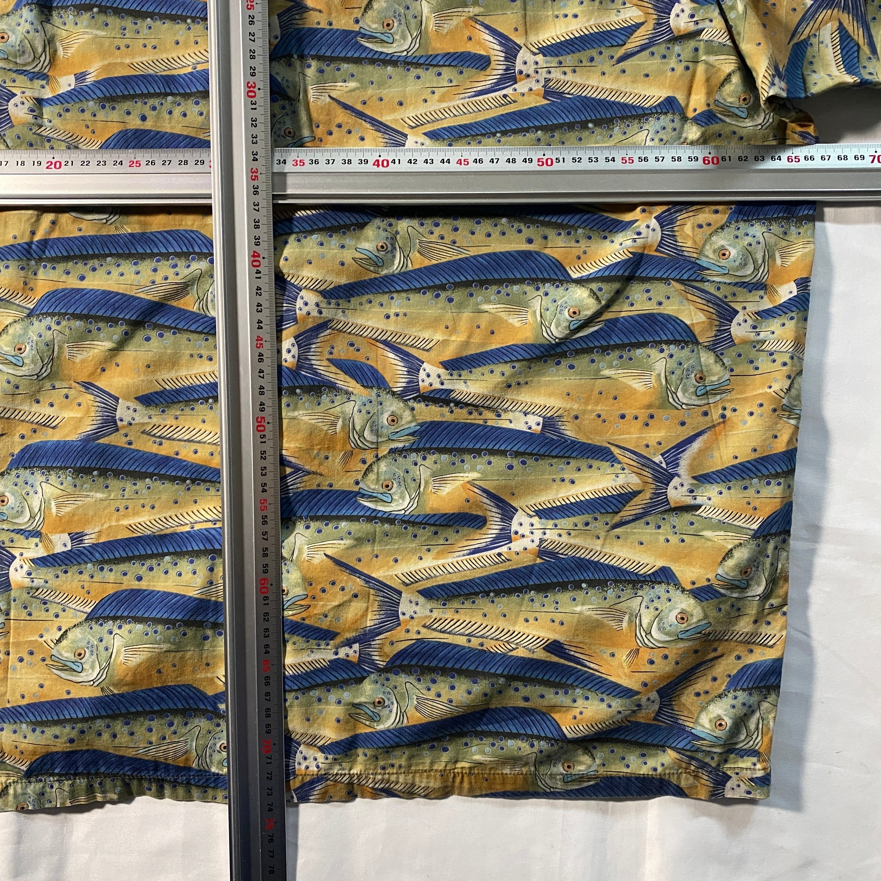 1995年製の名作パタロハ、通称“マヒマヒ”柄。ハワイの海を象徴するシイラ(ドルフィンフィッシュ)を大胆に総柄で配した一枚で、ブルーとイエローのコントラストが南国の陽射しをそのまま閉じ込めたような配色。ココナッツボタンやゆったりとしたボックスシルエットも当時らしいディテールです。街で着ればコンクリートジャングルに現れた回遊魚、リゾートで着れば完全に主役。説明不要のアイコニックパターンです。