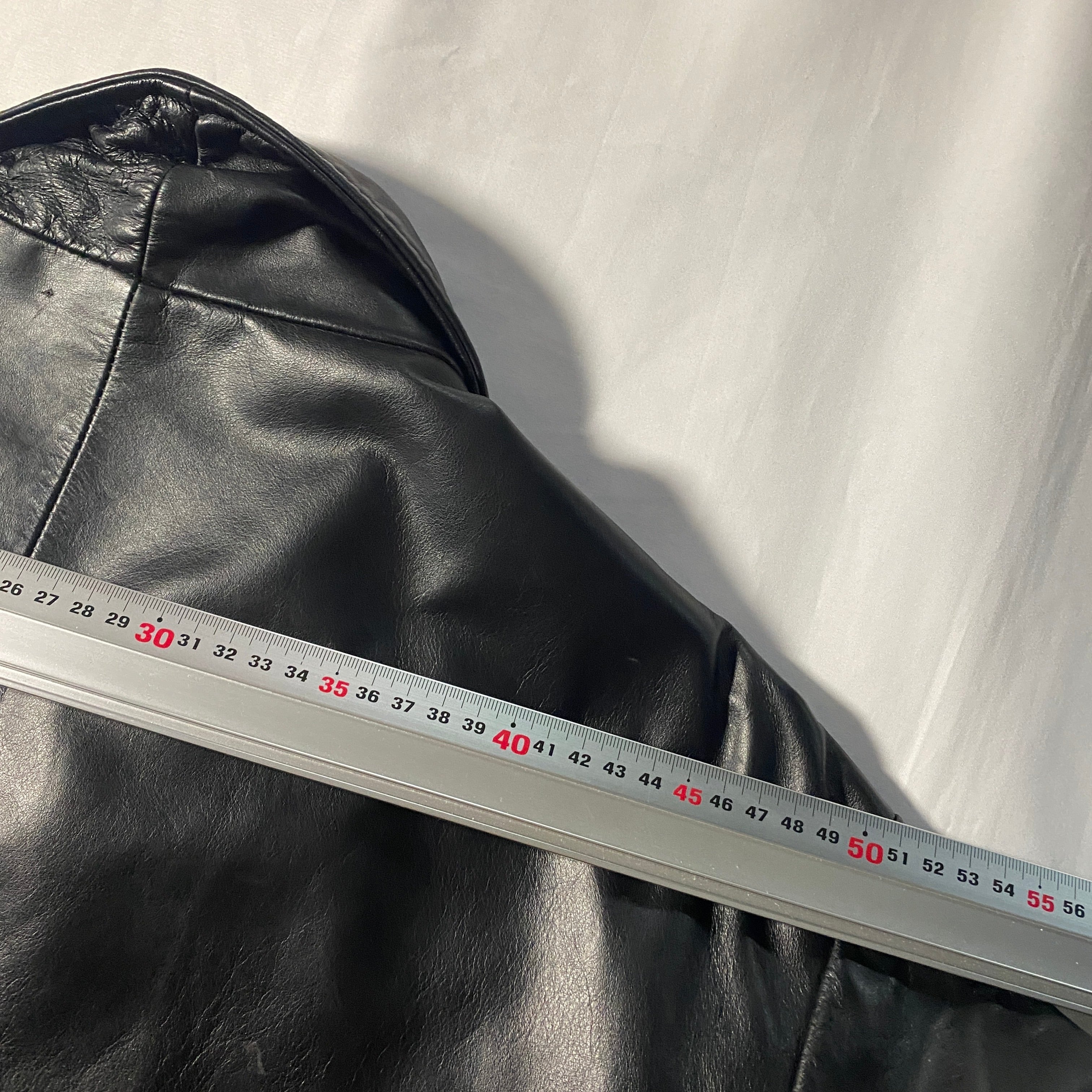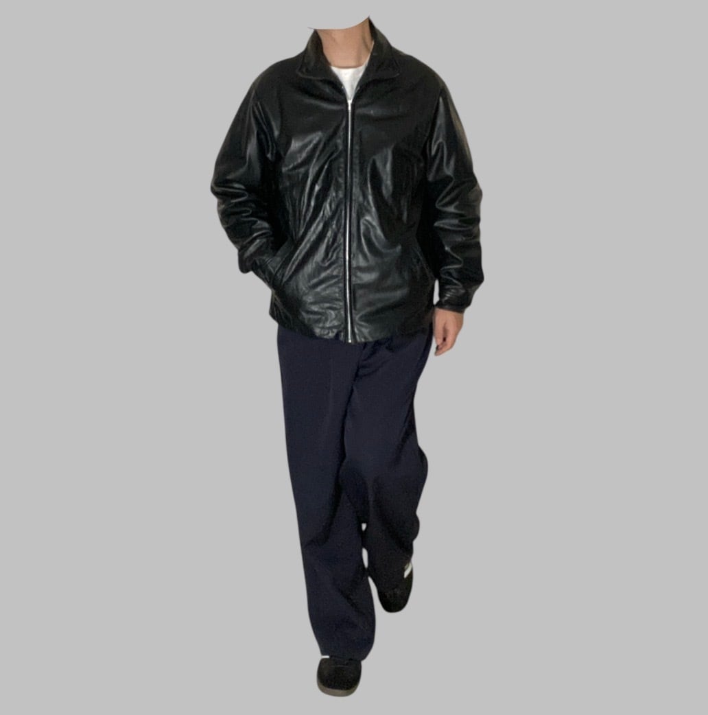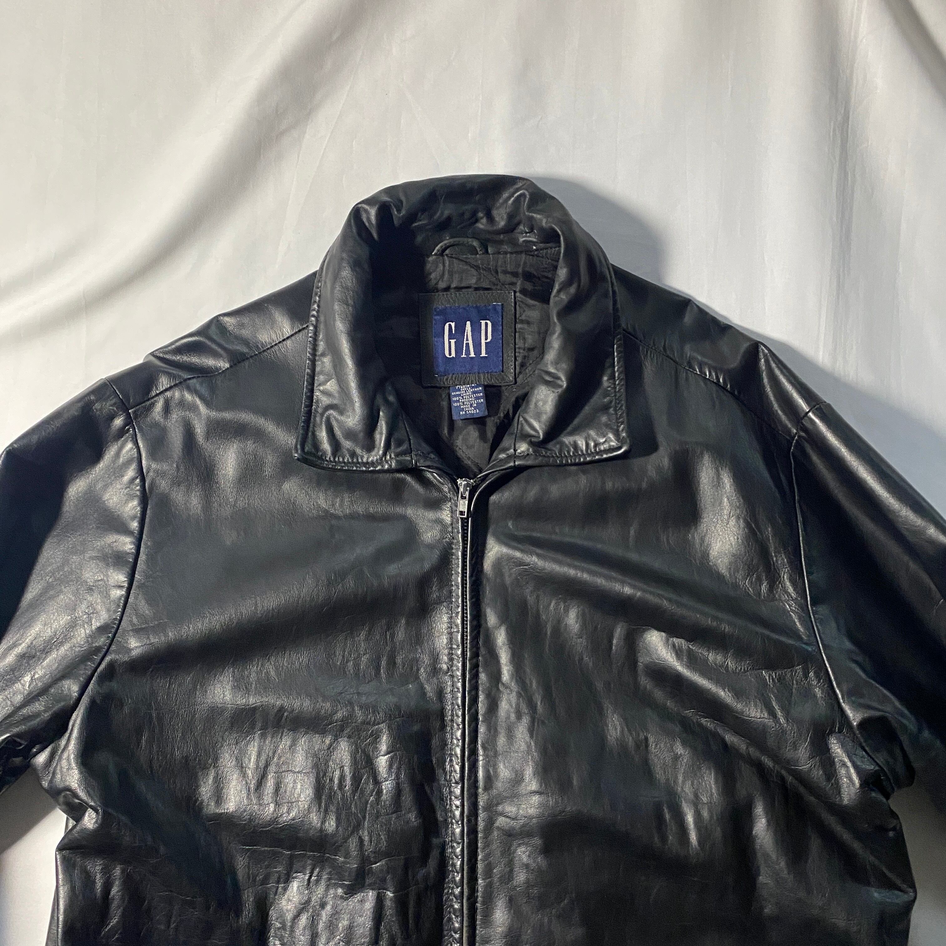 GAPのブルーボックスタグとRN表記から見ても2000年代初頭の一着。シェルはジェニュインレザー、裏地と中綿はポリエステル仕様でデイリーに扱いやすい設計。無駄な装飾を削ぎ落としたミニマルなジップアップ型は、90sの空気を引き継ぎつつ都会的にアップデートされたバランス感が魅力です。程よくルーズなLサイズにショートすぎない着丈、デニムにもスラックスにも振れる守備範囲の広さ。リペア済みで実用面もアップデートされており、ただのOld GAPでは終わらない“今ちょうどいい”レザーブルゾンです。