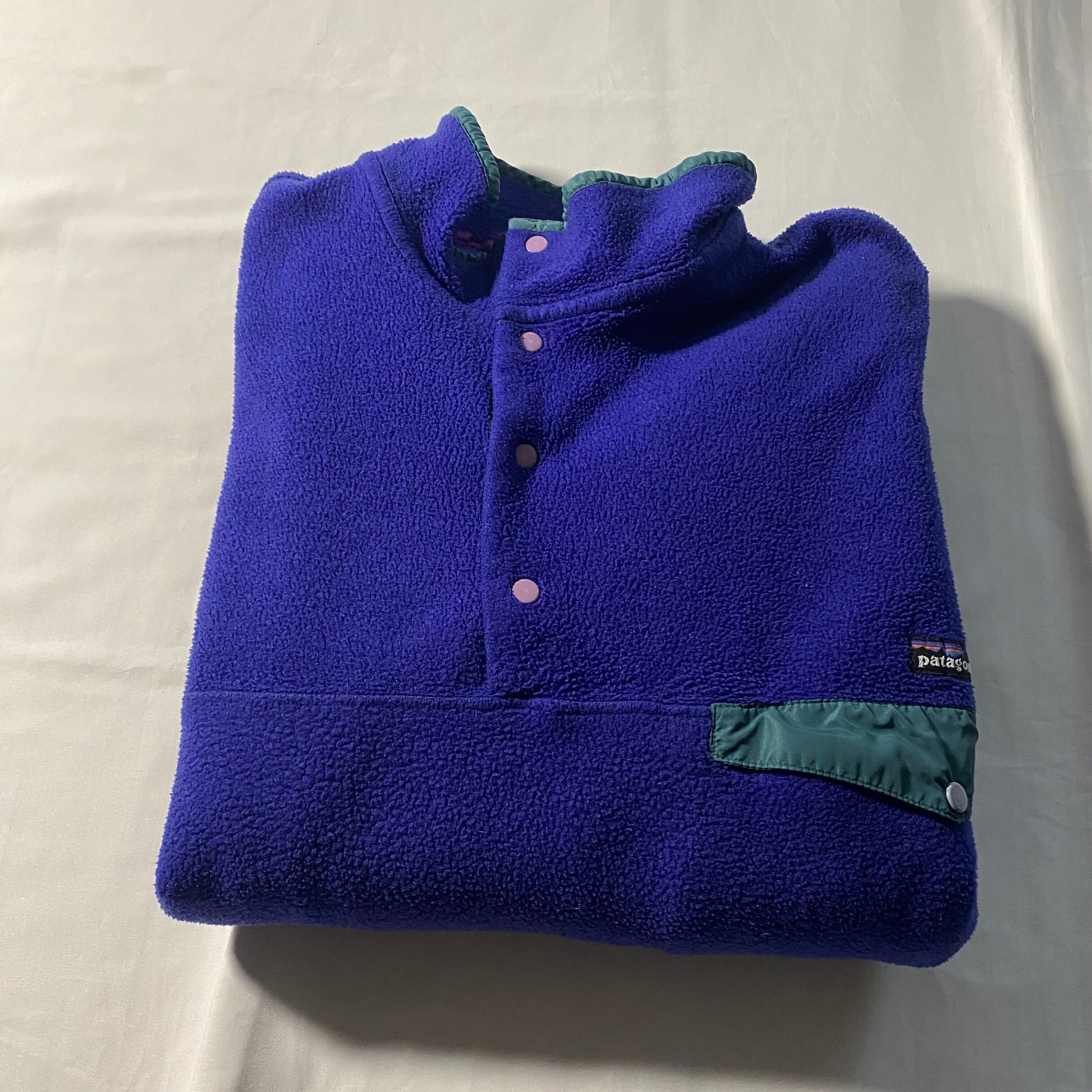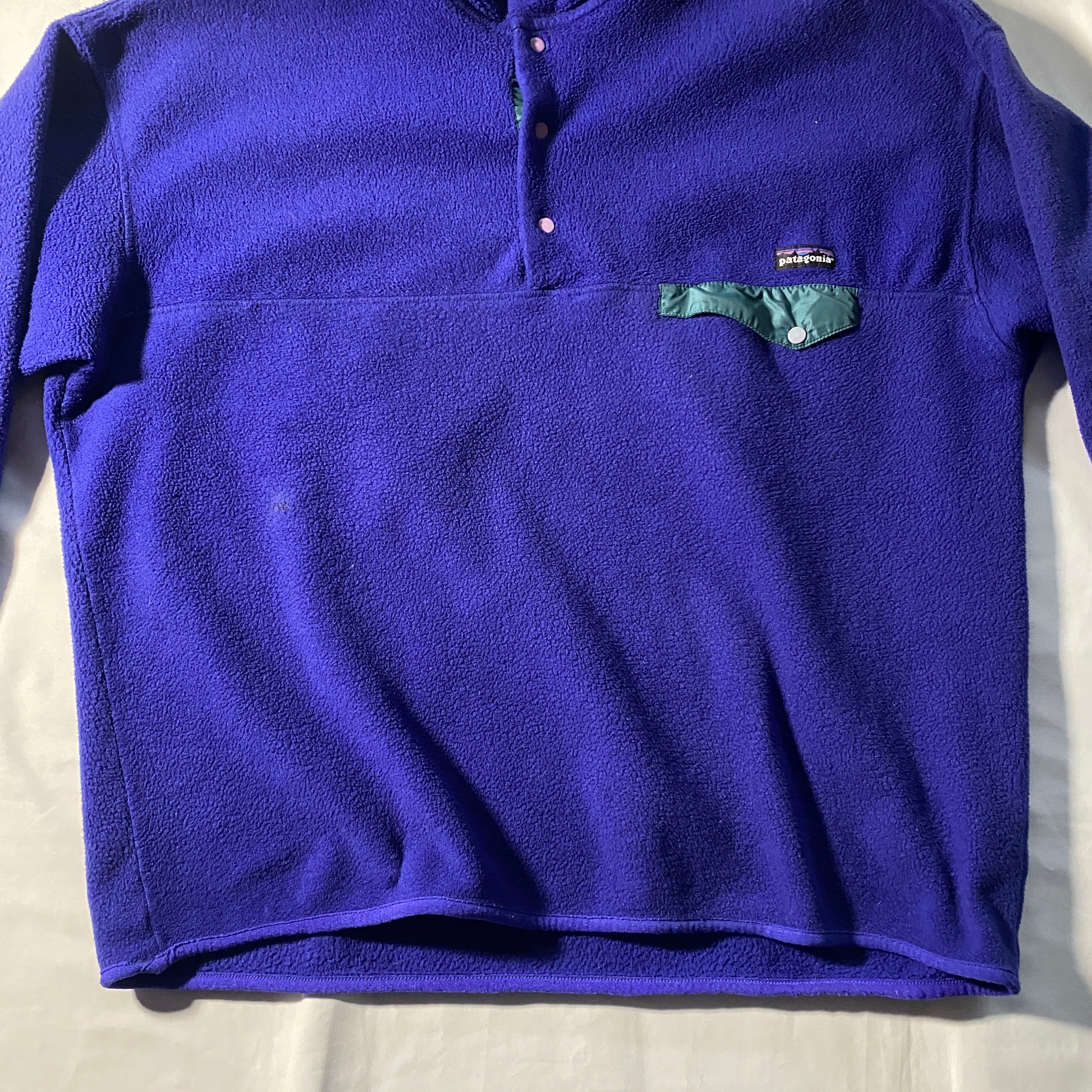 1990年製のパタゴニア・シンチラスナップT。発色の良いパープルにグリーンのナイロンポケットという、90年代らしい大胆なカラーブロックが魅力の一枚です。まだフリースが“アウトドアギアの進化形”として評価されていた時代のプロダクトで、肉厚なシンチラの質感は現行とはひと味違う存在感。XXLのビッグサイズはストリートとの相性も抜群で、ゆったりと羽織るだけでシルエットが完成します。袖口のディテール欠損さえもリアルな経年の証として楽しめるのがヴィンテージの醍醐味。色で語れる一着です。