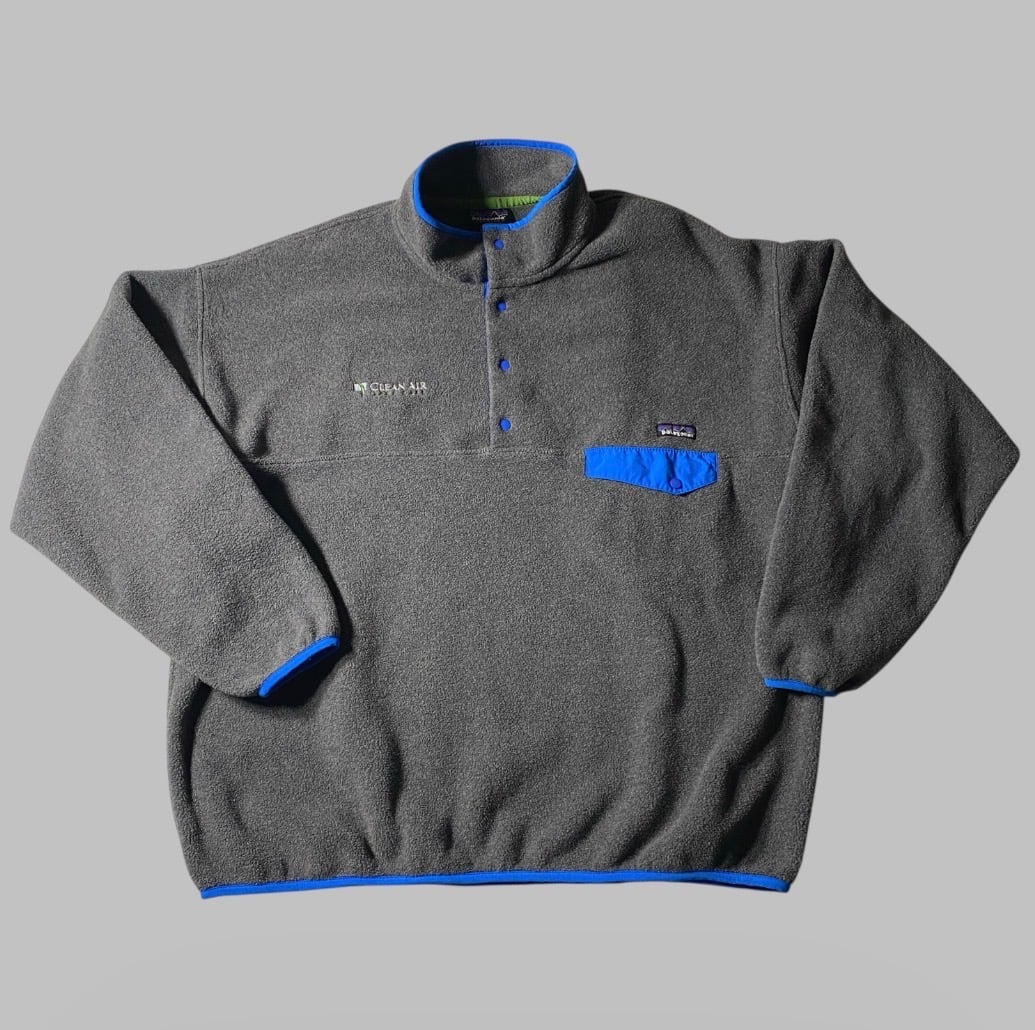 2011年製のパタゴニア・シンチラ。軽量かつ高い保温性を誇る定番フリースに、企業ロゴCleanAirの刺繍が入った希少な企業配給モデル。環境や空気清浄関連の企業ユニフォームとして制作された背景を持ち、パタゴニアの環境志向ともリンクするストーリー性が魅力です。グレーボディにブルーのパイピングとポケットフラップが映える好配色、さらにXXLのビッグサイズは現代的なオーバーシルエットにも最適。アウトドアとコーポレートカルチャーが交差する、通好みの一枚です。