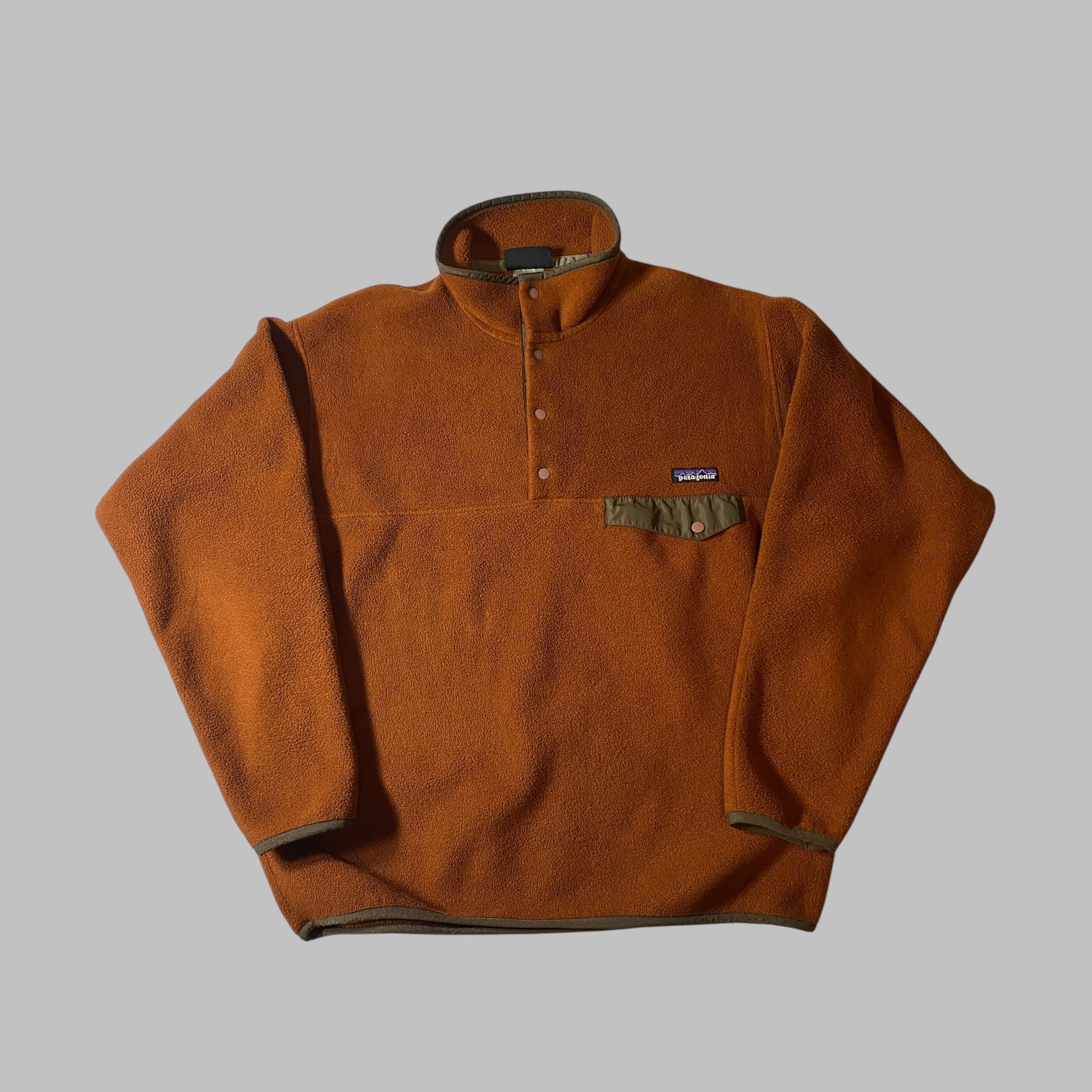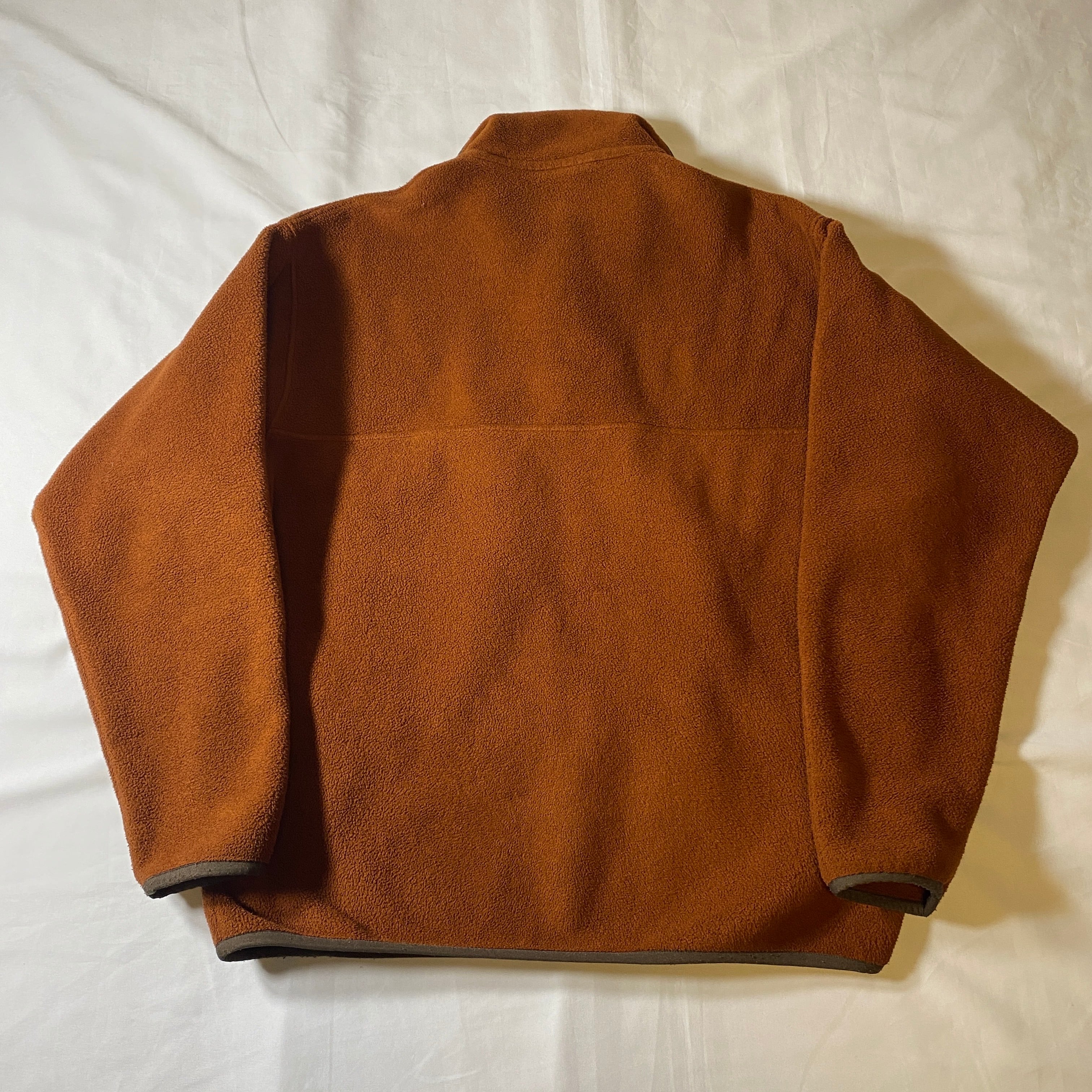 2000年代のパタゴニア定番フリース、シンチラスナップT。落ち着いたブラウンボディにオリーブ系トリムを合わせた配色は、当時のアウトドアカタログにも見られるクラシックなアーストーン。ポリエステルフリース「Synchilla」は軽量ながら保温性が高く、キャンプや登山はもちろん街着としても支持され続ける名素材です。派手さはないものの着るほどに味が出るカラーで、デニムやチノと合わせれば90〜00年代アウトドアスタイルを自然に再現できる一枚。静かに格好いいタイプのシンチラです。