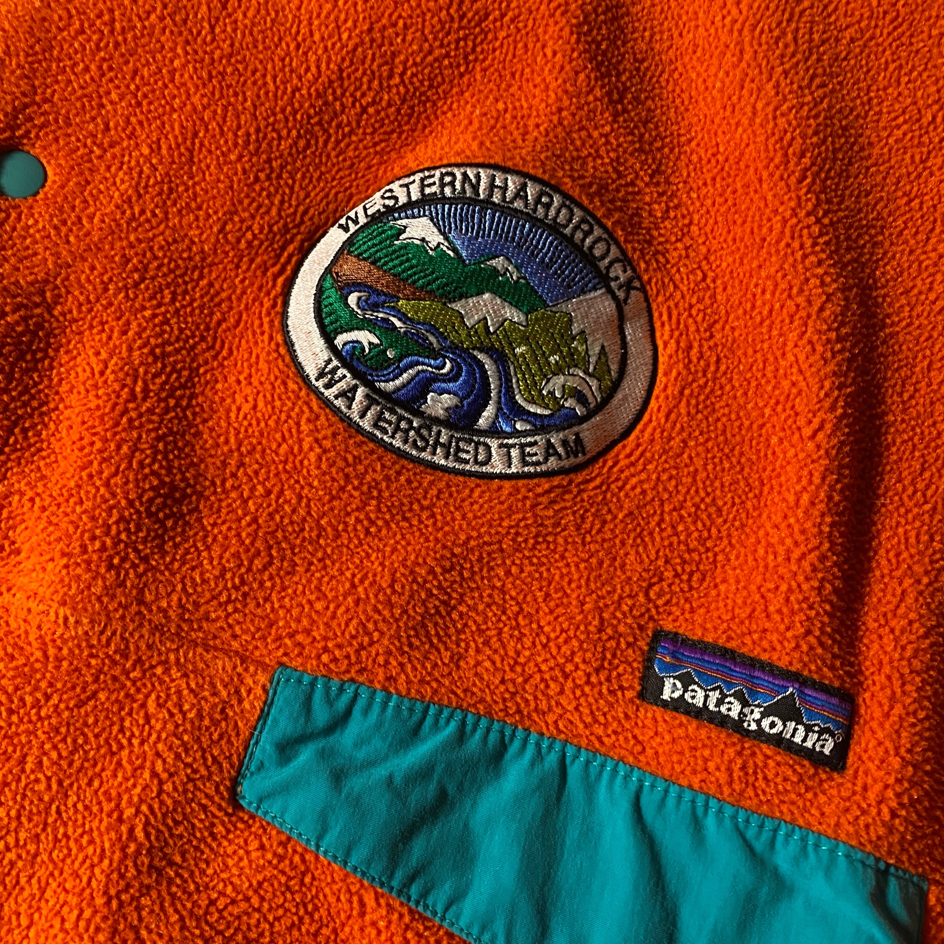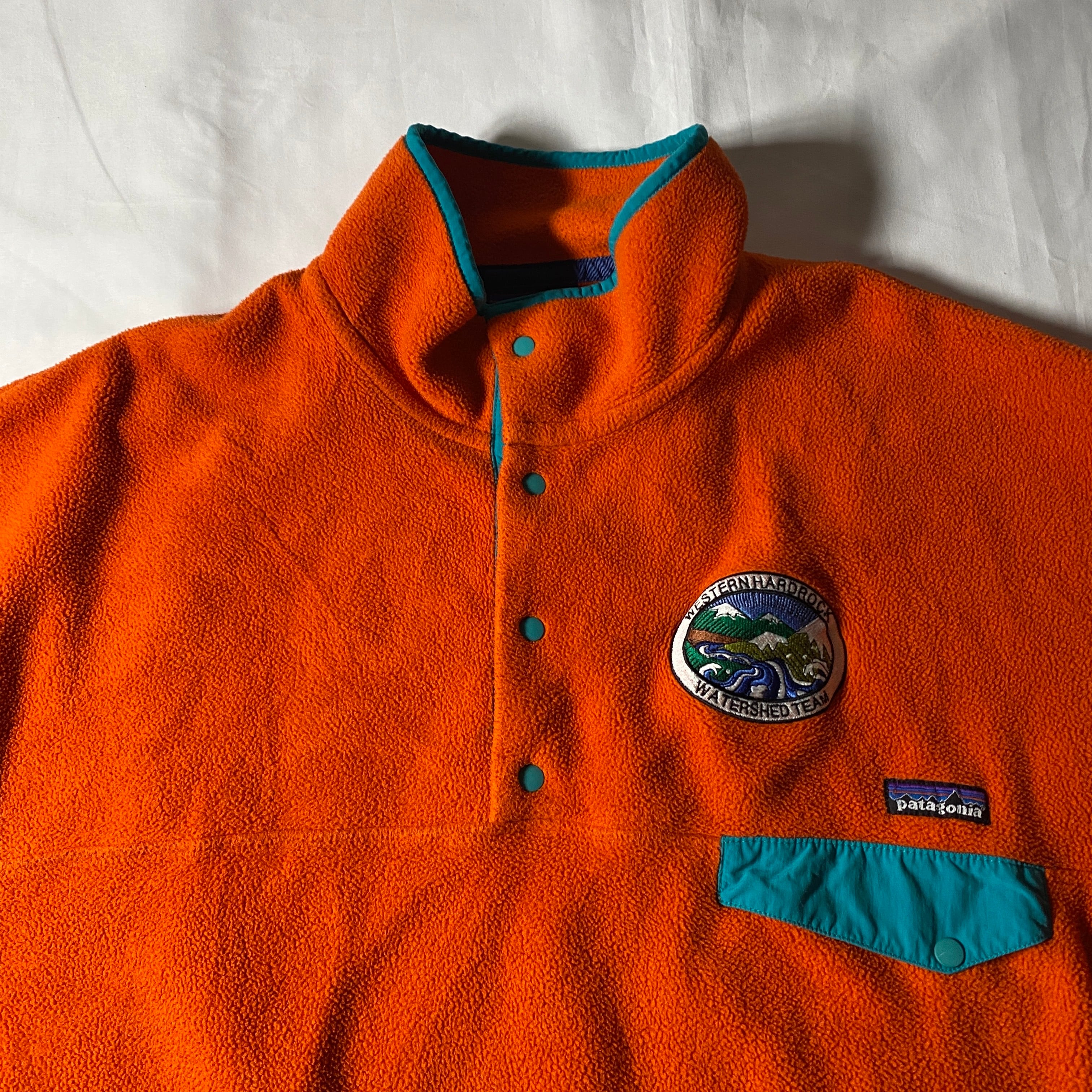 背面に「WESTERN HARDROCK WATERSHED TEAM」と入るチーム仕様のカスタムシンチラスナップT。ハードロックとはアメリカ西部の砂岩や花崗岩地帯のクライミングエリアを指す言葉で、アウトドア研究や環境保護プロジェクトに関わるチームウェアとして作られた可能性の高い一枚です。鮮やかなオレンジボディにターコイズトリムという配色はパタゴニアらしいクラシックなアウトドアカラー。通常のスナップTに加えワッペンとバックプリントが入ることで、まるでフィールドチームのユニフォームのような存在感を放つコレクタブルな個体です。