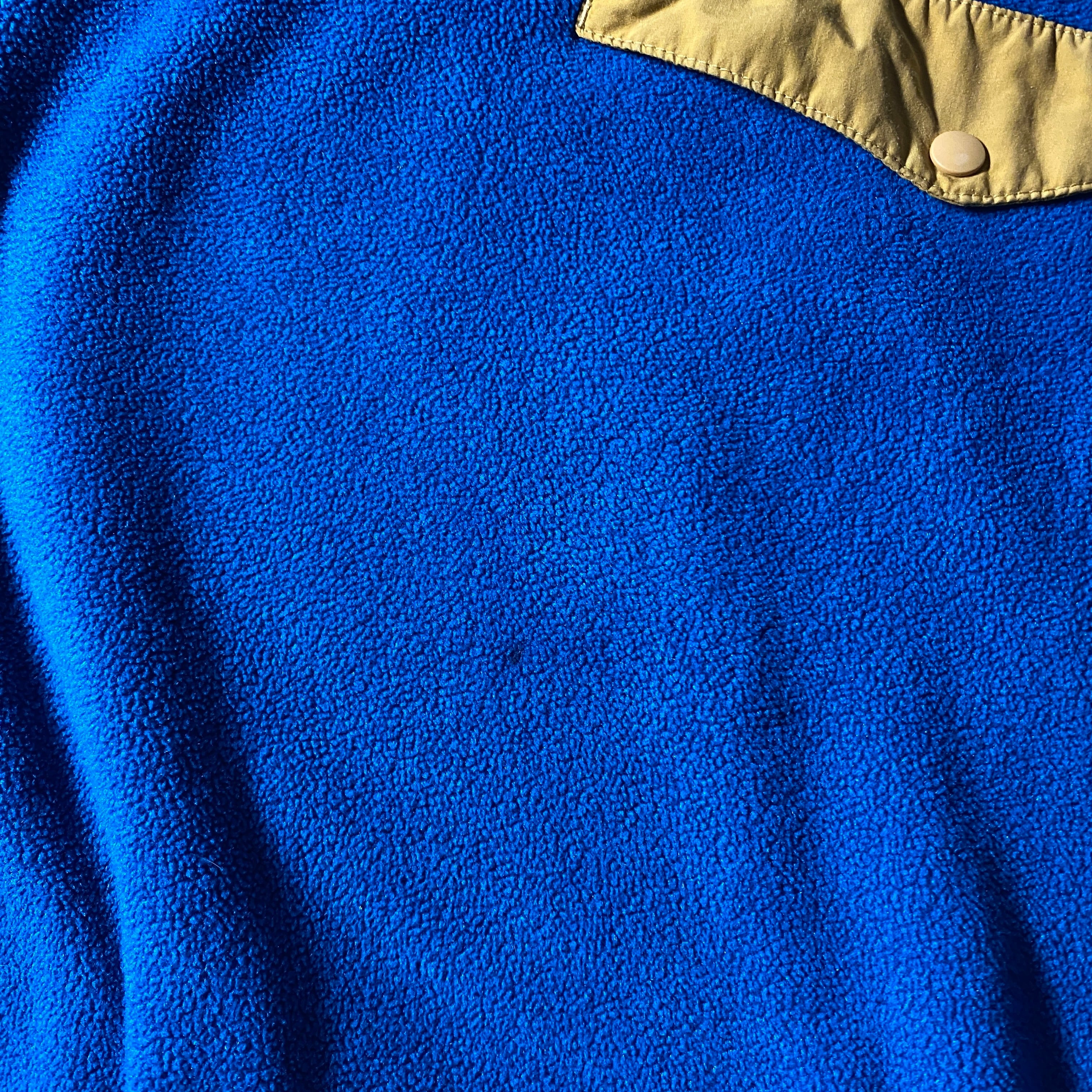 鮮やかなブルーボディにイエロートリムが効いた、パタゴニアらしいクラシック配色のシンチラスナップT。1985年に登場したシンチラフリースは軽量で暖かく乾きやすい素材としてクライマーやバックパッカーに支持され、アウトドアウェアの定番として長年作られ続けている名作です。本個体はフィールドで使い込まれた雰囲気が残るリアルなコンディションで、補修跡やダメージも含めてギアとしてのストーリーを感じさせる一着。デニムやミリタリーパンツに合わせれば、まるで長年旅を共にしてきた相棒のような存在感を放ちます。