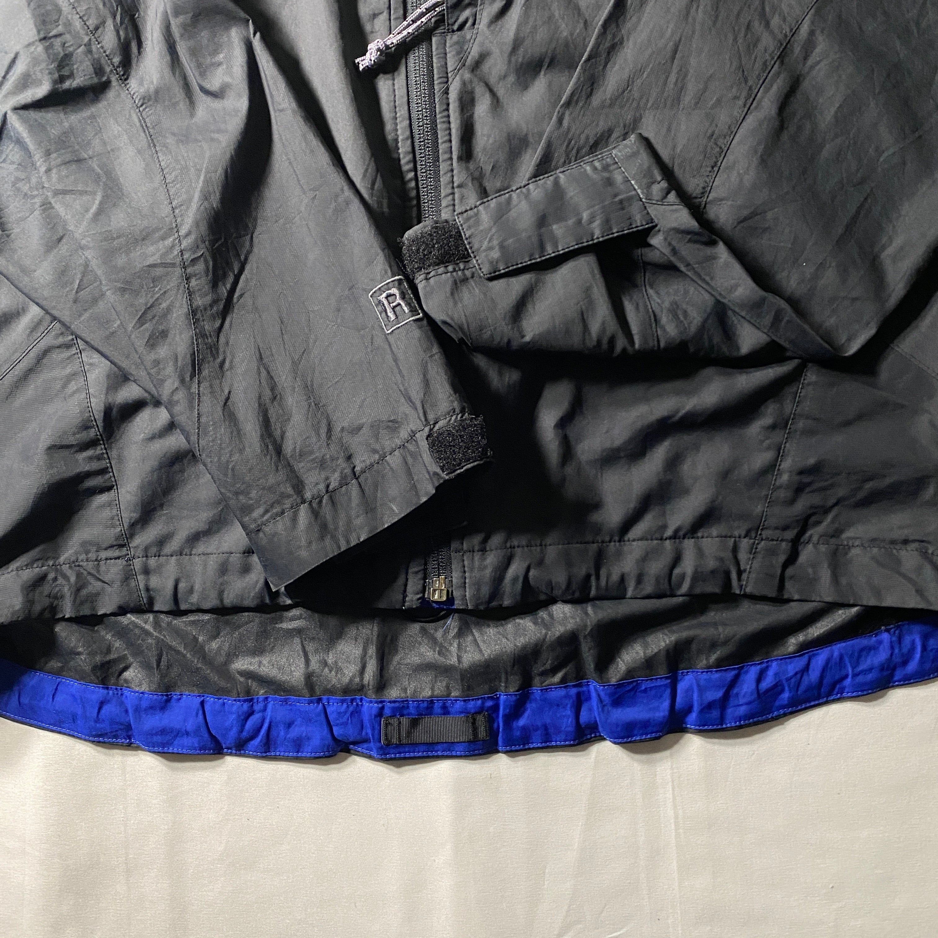 2000年代初期Patagoniaのエッセンシャルジャケット。軽量ナイロンシェルに防水透湿メンブレンを組み合わせたアルパイン向けシェルで、シンプルなデザインながらクライミングやバックカントリーでの実用性を重視したモデル。チャコールグレーのボディにブルーのアクセントが入る配色は当時のパタゴニアらしいテック感のある仕上がり。機能重視のミニマルな一着で、山でも街でも“必要なものだけを残した”まさにエッセンシャルなシェルジャケットです。