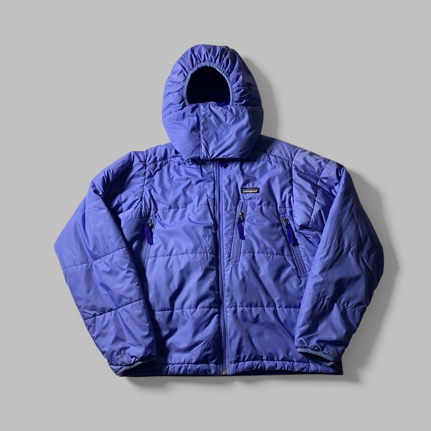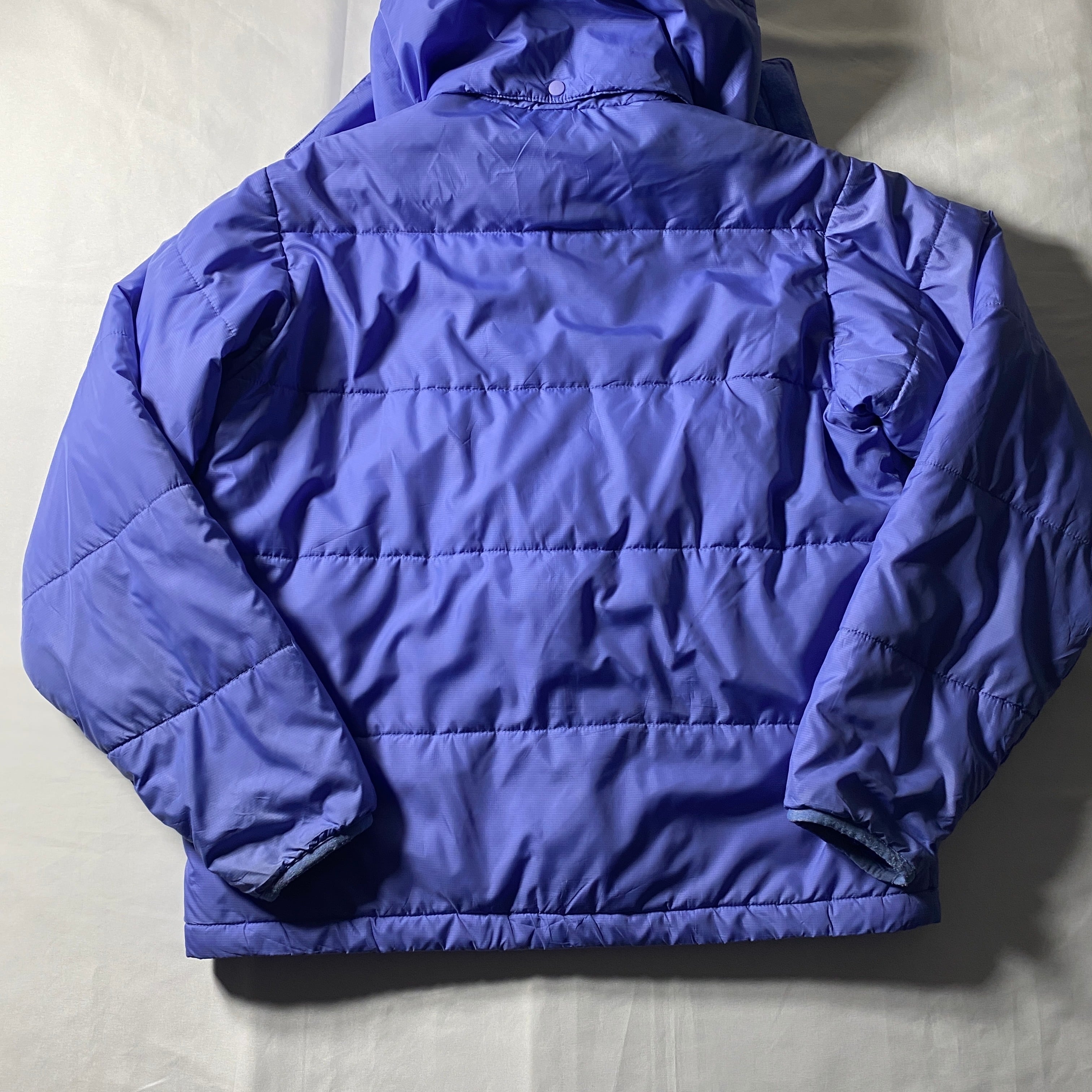 2002年製Patagoniaのパフジャケット。軽量ナイロンシェルに化繊インサレーションを封入した保温性の高いモデルで、濡れても暖かさを維持できるアルパイン向けジャケットとして人気を集めたシリーズです。深みのあるパープルカラーは当時のパタゴニアらしいアウトドアカラーで、フード付きの立体的なデザインも特徴。軽量ながらしっかり暖かく、街でも山でも活躍する“冬の頼れる相棒”のような一着です。