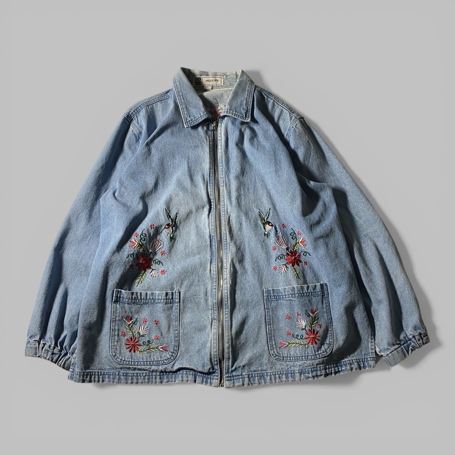 胸元とポケットに施されたハチドリと花の刺繍が目を引く、90年代らしいデザインのデニムジャケット。ハチドリは北米では幸運や希望の象徴として知られ、花々と組み合わせたモチーフは当時のカジュアルウェアで人気の高かった自然モチーフの一つ。ライトオンスのデニムにゆったりしたシルエットで、シャツ感覚でも羽織れる軽快な着心地。シンプルなデニムジャケットに飽きた人にこそ刺さる、ちょっとした遊び心とアート性を感じさせる一着です。