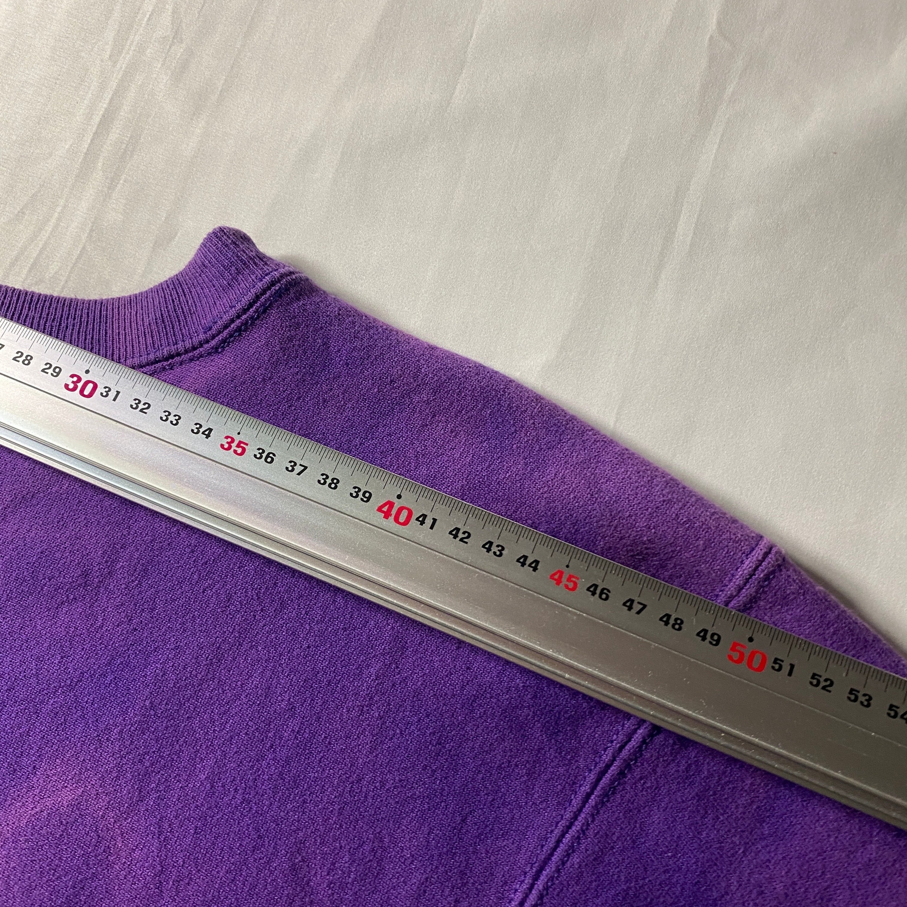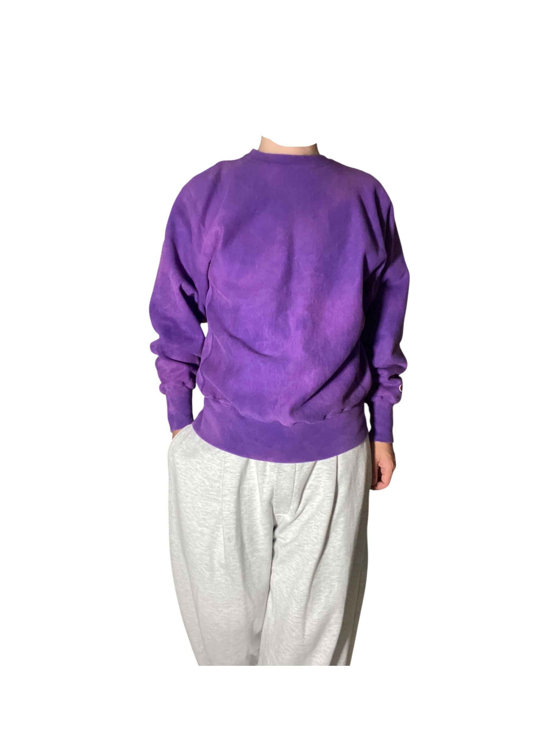 Championの名作Reverse Weaveスウェット。1934年に開発されたこの製法は、生地を横向きに使うことで縦縮みを防ぐという、スウェット界では革命的な構造として誕生しました。本来はカレッジアスリートのトレーニングウェアとして作られた背景を持ち、両脇のリブパネルが可動域を広げる機能的デザインも特徴。この個体は90年代らしい深みのあるパープルカラーが魅力で、無地ながら存在感のある一枚。デニムと合わせれば90年代のストリート感、スラックスと合わせれば大人の抜け感が出る、静かに主役を張れるスウェットです。