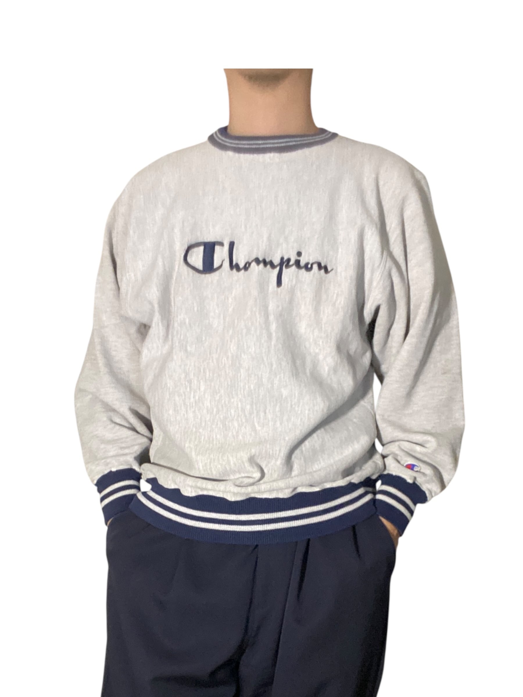 胸元に入るChampionのスクリプトロゴ刺繍を主役にした90年代の定番デザイン。グレーボディにネイビーラインのリブという王道のアメリカンアスレチック配色で、ChampionらしいReverse Weave特有のタフなボディとゆったりしたシルエットが魅力です。ロゴ付近と袖口にダメージはありますが、それも含めてヴィンテージらしい雰囲気を楽しめるポイント。新品のきれいさよりも“長年付き合ってきた相棒感”を味わえる一着で、むしろこのくらいのヤレ具合の方が古着はよく似合います。