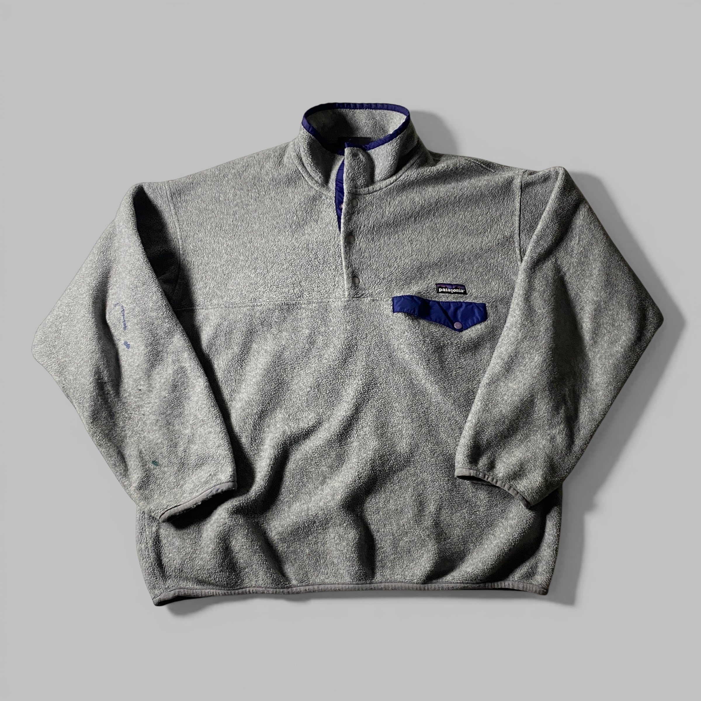 パタゴニアの定番フリース、シンチラスナップT。胸元のロゴに描かれた山並みはブランド名の由来となった南米パタゴニア地方、フィッツロイ山群をモチーフにした象徴的デザイン。軽くて暖かいシンチラフリースは1980年代に登場して以来アウトドア界のスタンダード素材となり、90年代には街着としても完全に定着。落ち着いたグレーにブルーのポケットフラップがアクセントになったクラシック配色で、シンプルながら妙に雰囲気のある一枚。袖のインク跡すら「山帰りの勲章」に見えてくるのが、この服の面白いところです。