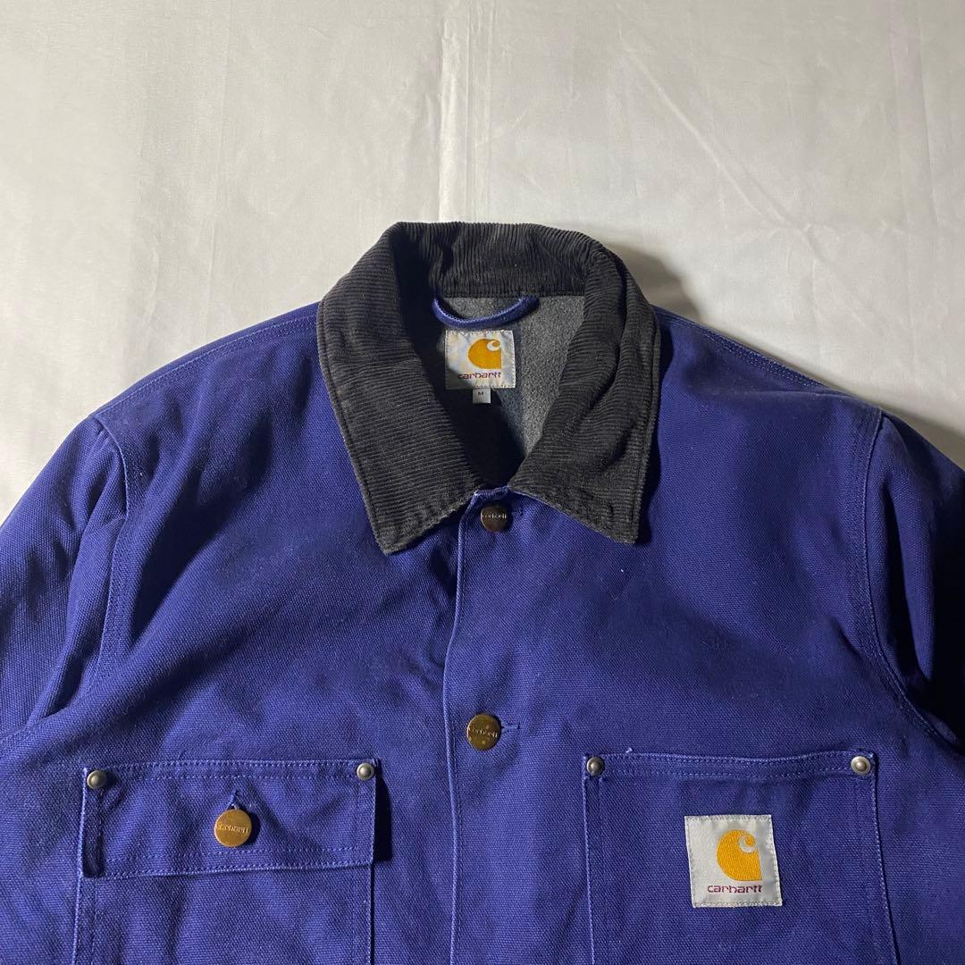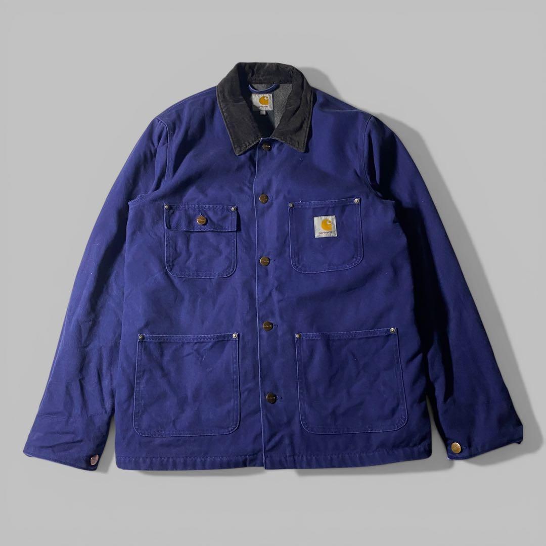 Carharttの定番ワークジャケットとして長年愛されてきたChore Coat。19世紀末のアメリカで鉄道員や農夫の作業着として生まれたワークウェアの王道モデルで、フロントの大きなパッチポケットとコーデュロイ襟が象徴的なディテールです。タフなダックコットンに裏地ブランケットライニングを備え、無骨さと実用性を両立。鮮やかなブルーカラーはヨーロッパのワークジャケットを思わせる雰囲気もあり、無骨なのにどこか洒落ている絶妙なバランス。作業着として生まれながら、今ではカフェでも古着屋でもしっくり馴染む、まさに“働き者の洒落者”な一着です。