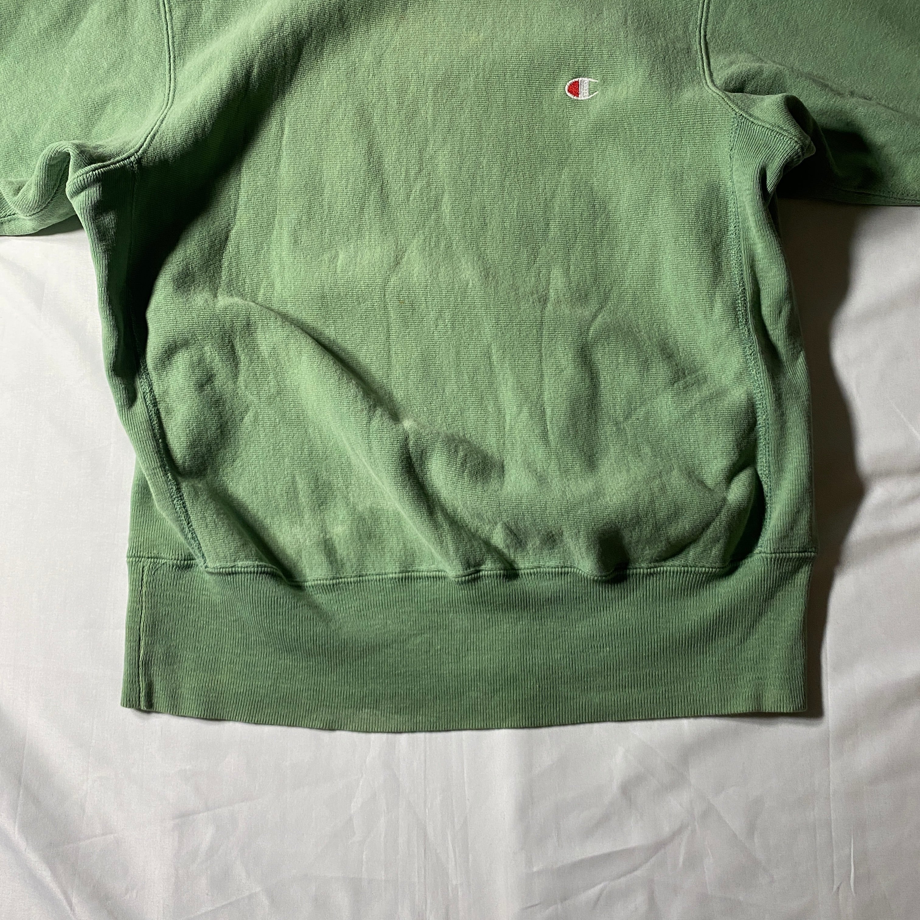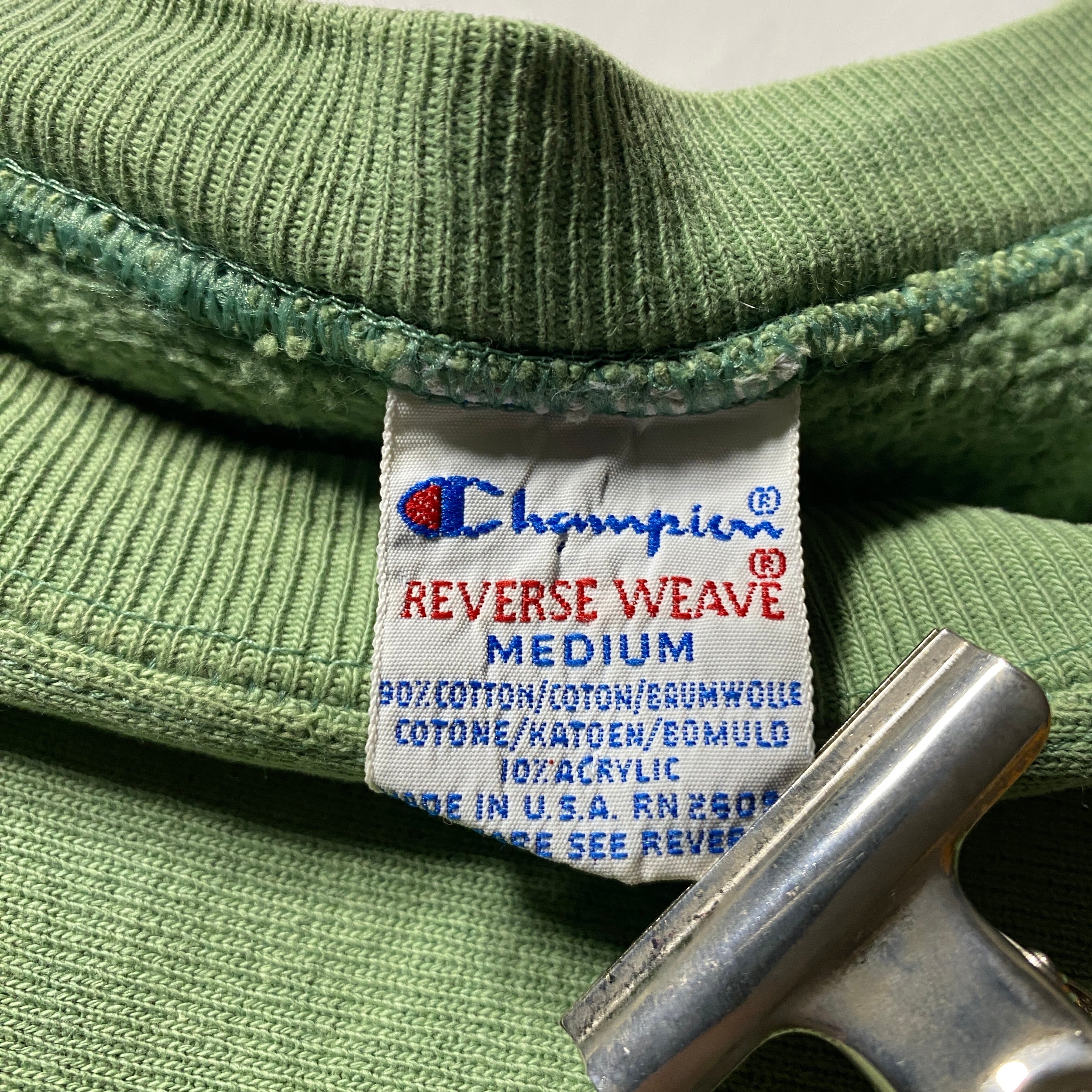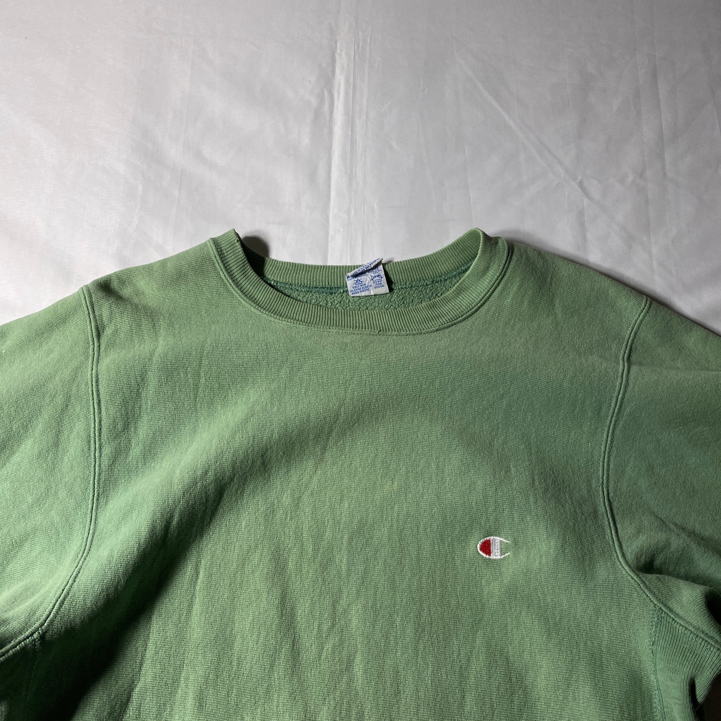 Championを代表する名作スウェット「Reverse Weave」。1930年代に洗濯による縦縮みを防ぐため、生地を横向きに使用するという革新的な製法で誕生し、カレッジアスレチックやアメリカンカルチャーと共に愛されてきたモデルです。両脇のリブパネルは可動域を広げる実用ディテールで、まさに機能美の象徴。爽やかなグリーンカラーにワンポイントのCロゴという王道の組み合わせは、古着好きなら思わず頷く安定感。多少のシミやリペアも含めて、むしろ“ちゃんと働いてきました”と言わんばかりのヴィンテージらしい風格が漂う一着です。