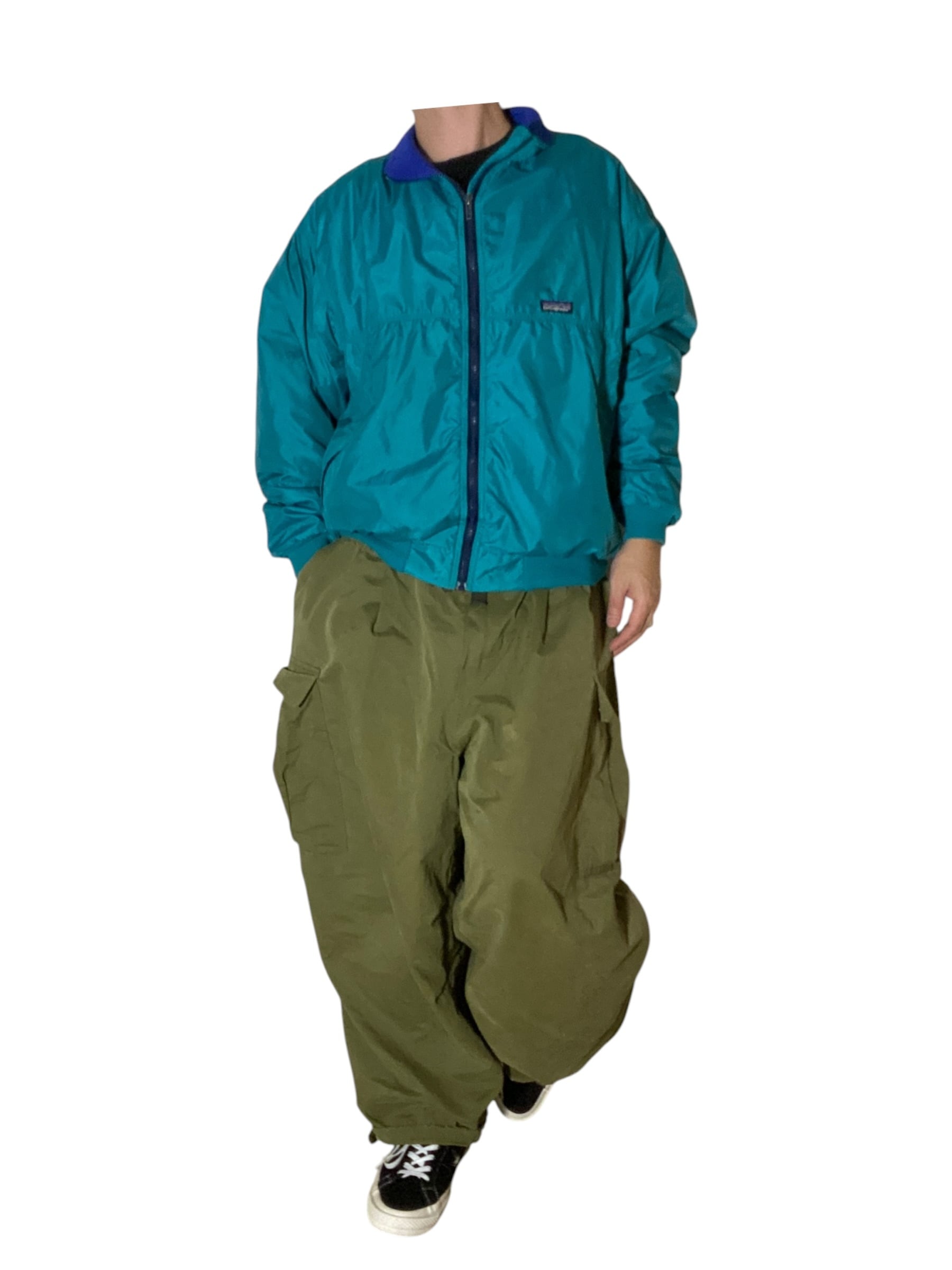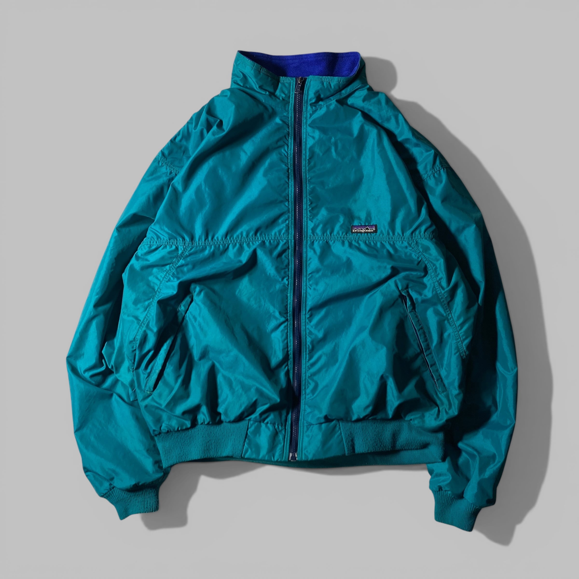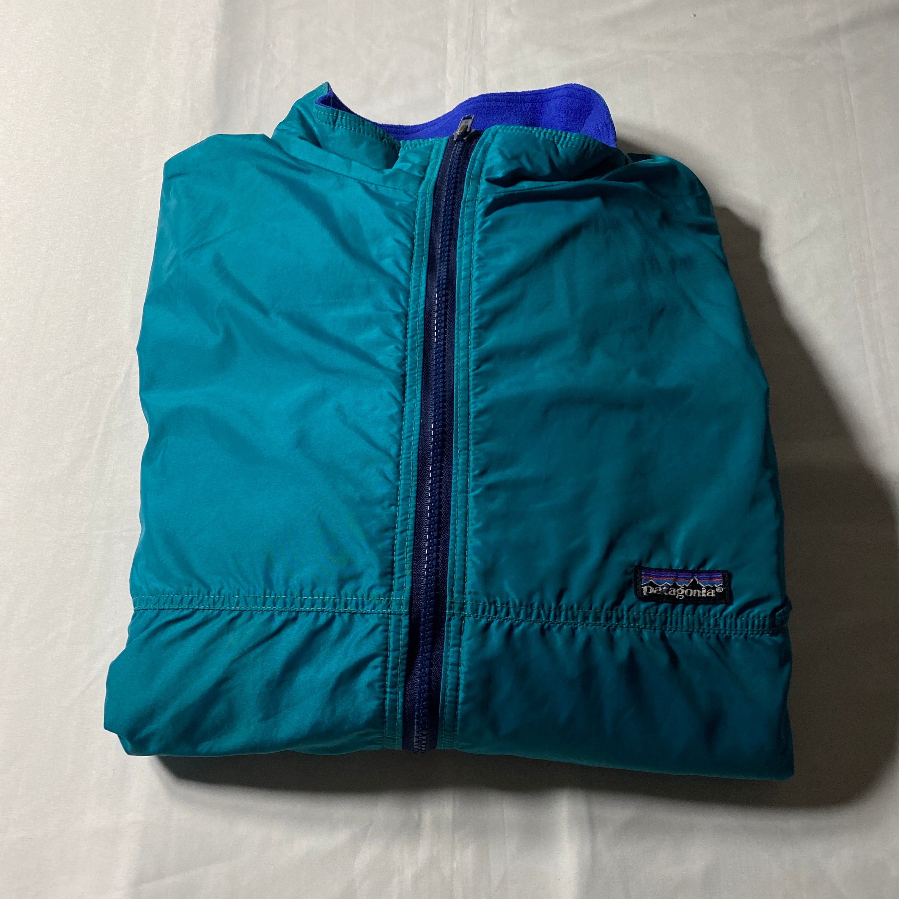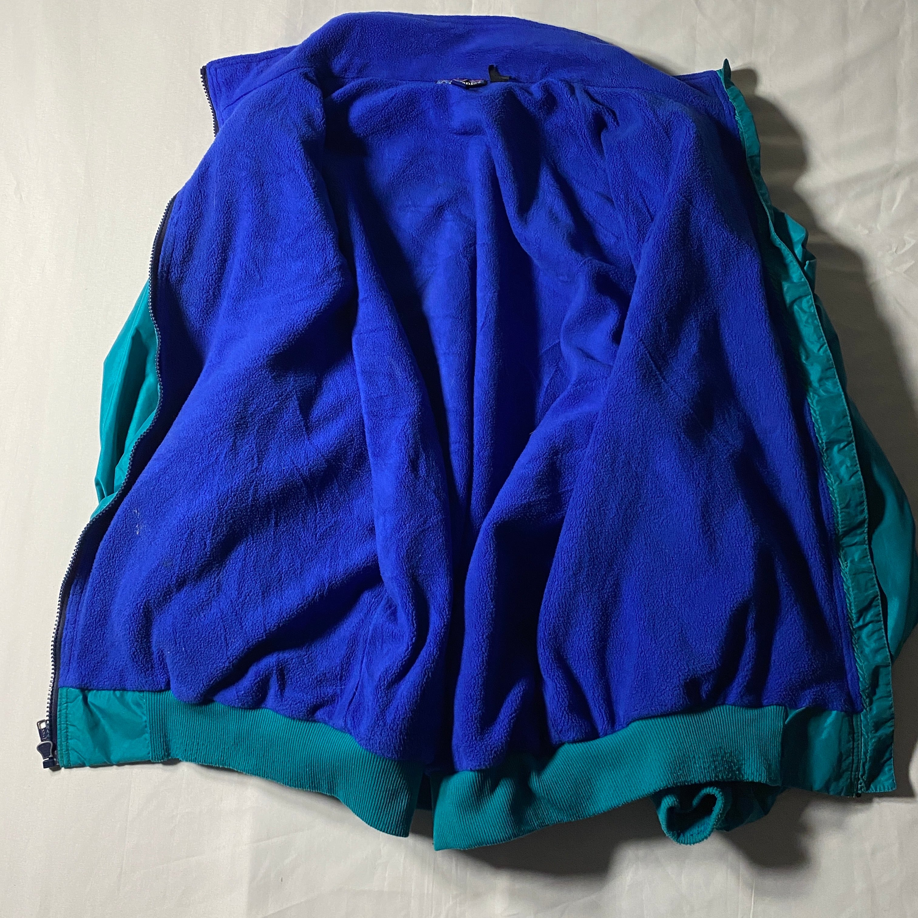 パタゴニアの定番シェルドシンチラは、ナイロンシェル×フリースライニングの黄金コンビで90年代アウトドアを象徴する一着。発色の良いグリーンに鮮やかなブルーフリースの組み合わせは、当時のパタゴニアらしい大胆なカラーセンスを体現しています。風をしっかり防ぎつつ内側は柔らかく暖かいという機能性はもちろん、タウンユースでも抜群の存在感。アウトドア帰りでも街に溶け込むどころか主役になる、そんな頼れる一枚です。