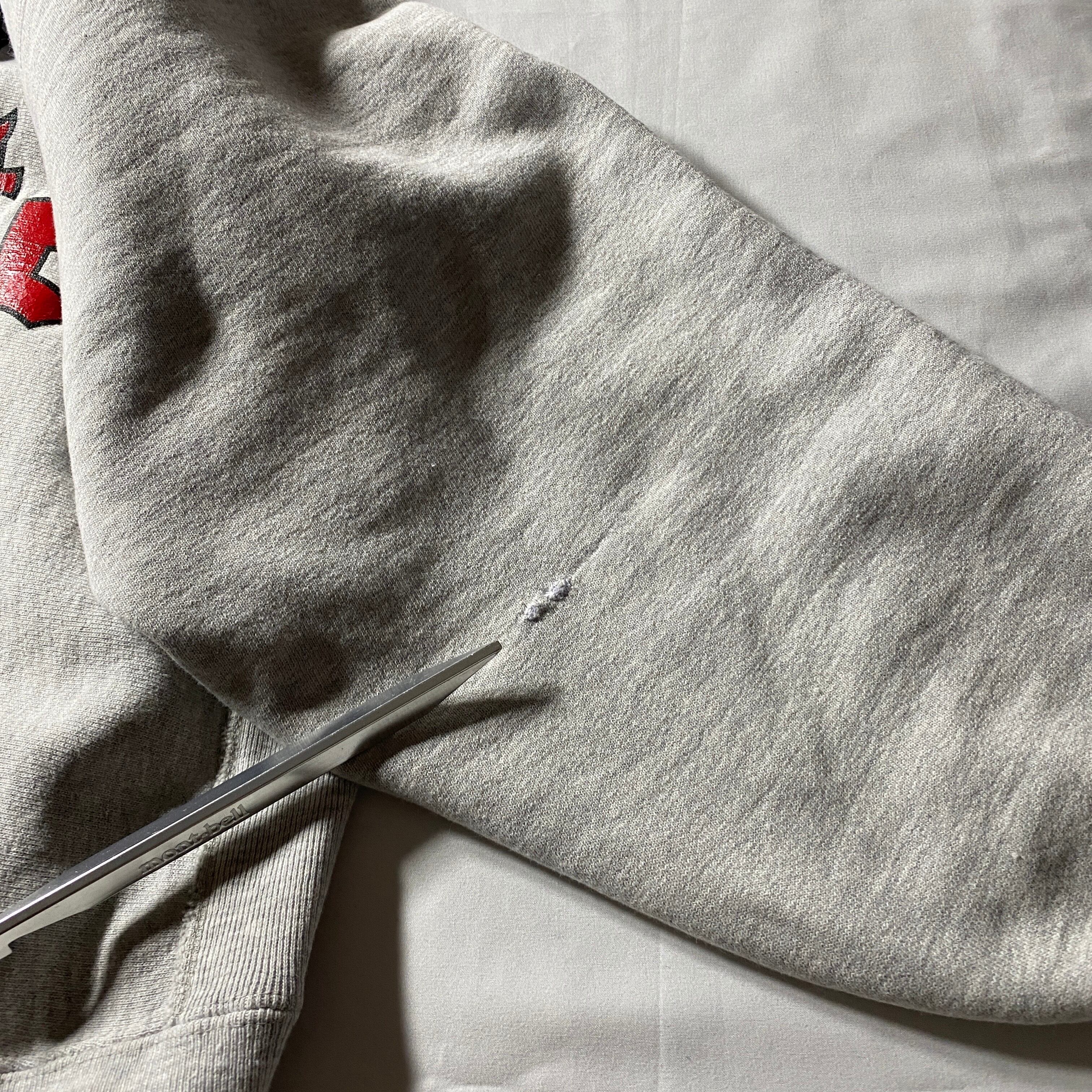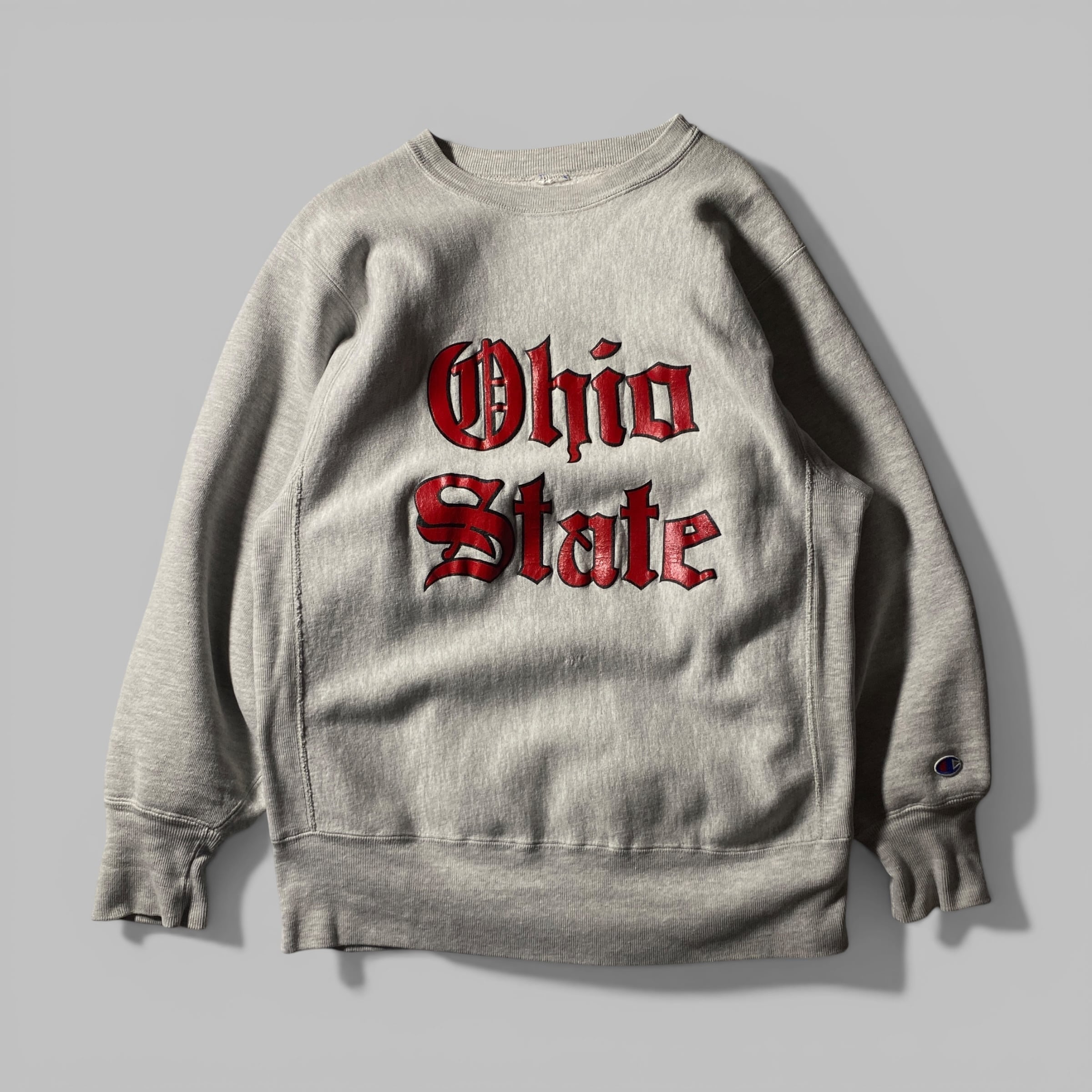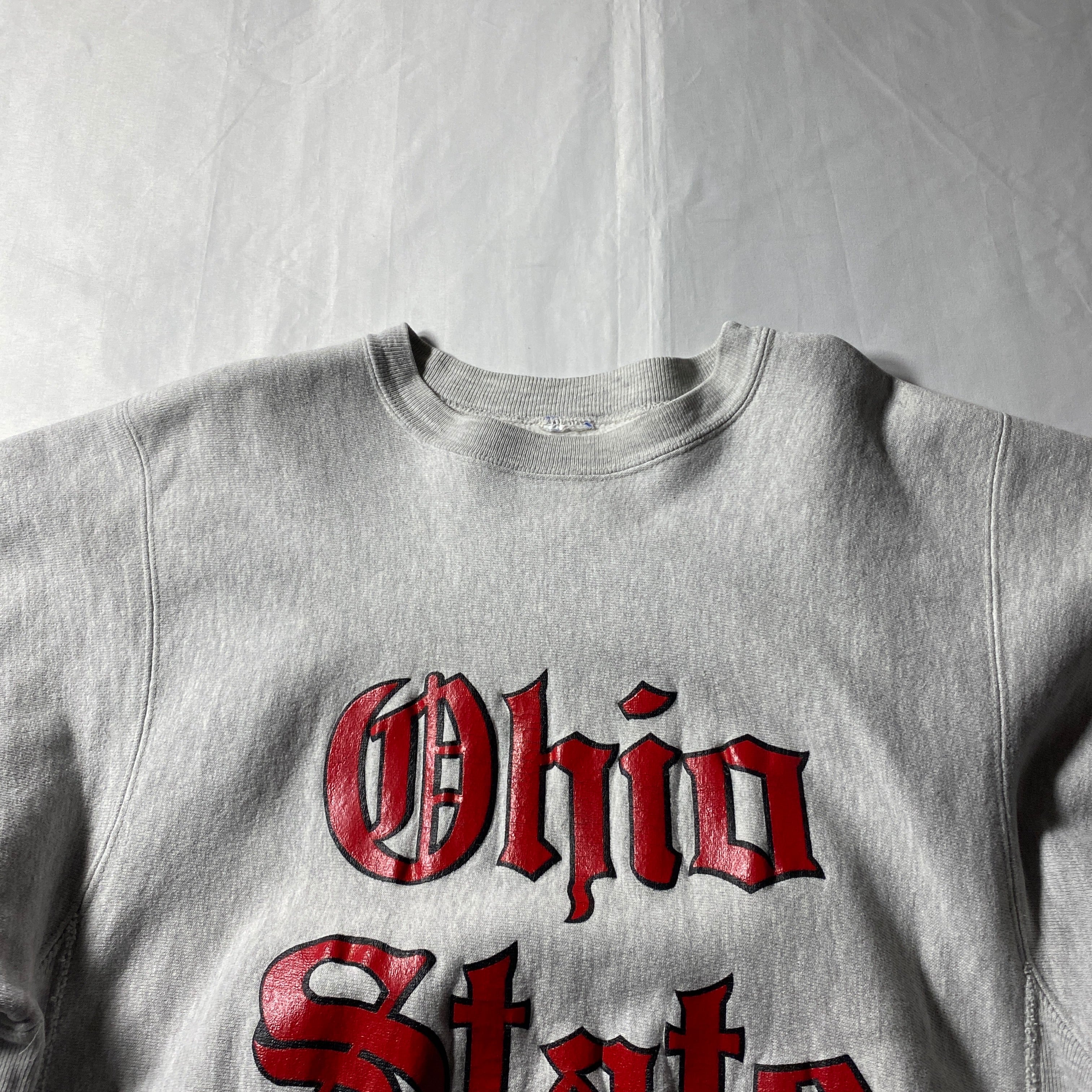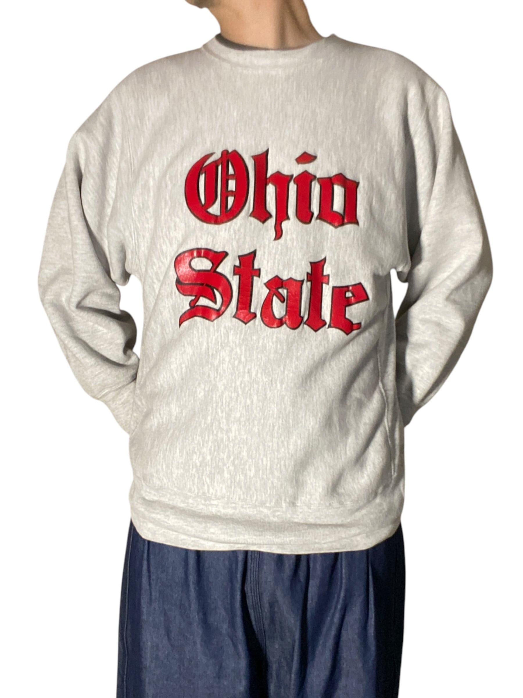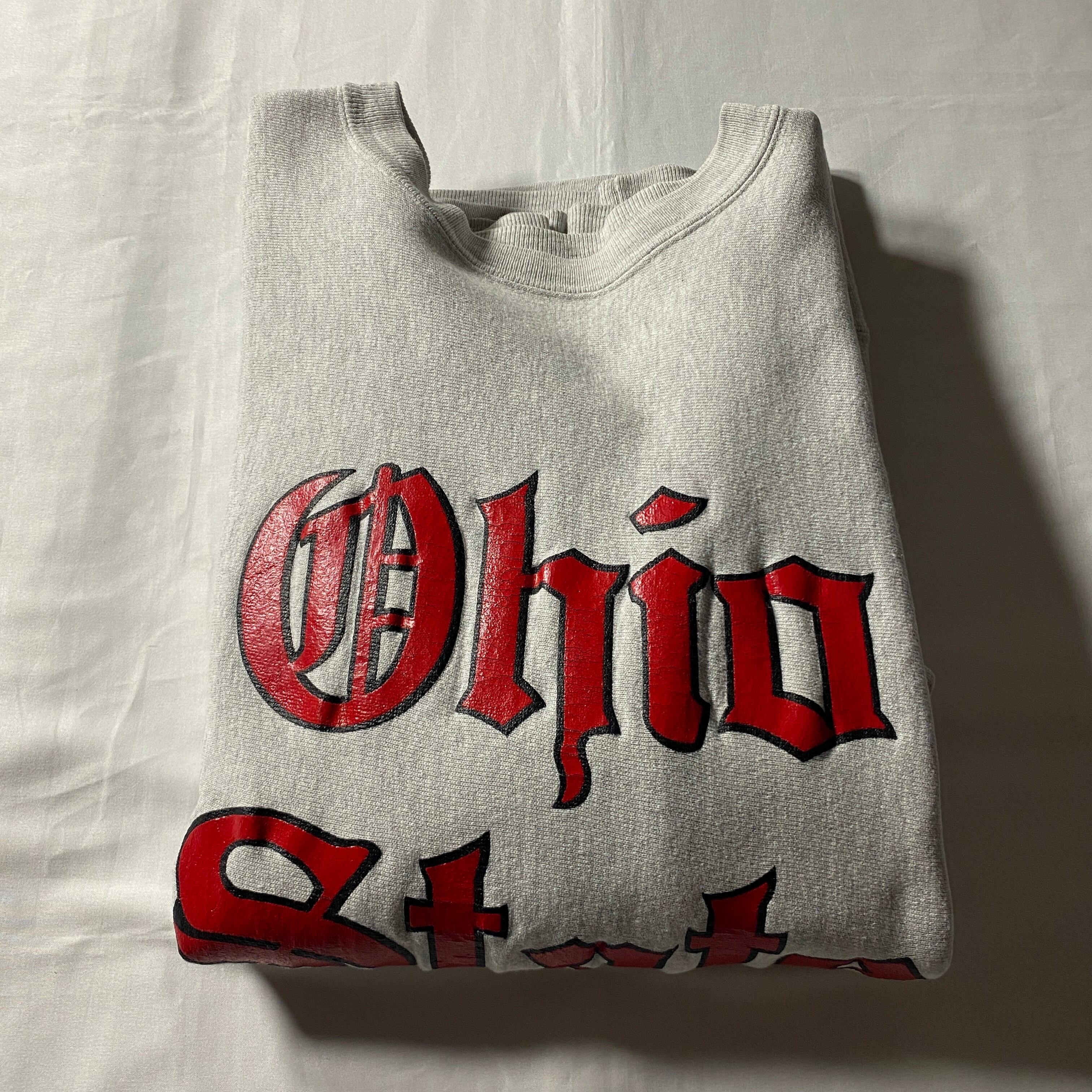 オハイオステート大学のカレッジスウェットでも人気の高いゴシック体ロゴ仕様。90年代リバースウィーブ特有の肉厚ボディに、ひび割れ気味のラバープリントがヴィンテージらしい雰囲気をしっかり演出。タグ欠損ながらディテールと縫製から当時物と判断できる一着で、むしろこの“抜け感”が古着好きには刺さるポイント。王道カレッジでも一歩差がつく、通好みのグッドフェード候補です。